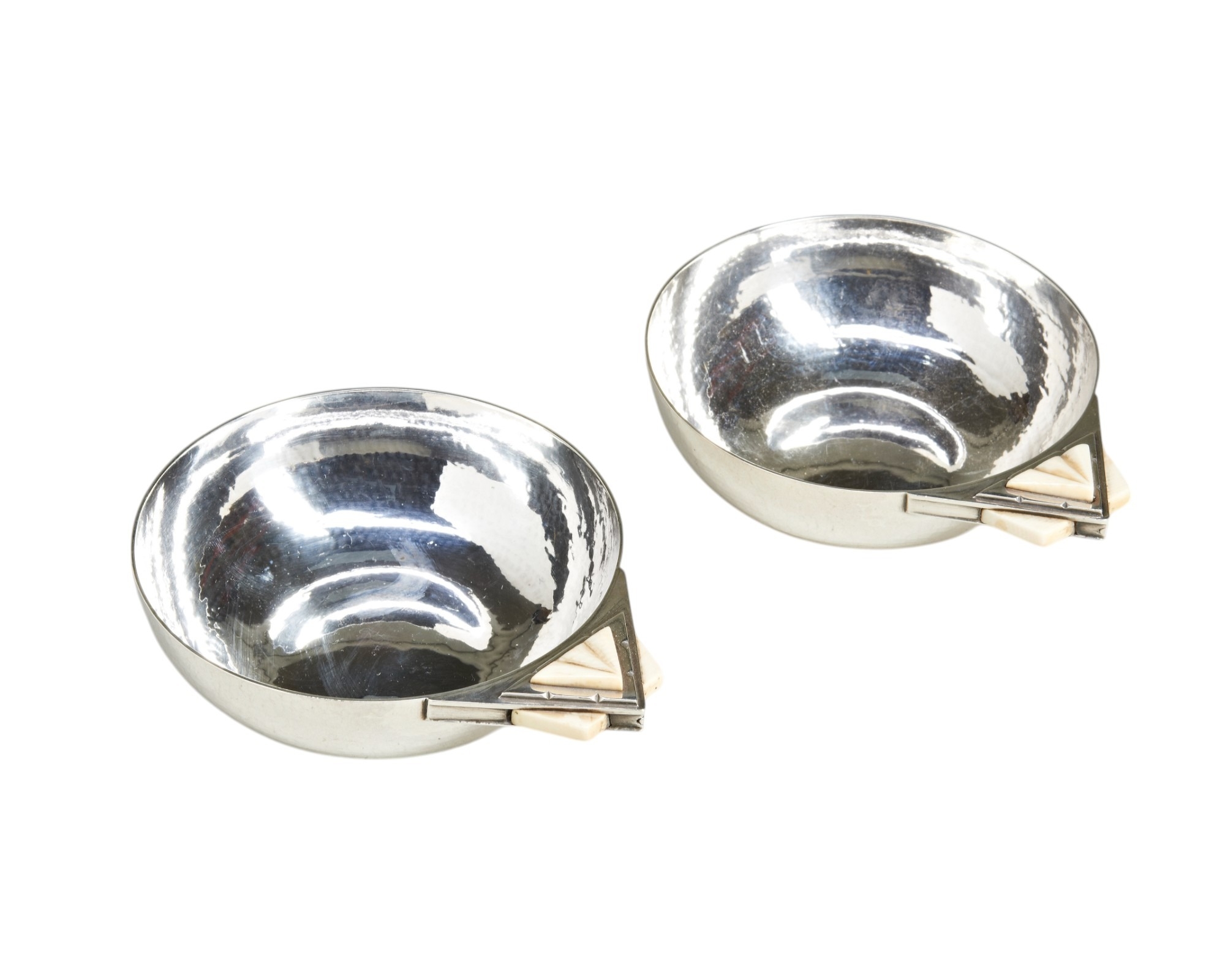 A pair of art deco handmade dishes with ivory handles. Each one fully marked for London 1931 along with a stamped facsimile signature of R.E.Stone.