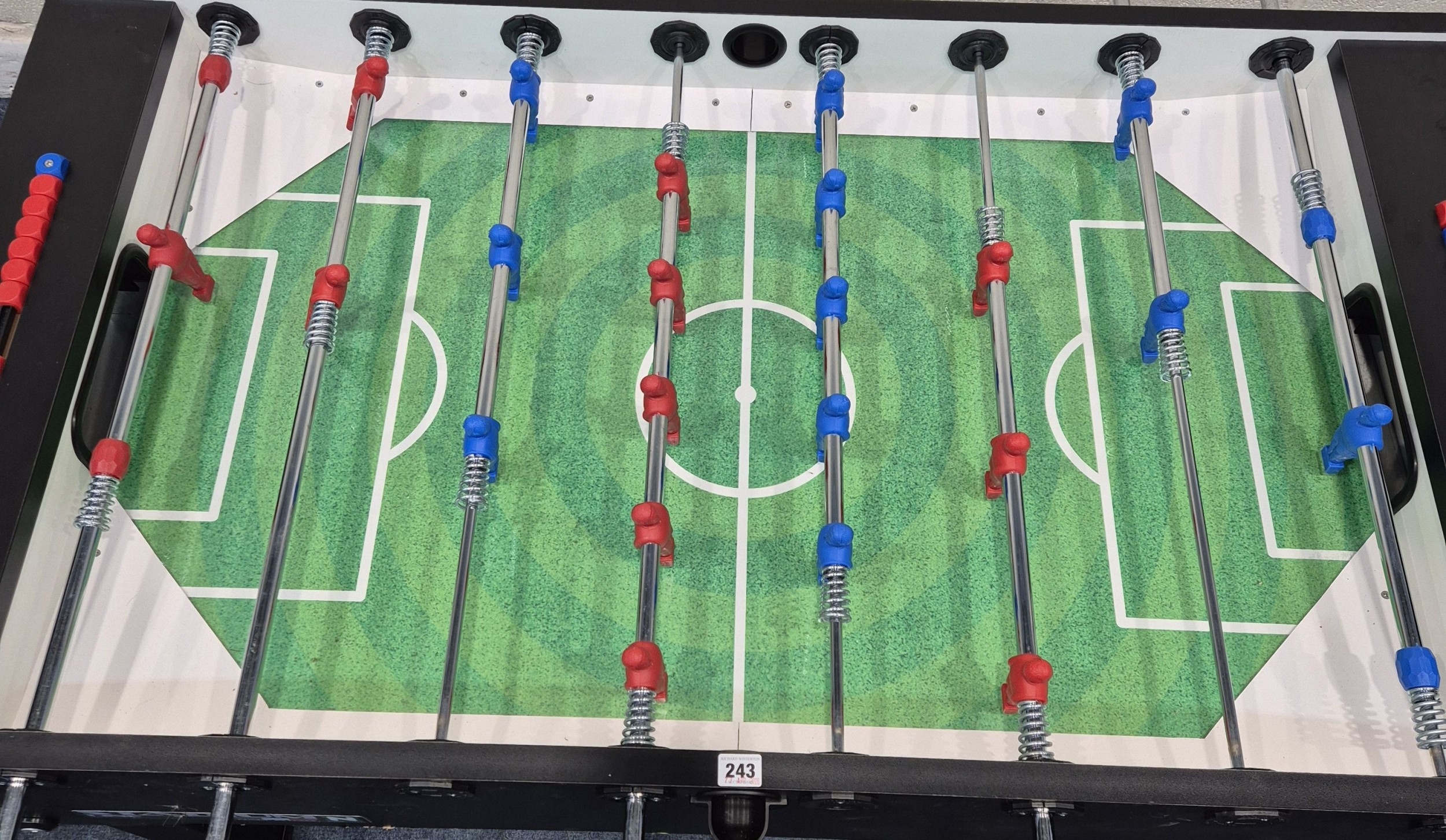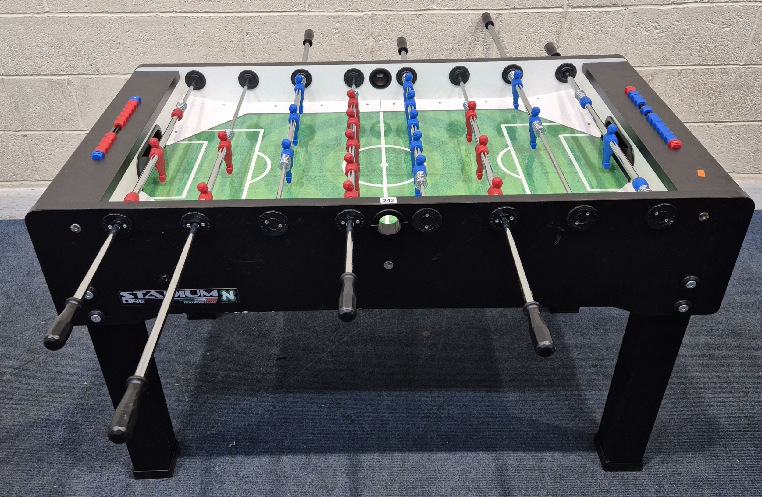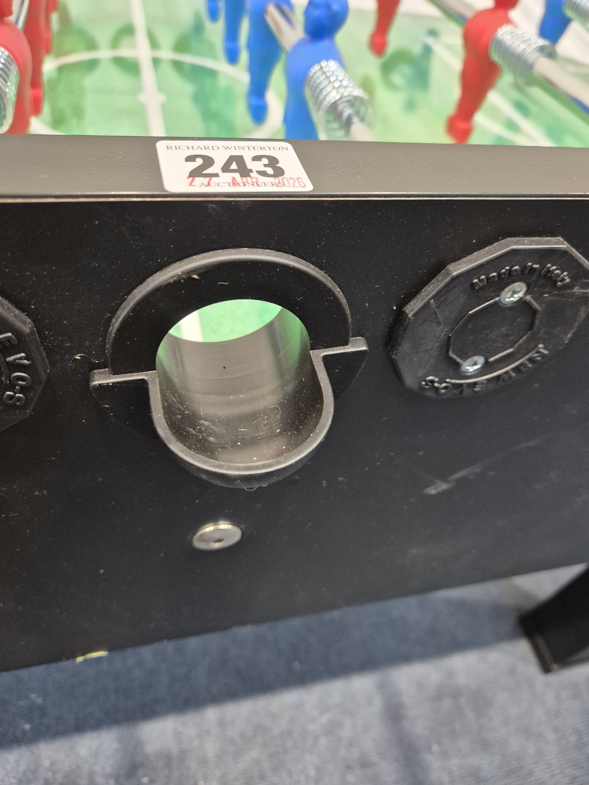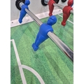 A NORDITALIA STADIUM LINE FOOSBALL TABLE, with red and blue player figures, sliding score system, and two ball slots, length 142cm x maximum depth 177cm, height 87cm, condition report: no balls, large cover present, general signs of usage