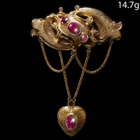 ANTIQUE VICTORIAN GARNET AND DIAMOND BROOCH. set with a large vibrant cabochon garnet with a diamond in the center, with a suspending garnet and diamond drop. with rope twist surround and beading work. L 6.5 cm. W 4.6 cm. 23.6 grams.
