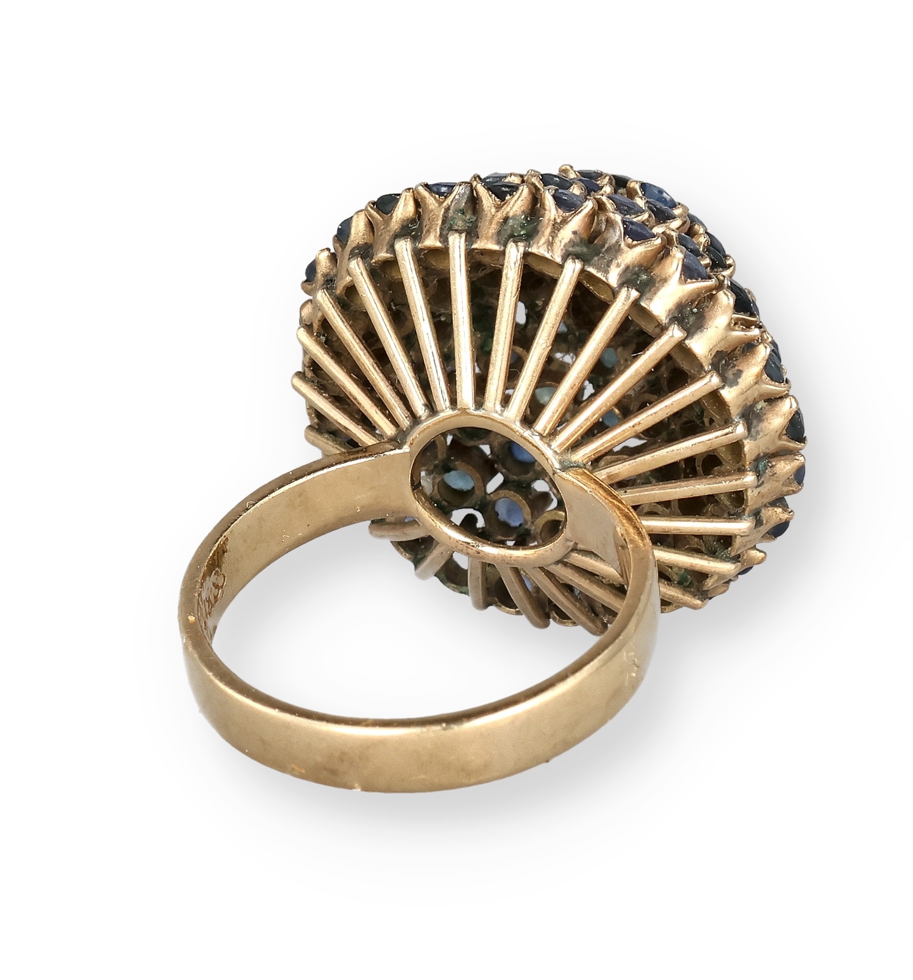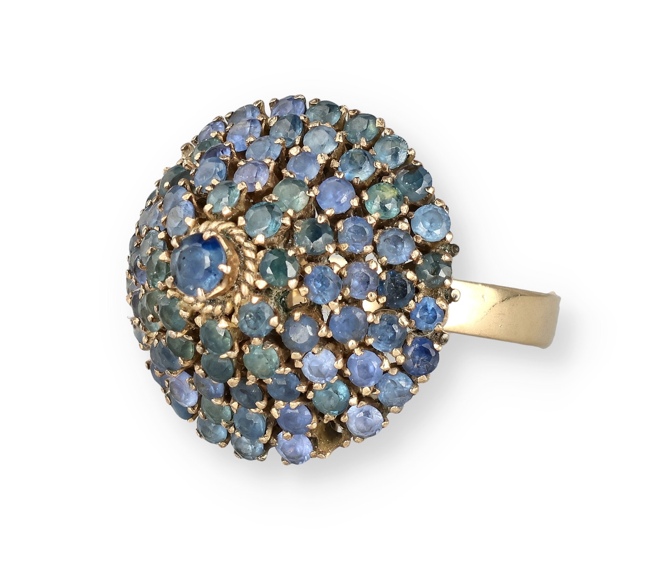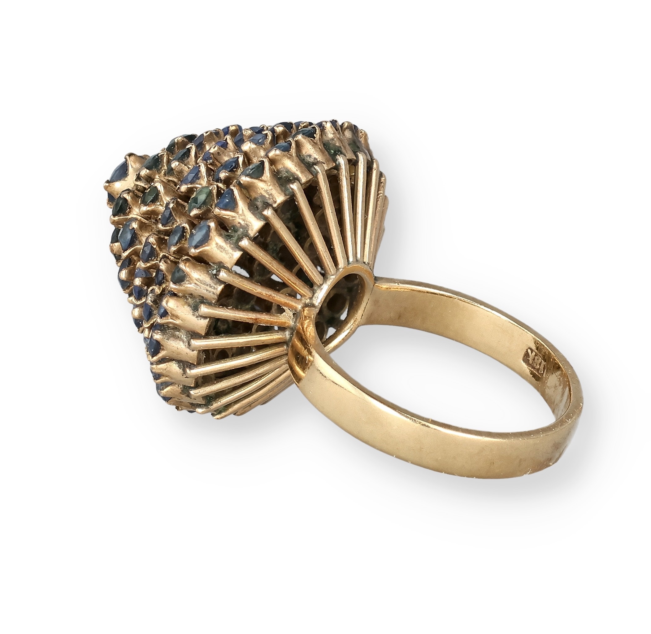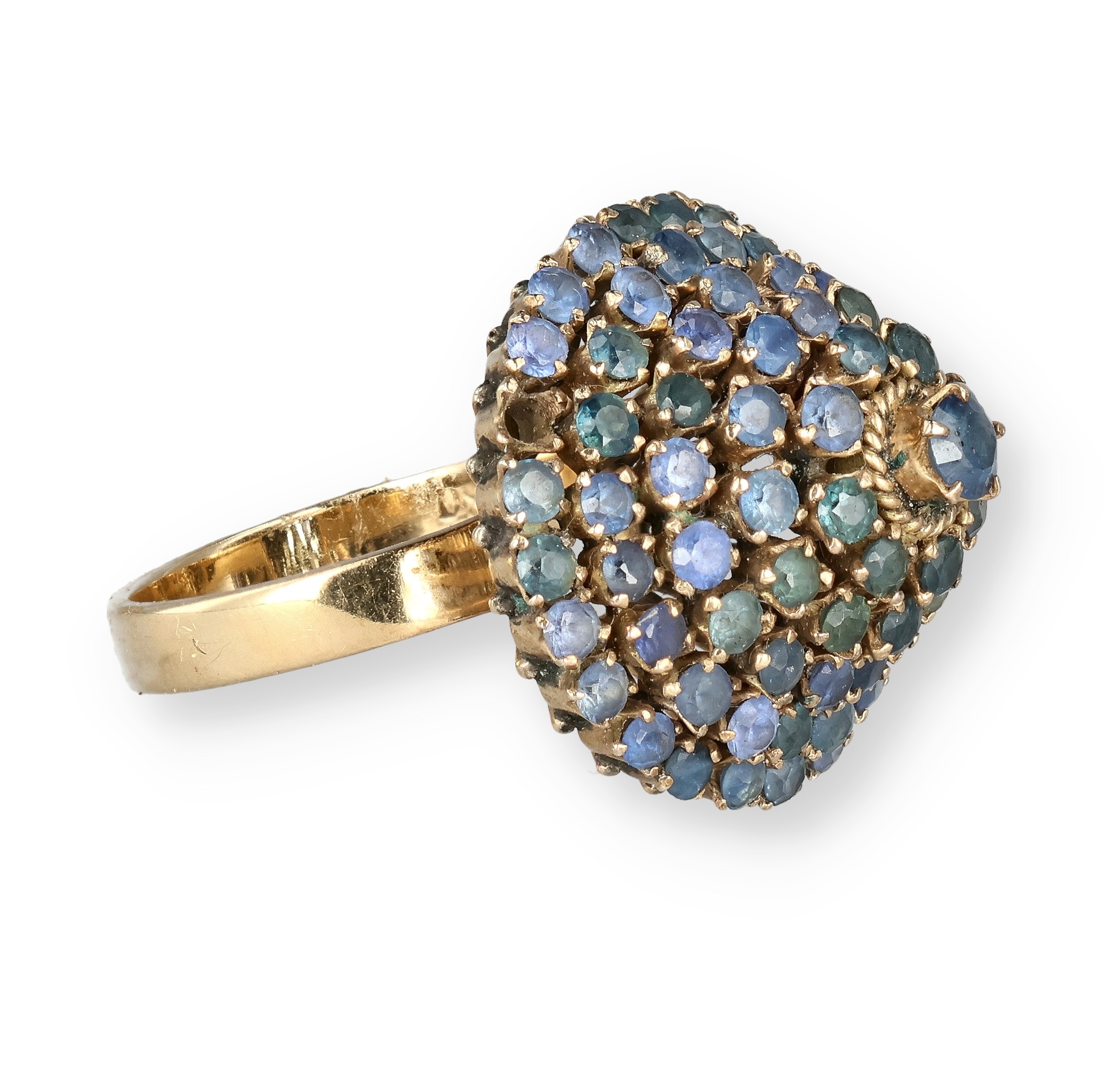 AN 18 CARAT GOLD BOMBÉ RING, CLAW SET WITH FIVE ROWS OF SAPPHIRES