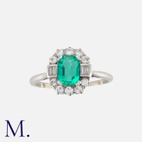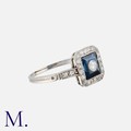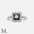 An Art Deco Sapphire and Diamond Cluster Ring in platinum, comprising a drilled square cut sapphire, set to the centre with a round cut diamond, all within a border of further round cut diamonds, with rose cut diamond accents to the shoulders. Unmarked, tests indicate platinum.