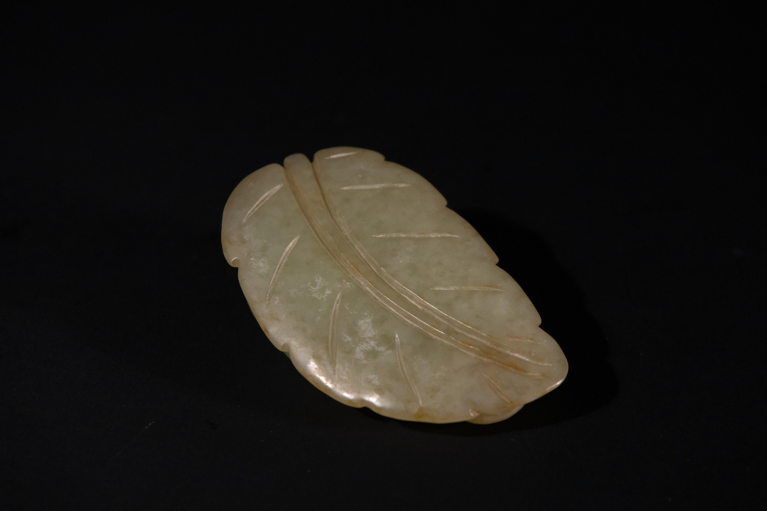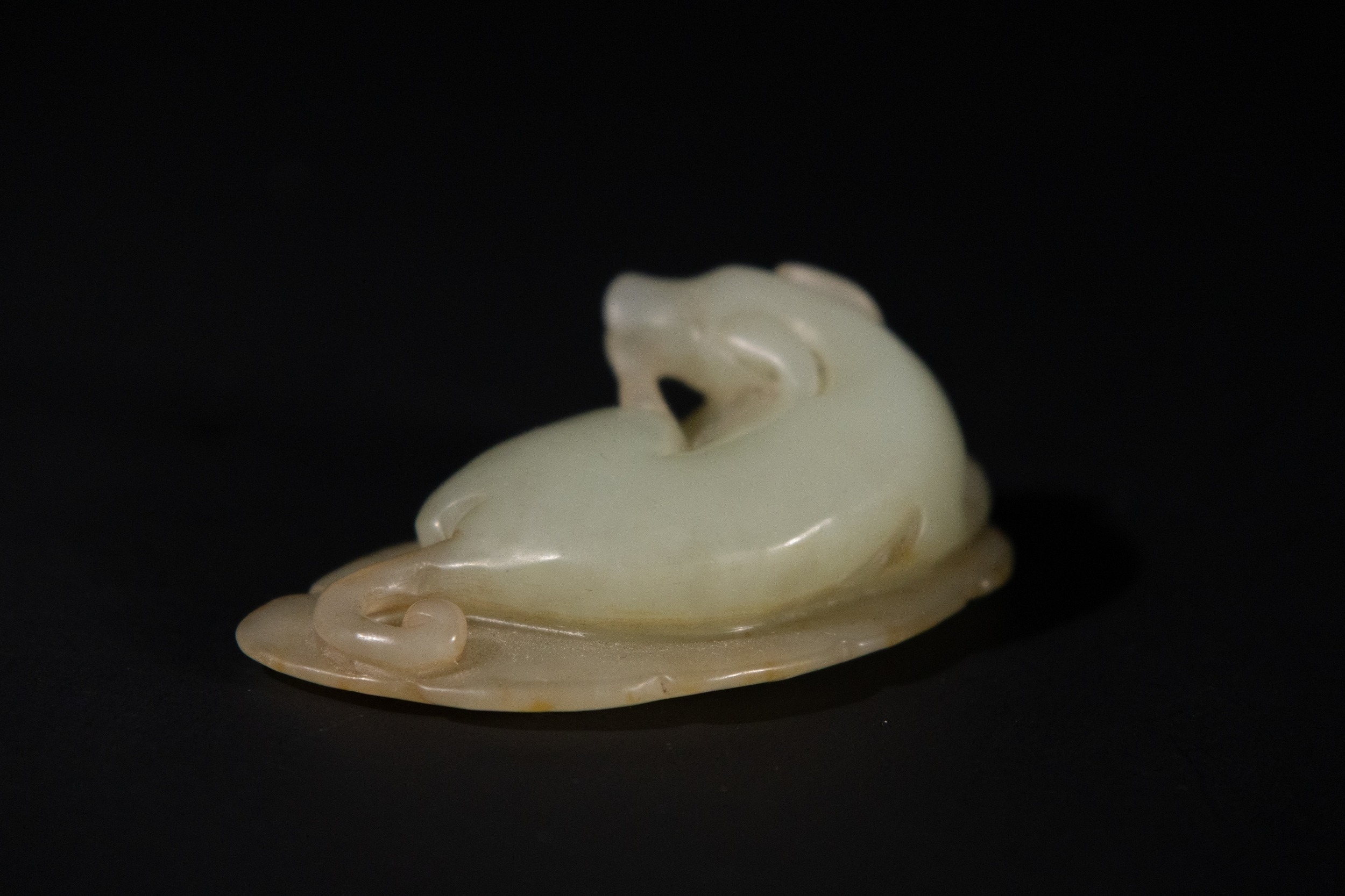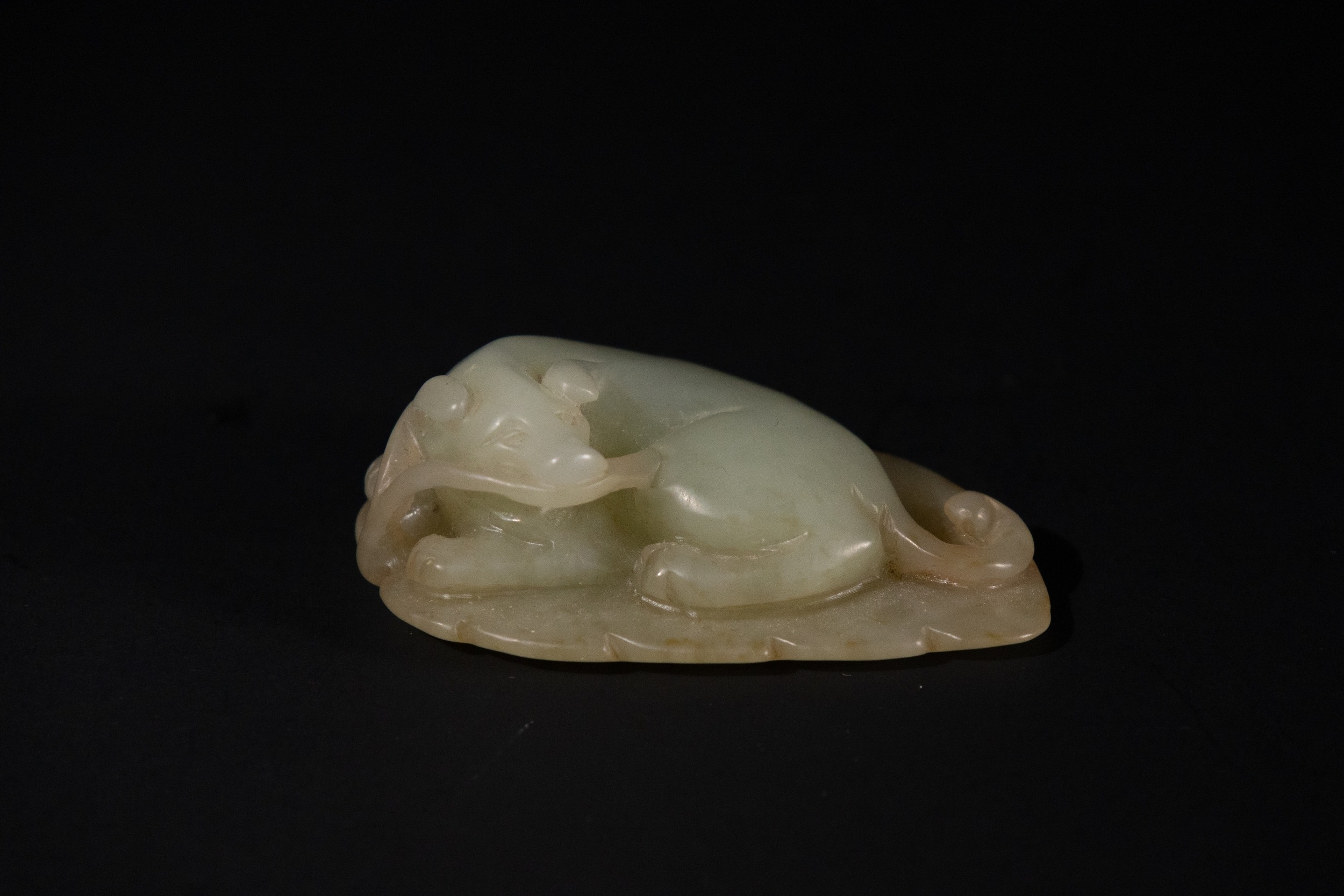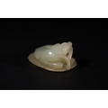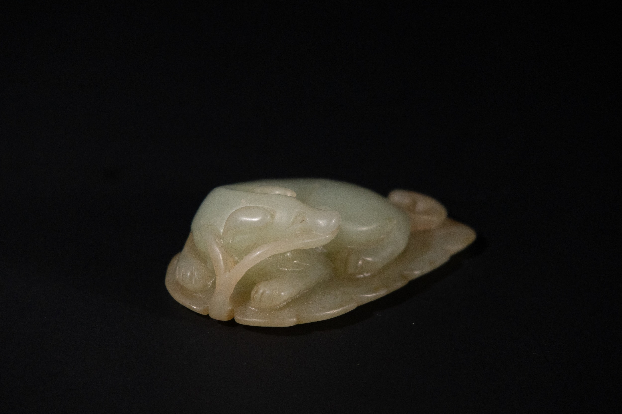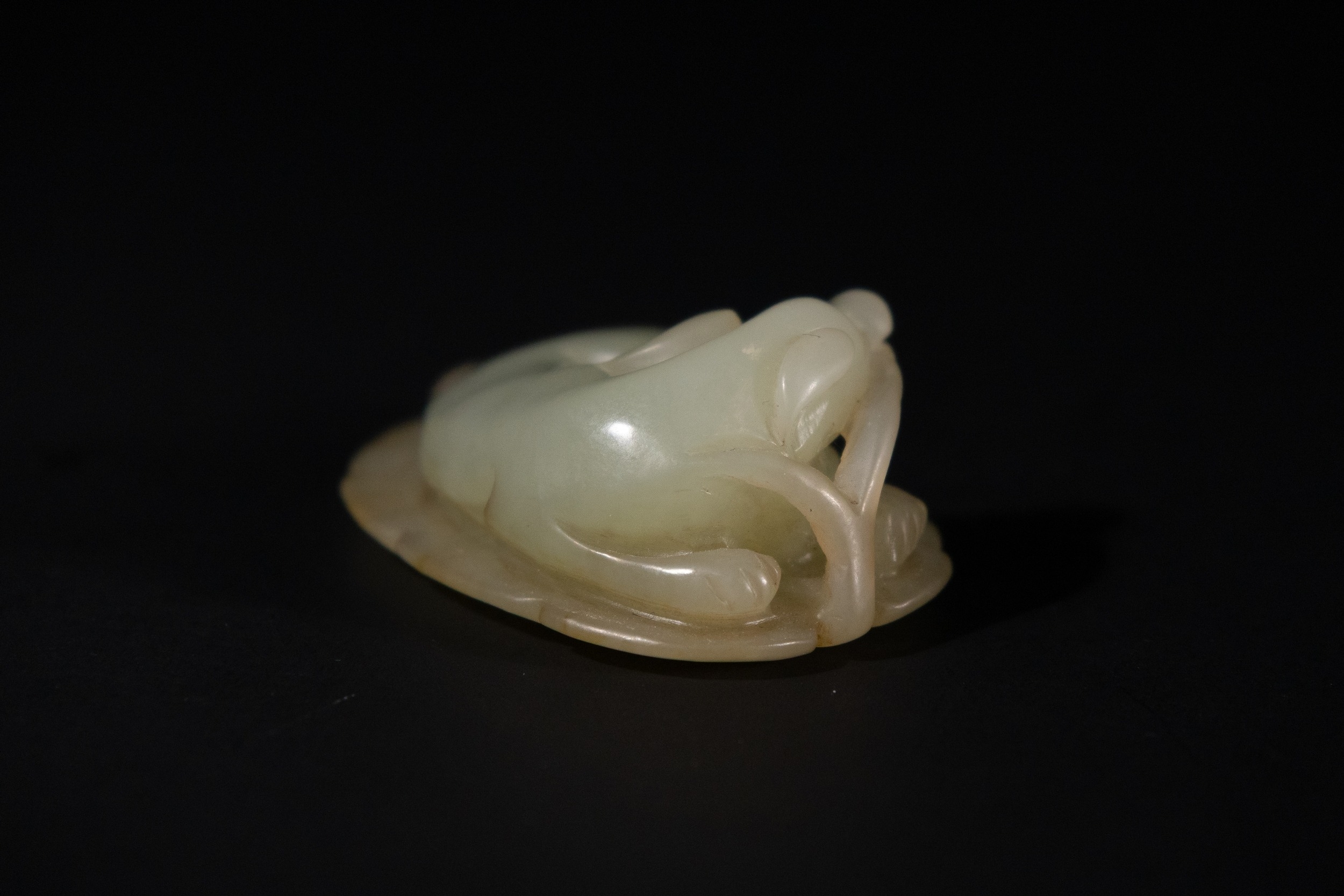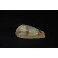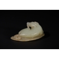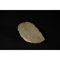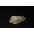 A Chinese Celadon Jade Carving of a Recumbent Animal on a Leaf.