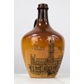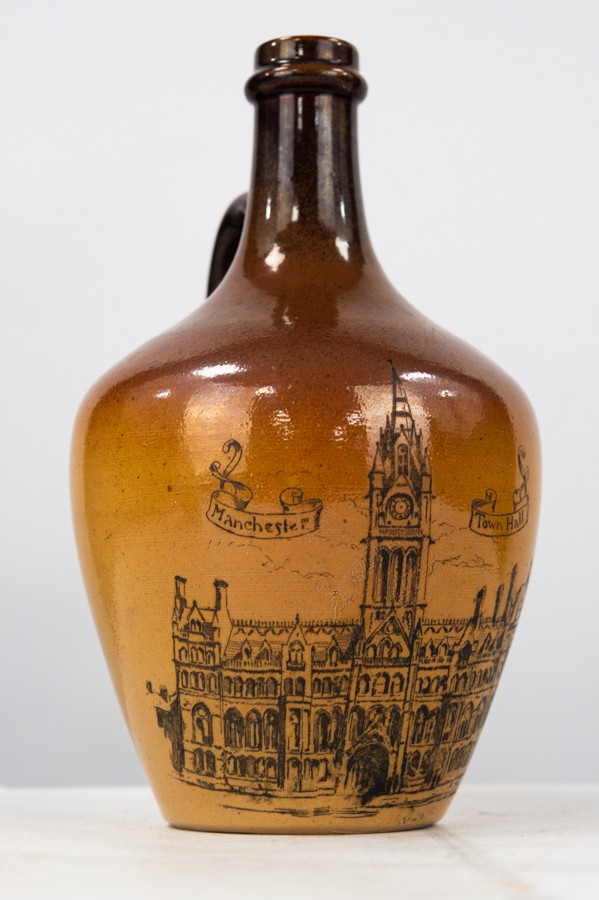 DOULTON LAMBETH FOR GREATOREX BROTHERS, ADVERTISING SALT GLAZED STONEWARE FLAGON PRINTED WITH A VIEW OF ‘MANCHESTER TOWN HALL', of typical form with loop handle, 7 ¾” (19.7cm) high, impressed marks to the base