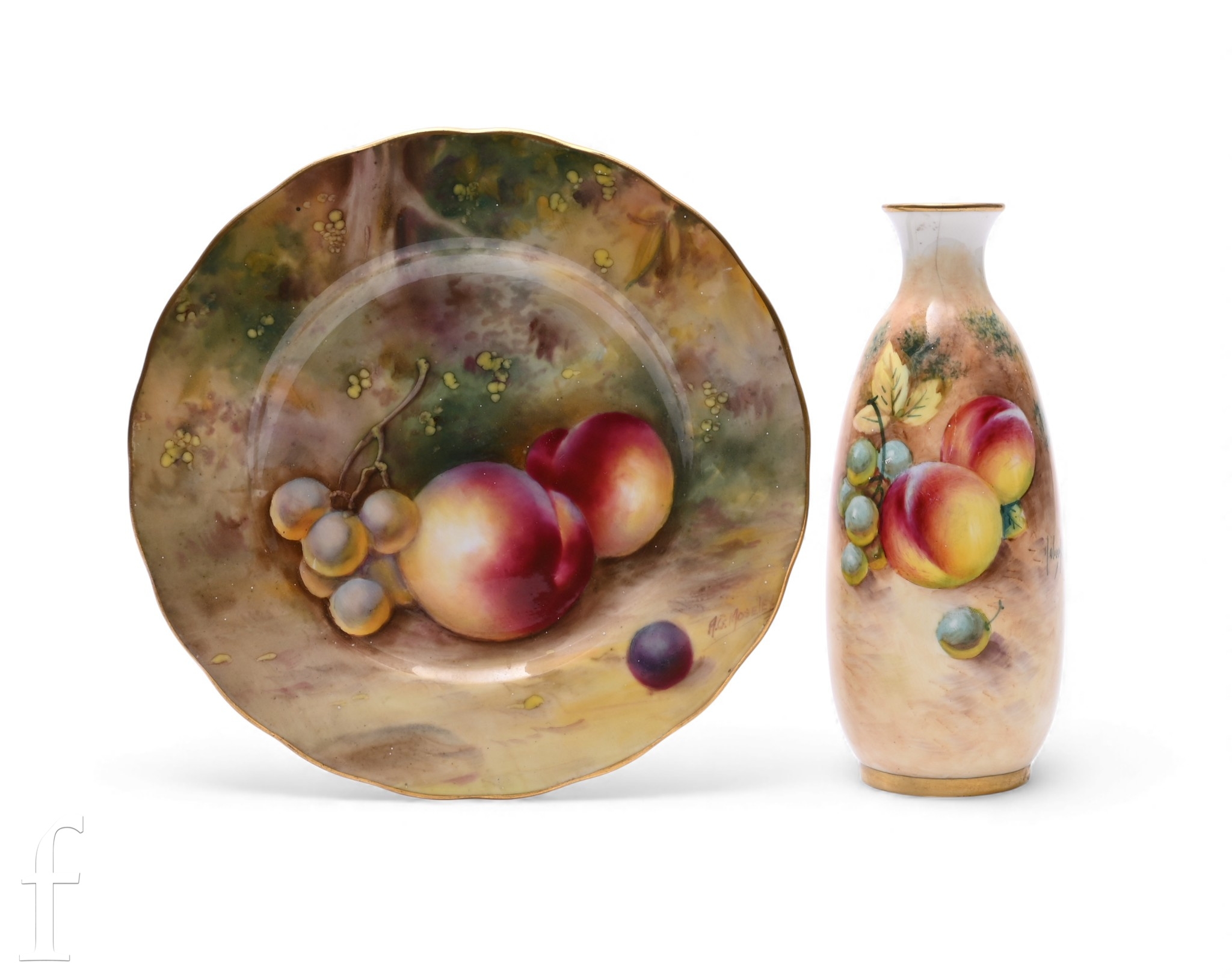 George Moseley for Royal Worcester, a fruit painted side plate, circa 1928, of circular form, decorated with peaches and grapes over moss covered ground, signed, printed puce marks, diameter 16.5cm, and William Frank Roberts for Royal Worcester, a fruit painted vase, circa 1960, of elongated ovoid form with drawn neck and everted rim, decorated with peaches and grapes with grape vignette verso, signed, printed black marks, height 5cm. (2)