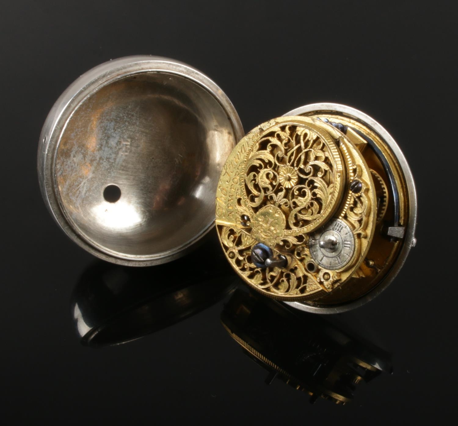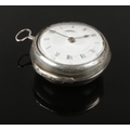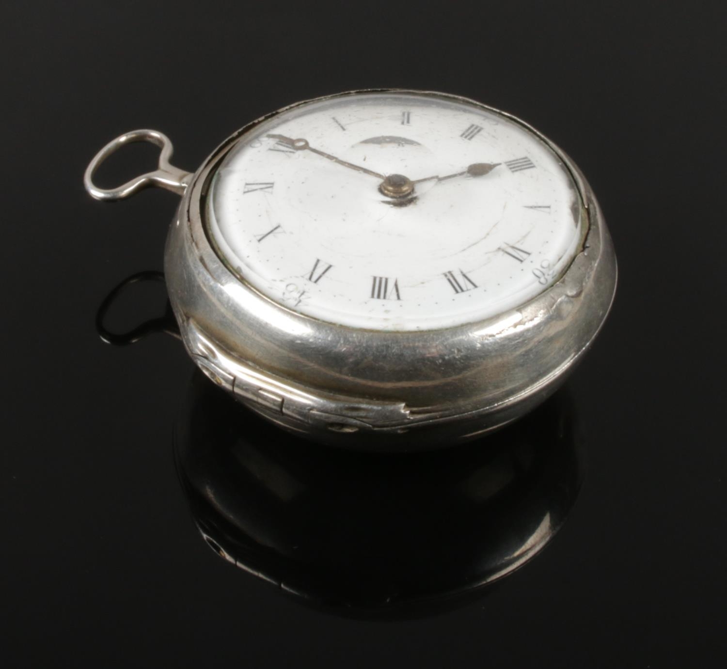 A silver pair cased pocket watch. With verge escapement, painted enamel dial with Roman numeral markers. Movement stamped for Thomas Steward.