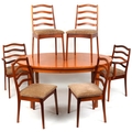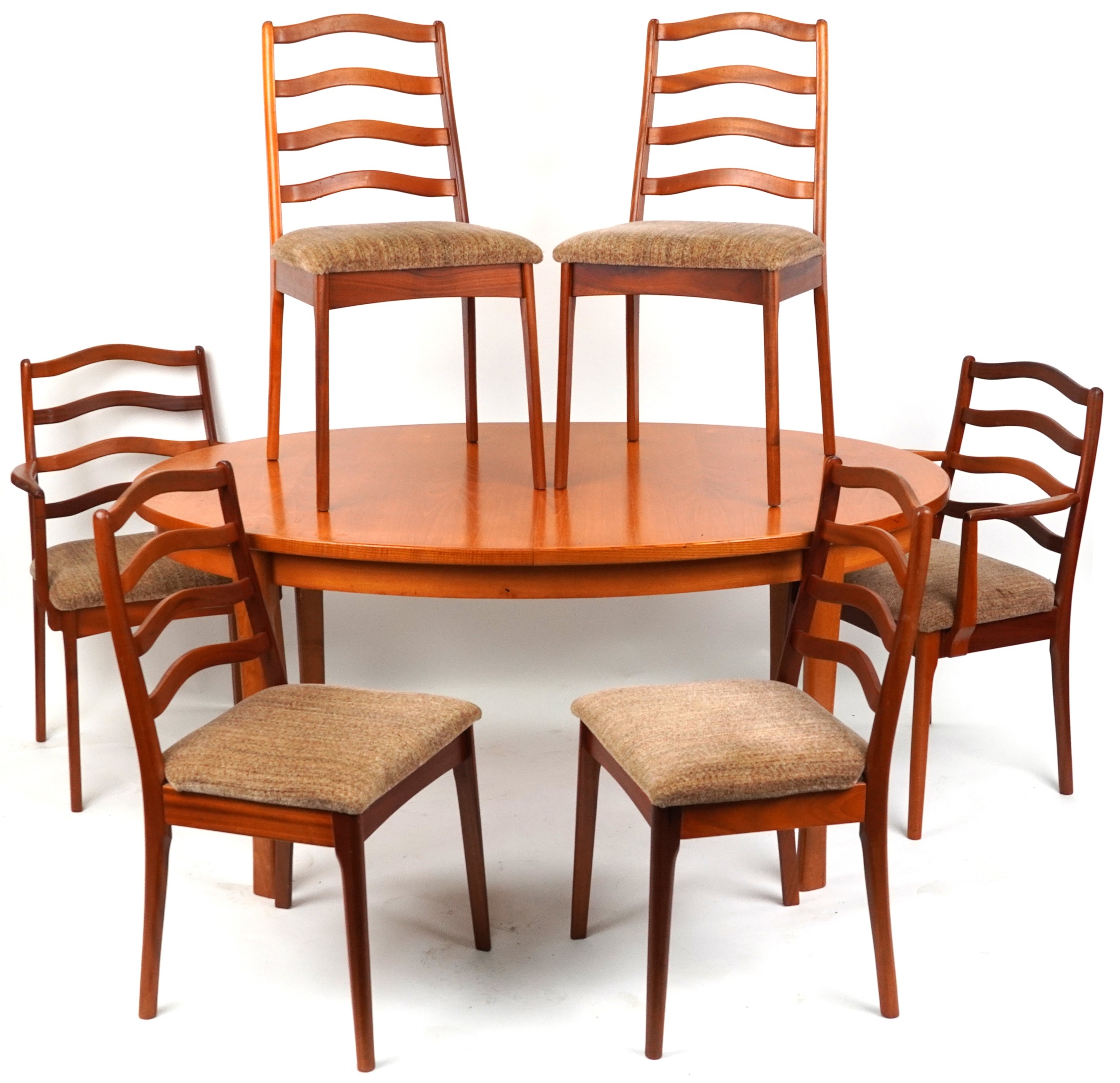 A mid 20th century teak oval extending dining table, 74cm H x 162cm W x 100cm D together with a matching set of six dining chairs.