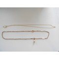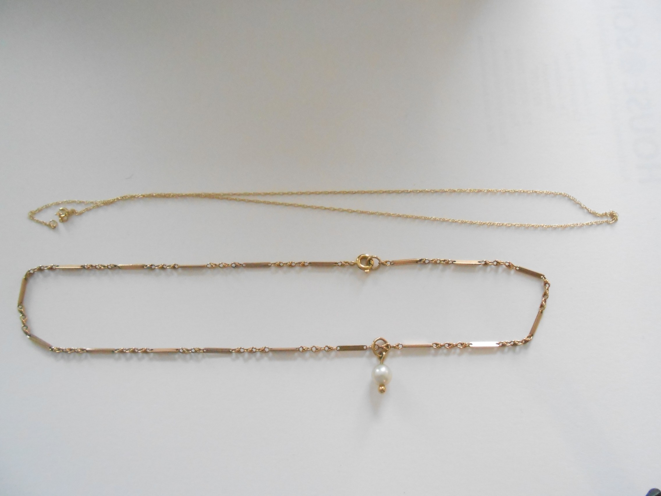 A gold coloured metal Albert with pearl drop and a fine 9ct....