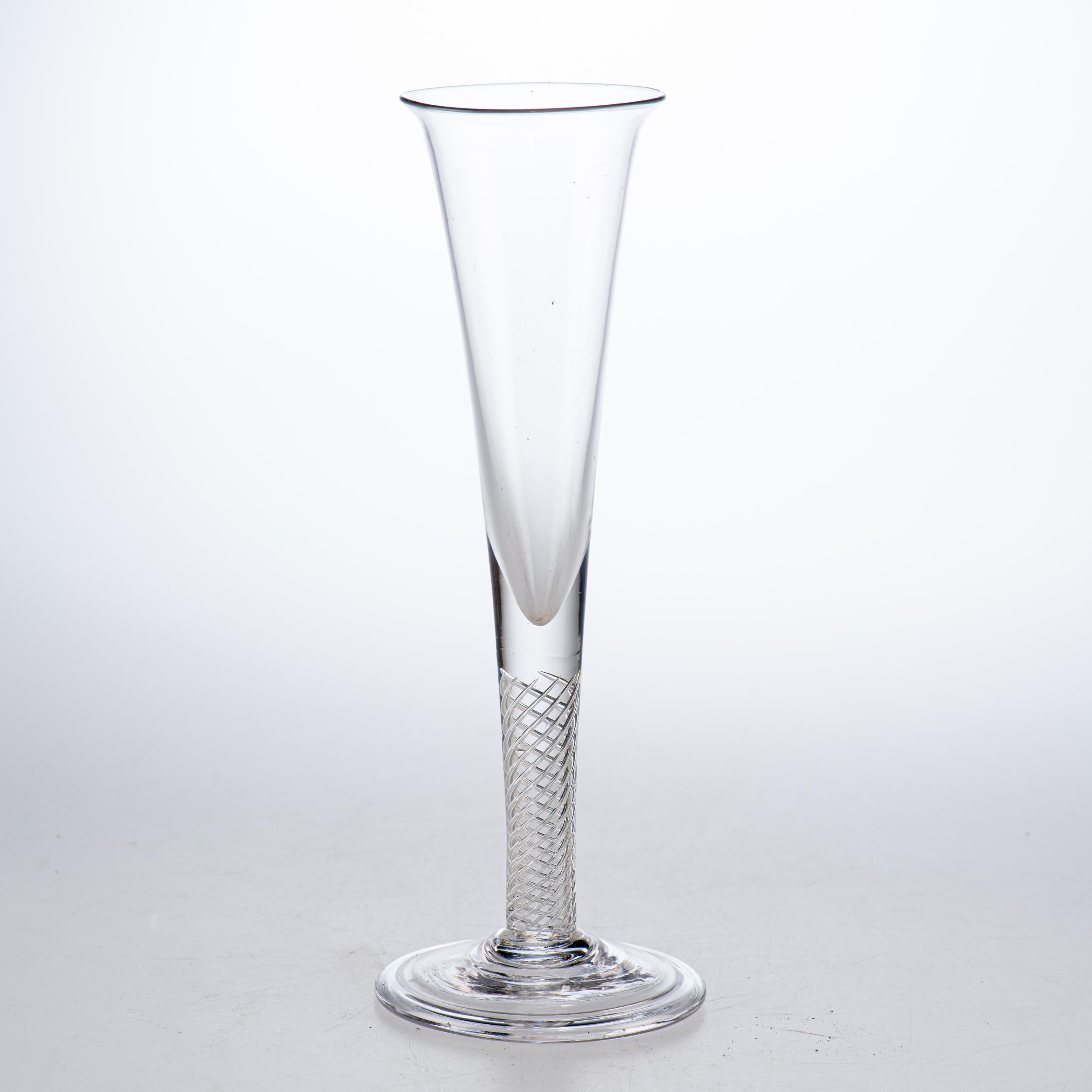 the tall trumpet bowl with a flared rim, multi air-twist stem, raised on a circular, conical folded foot, pontil mark to the base. 24cm high