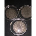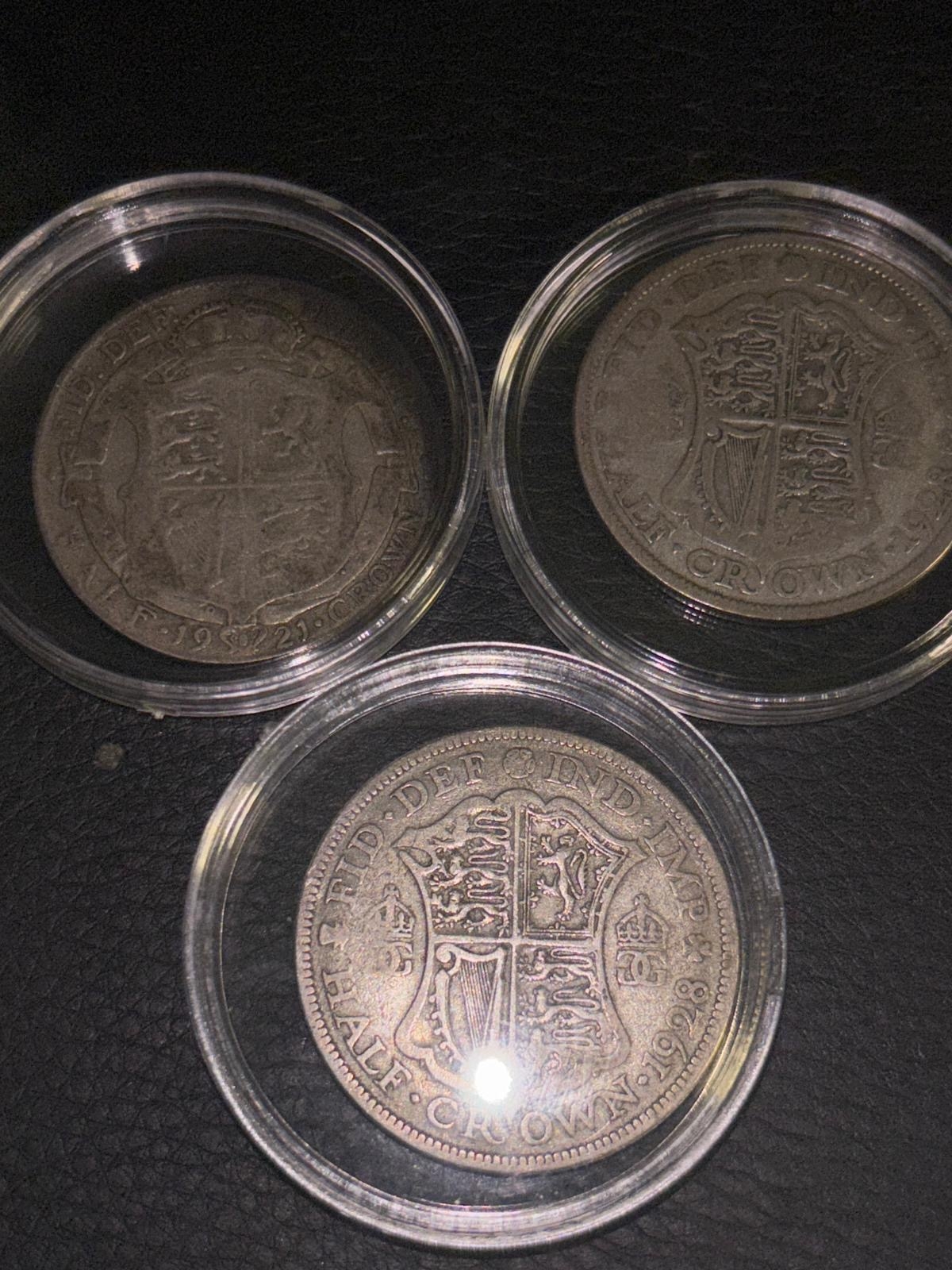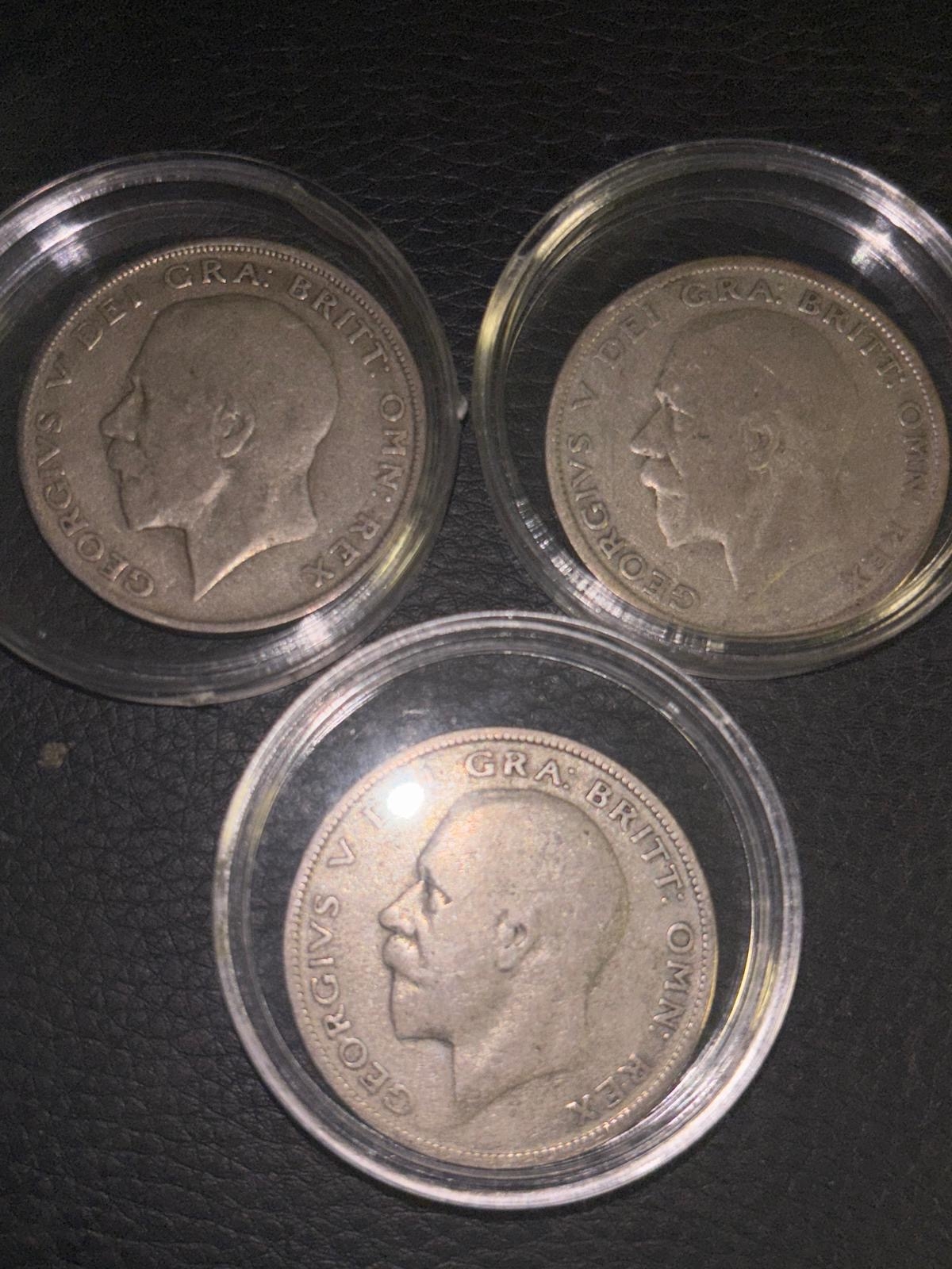 Three George V Silver Half Crowns – 1921, 1928 & 1932 – British Coin Set. A matched group of three original British half crowns from the reign of George V, dated 1921, 1928 and 1932. Struck in .500 silver, each coin features the classic crowned shield reverse and portrait of the King. All are circulated with visible wear, but remain solid, collectable examples with clear detail and strong historical character. Housed in protective capsules and offered as a complete three-coin set. A tidy, affordable trio of early 20th century British silver—ideal for collectors or as a starter set.
