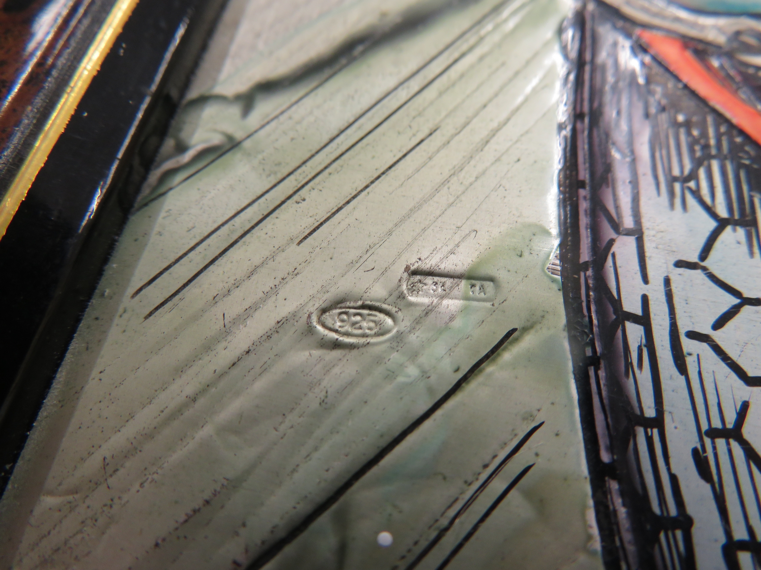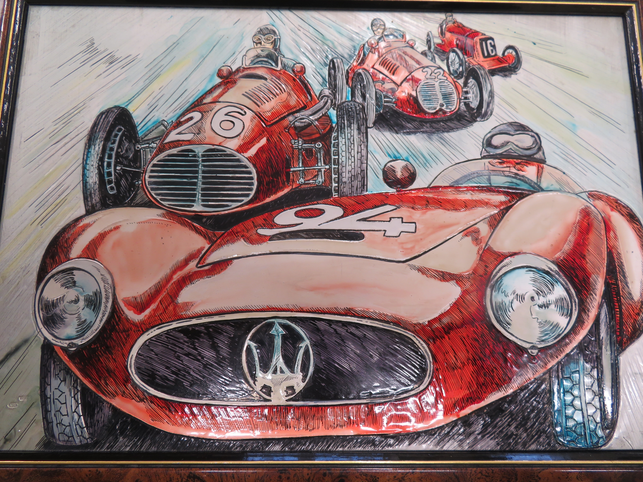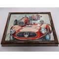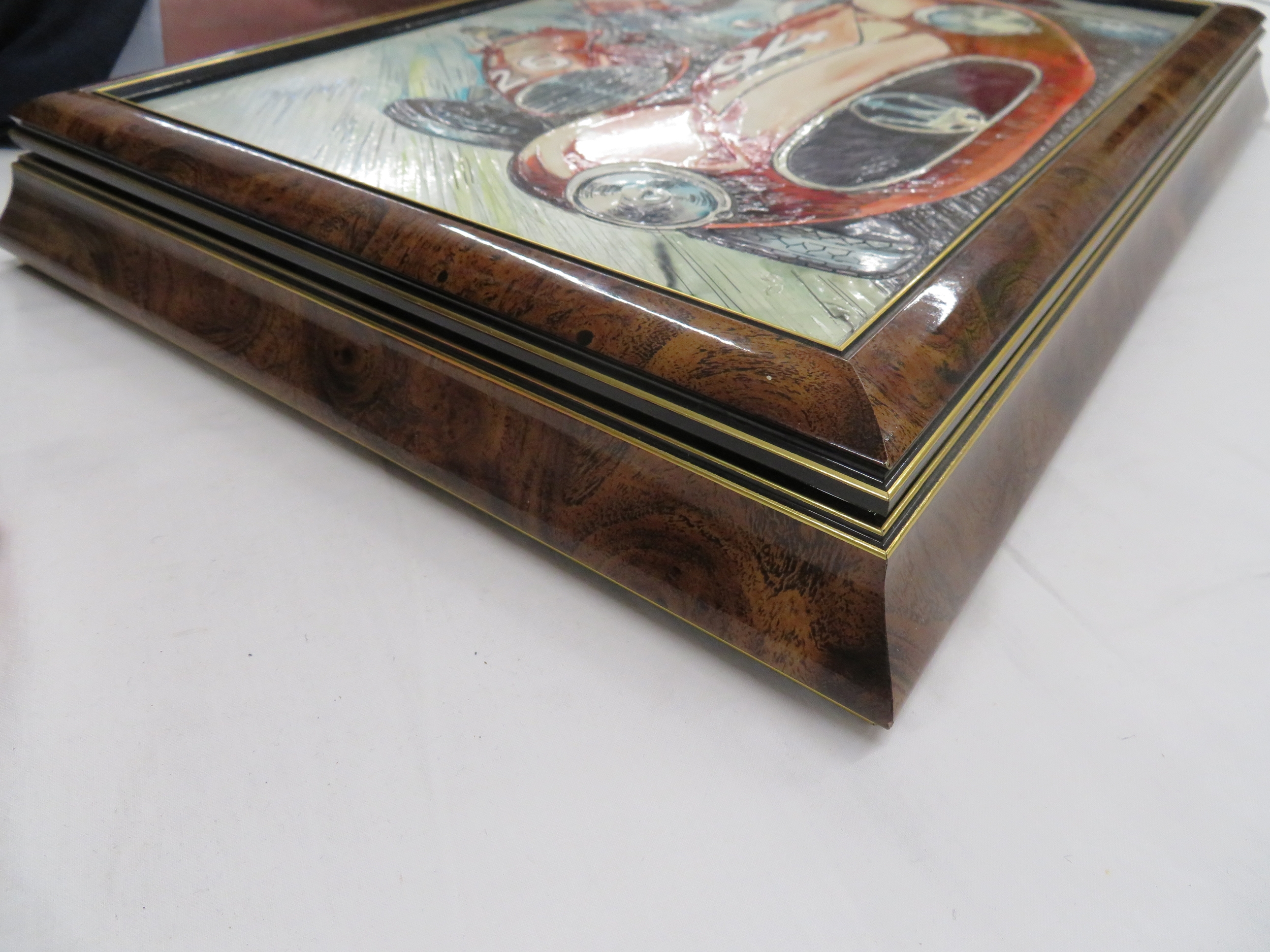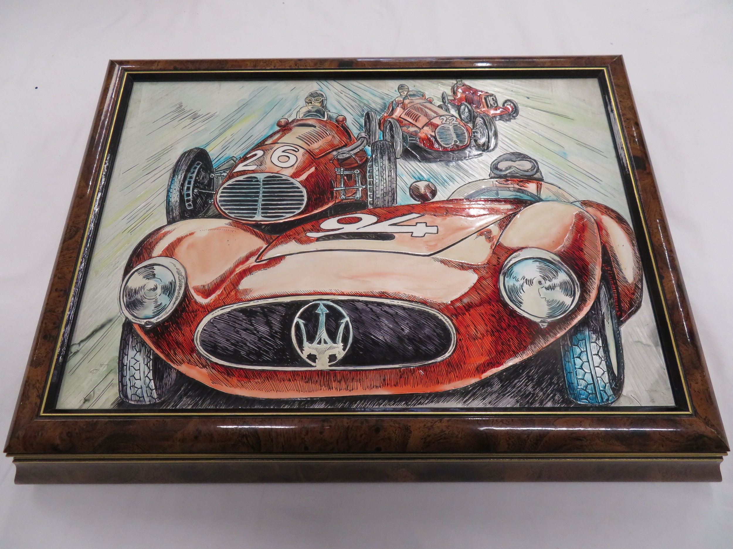 Luxury handmade Italian gambling set with tokens, playing cards and ashtrays - by G. G. Sport - Sassuolo - housed in a walnut veneered box with impressive Maserati enameled silver plaque to top, depicting Red Maserati race cars and their drivers - possibly only one in existence