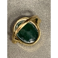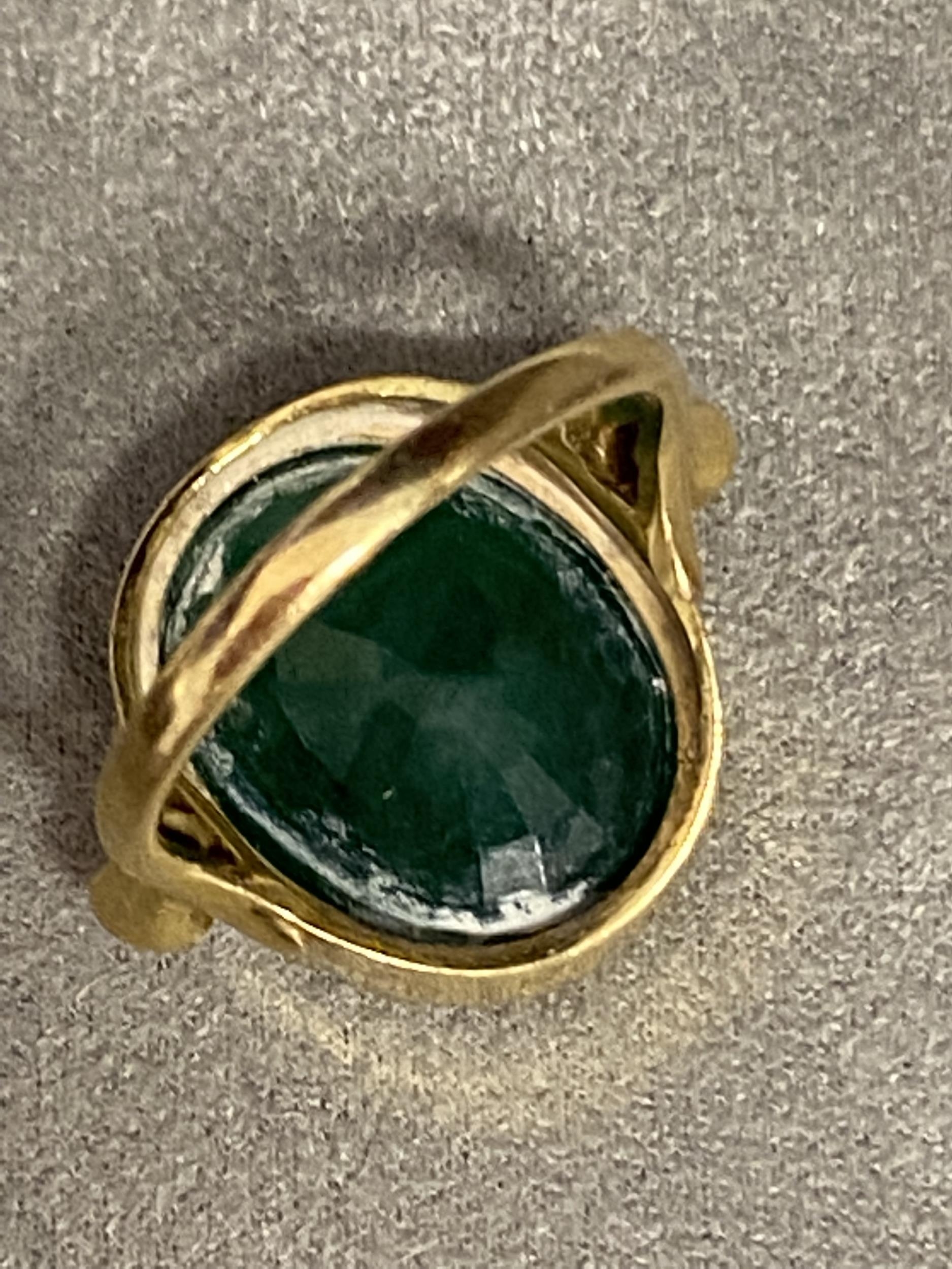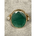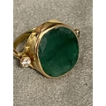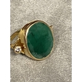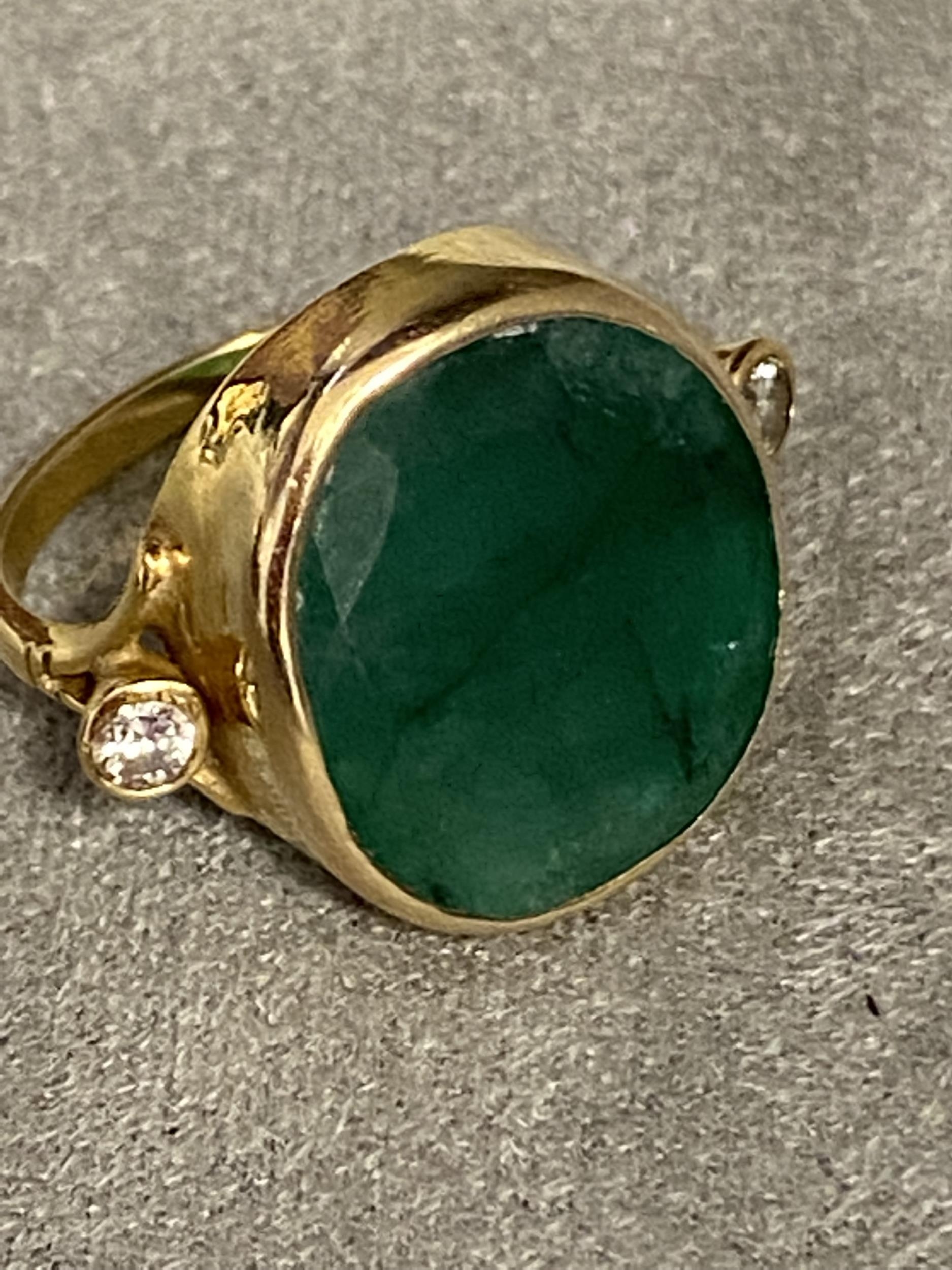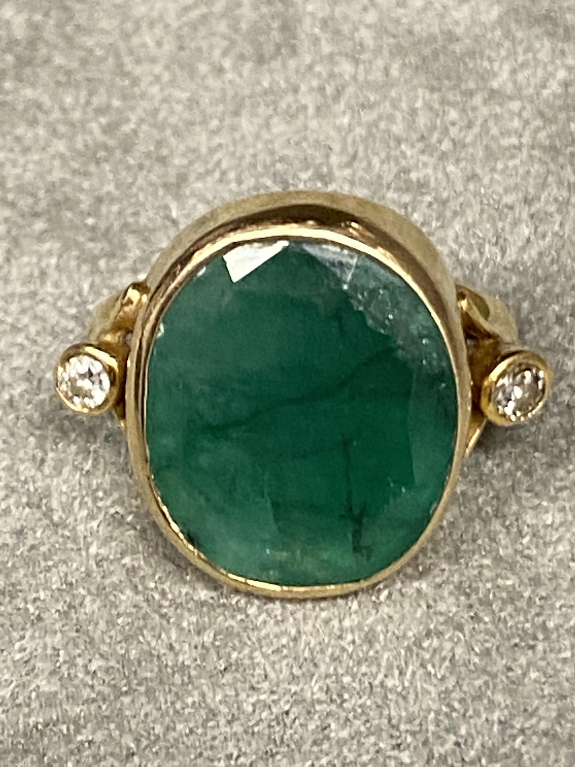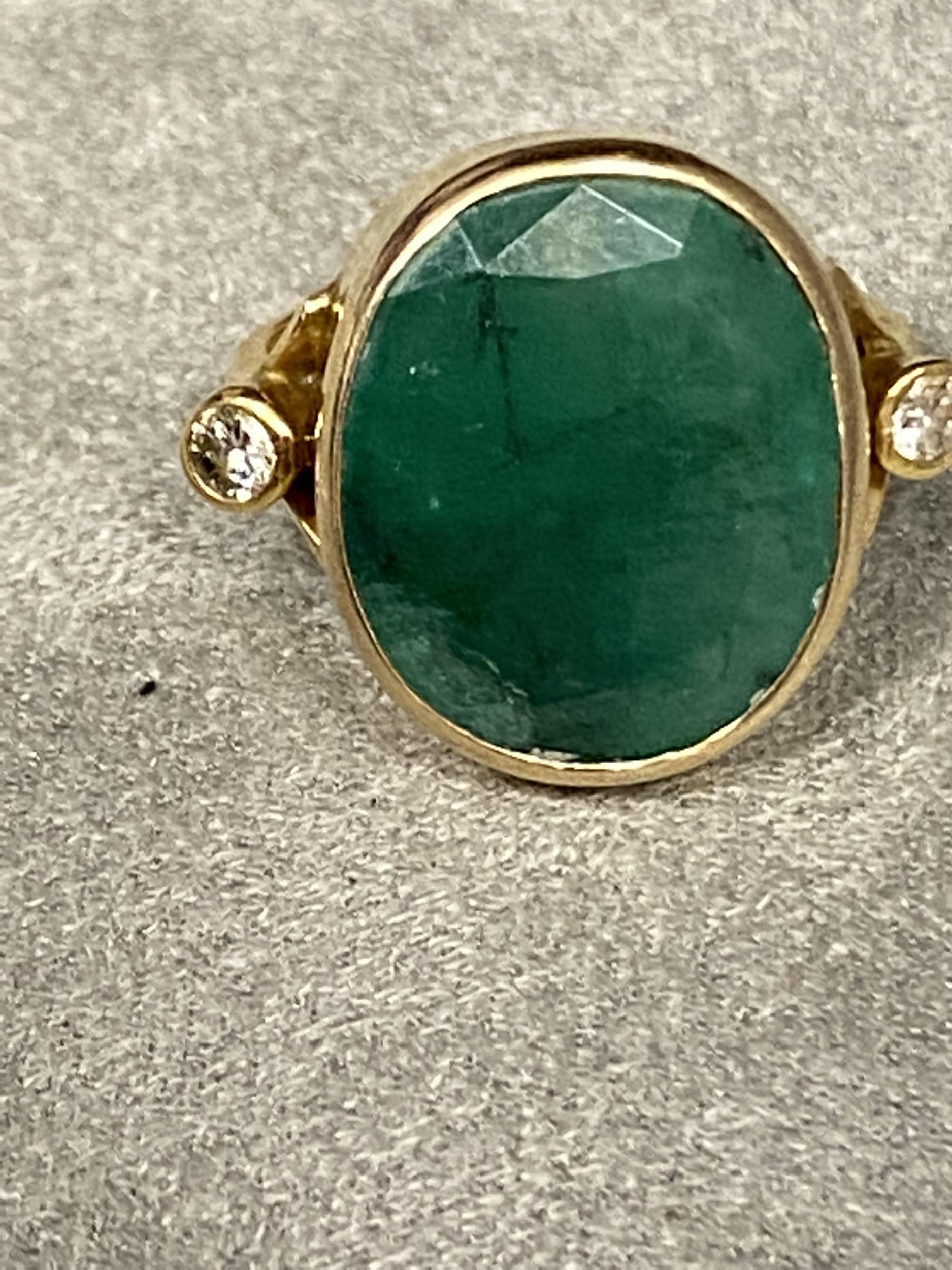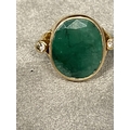 Unmarked yellow metal emerald and diamond ladies dress ring, central oval free cut emerald , 14 mm by 18mm in collar setting , with brilliant cut diamond accents, 6.8 grams, size K, the emerald is heavily included with small 2 mm chip to facet edge. Marks worn
