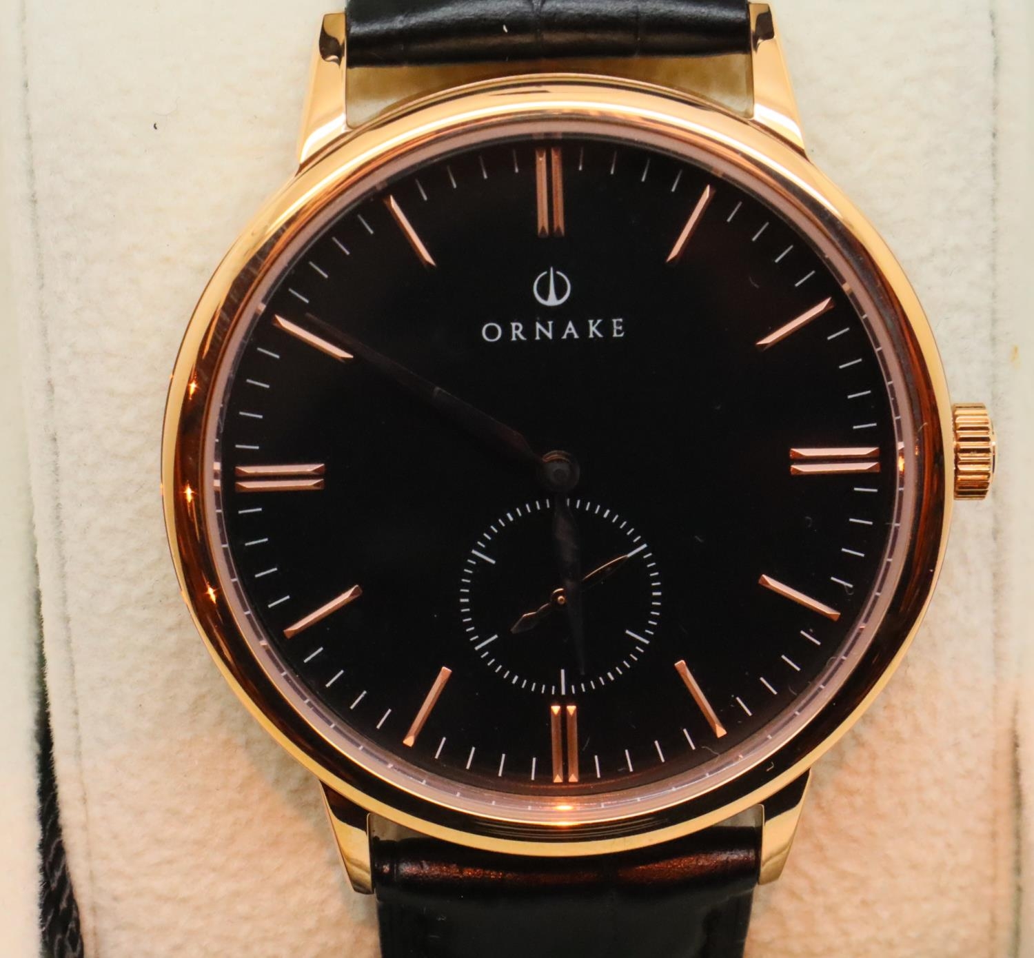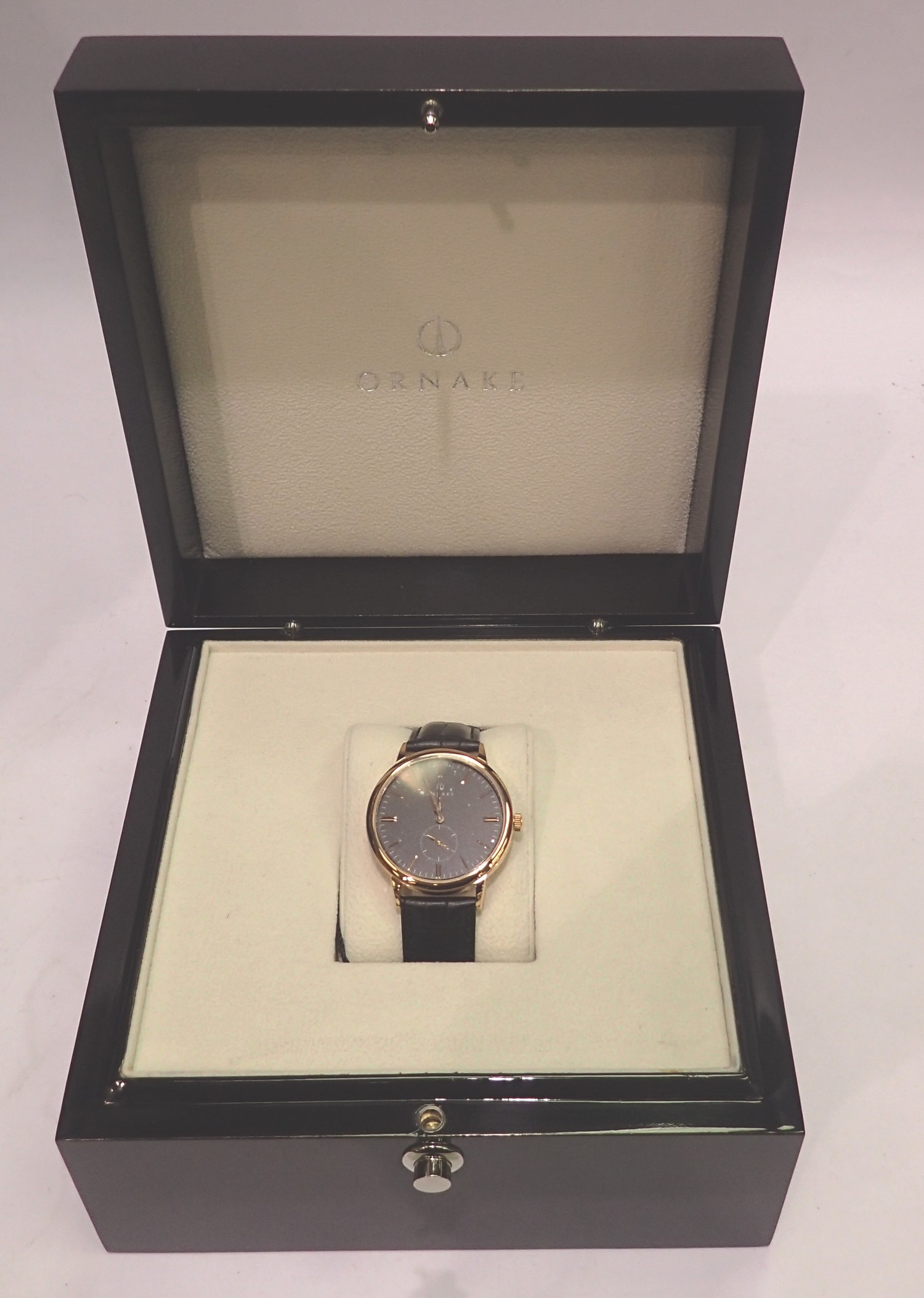 New boxed Ornake wristwatch with leather strap, black face and second hand movement. P&P Group 1 (£14+VAT for the first lot and £1+VAT for subsequent lots)