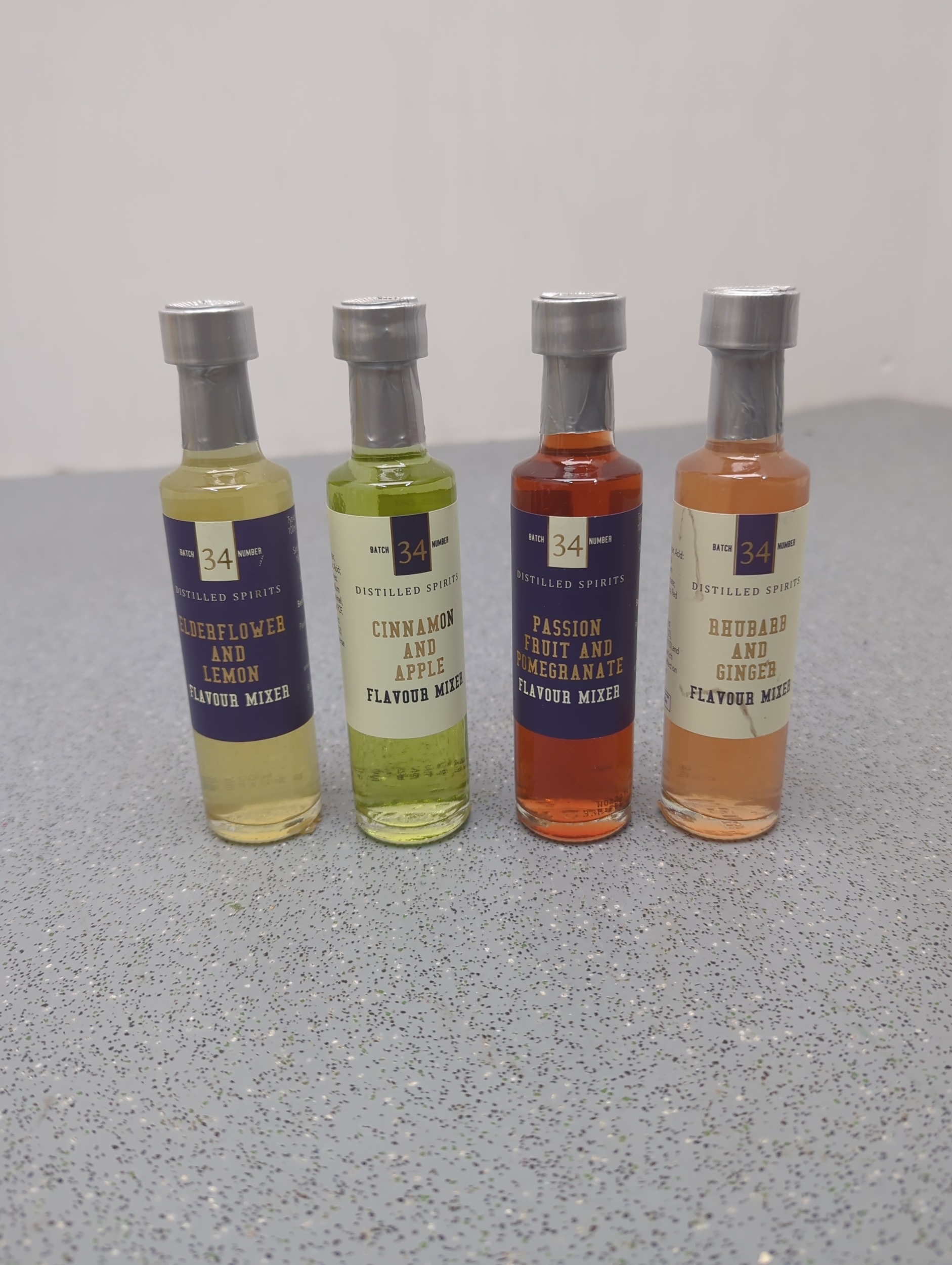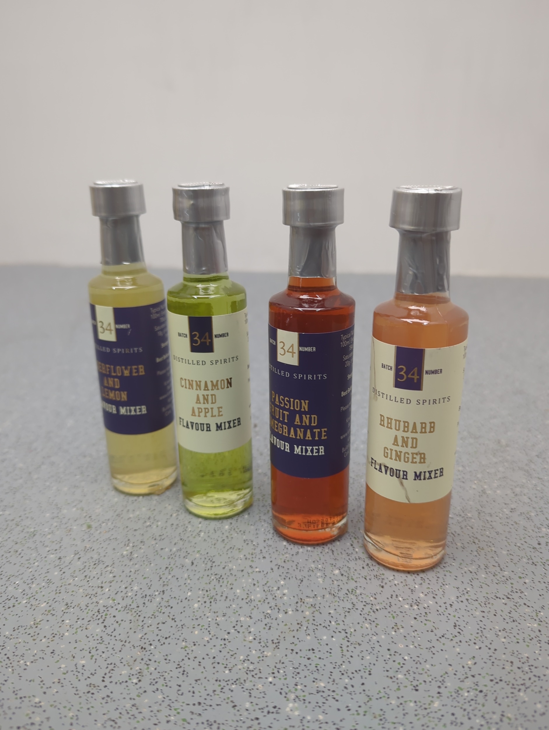 This lot includes four bottles of 34 Distilled Spirits flavour mixers, featuring a variety of flavours including Rhubarb and Ginger, Passion Fruit and Pineapple, Cinnamon and Apple, and Elderflower and Lemon. Each bottle is sealed and labelled, ideal for enhancing drinks with unique flavours. The mixers are visually appealing with vibrant label designs.