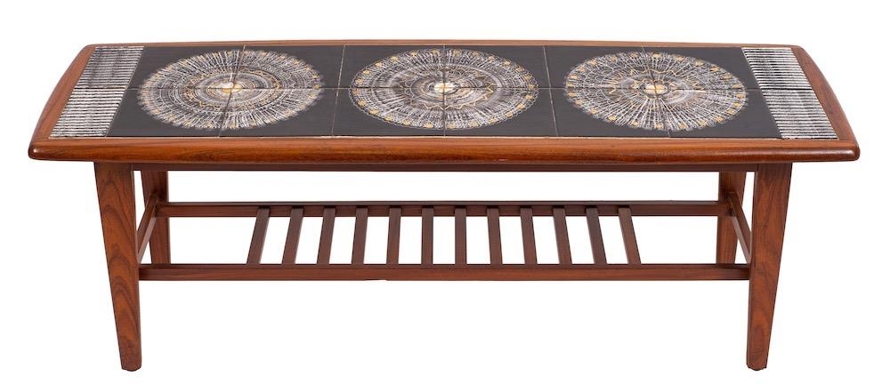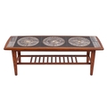 A teak and tile topped coffee table, retailed by Heals, mid-20th century; the oblong top inset with sixteen Malkin Johnson black glazed tiles with sgraffito design and gilt detailing; 39cm high, 115cm long, 39 cm wide
