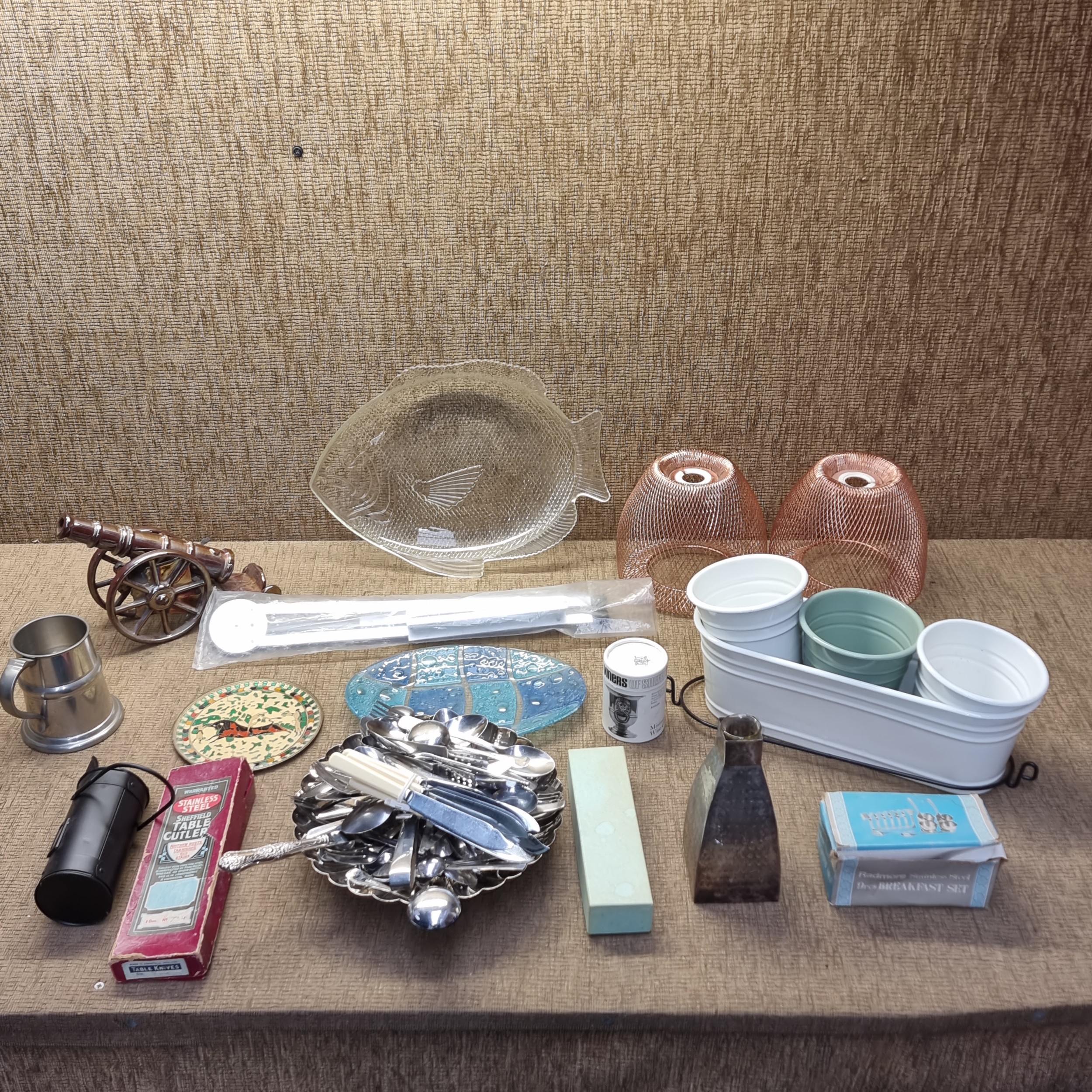 Mixed items including silver plate cannon, basket lamp shades and vintage hip flasks.