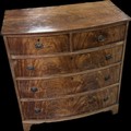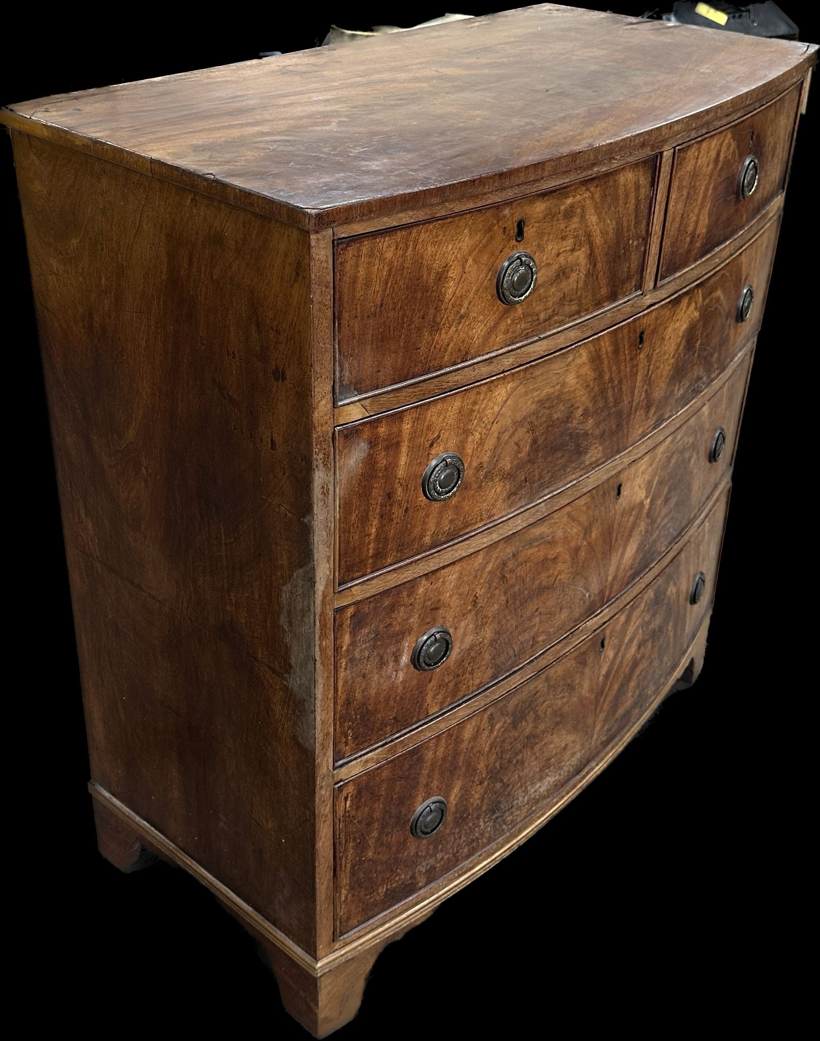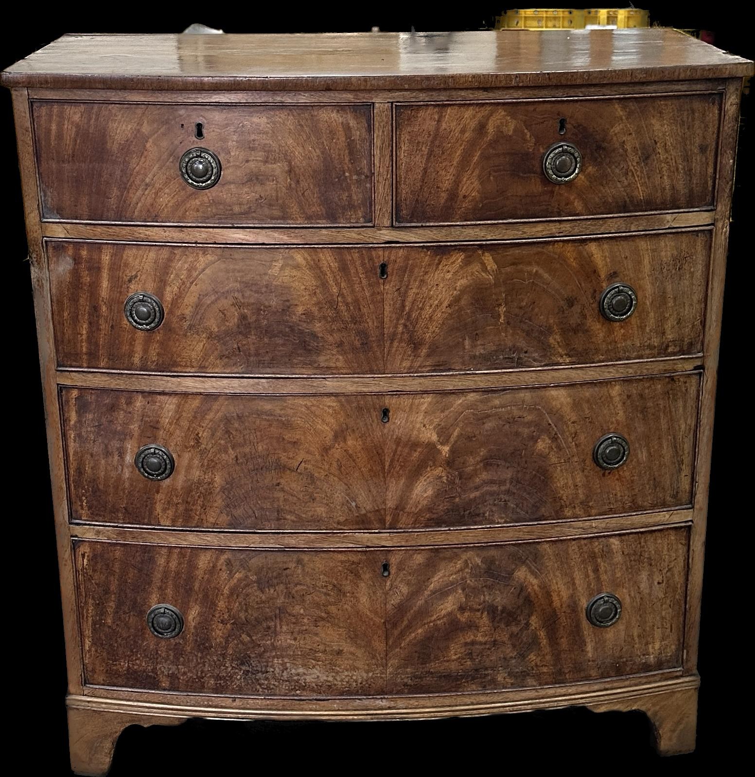 Antique two over three flamed magohany bow fronted chest measures approximately 40 inches tall x 36 wide and 19 deep