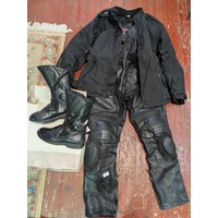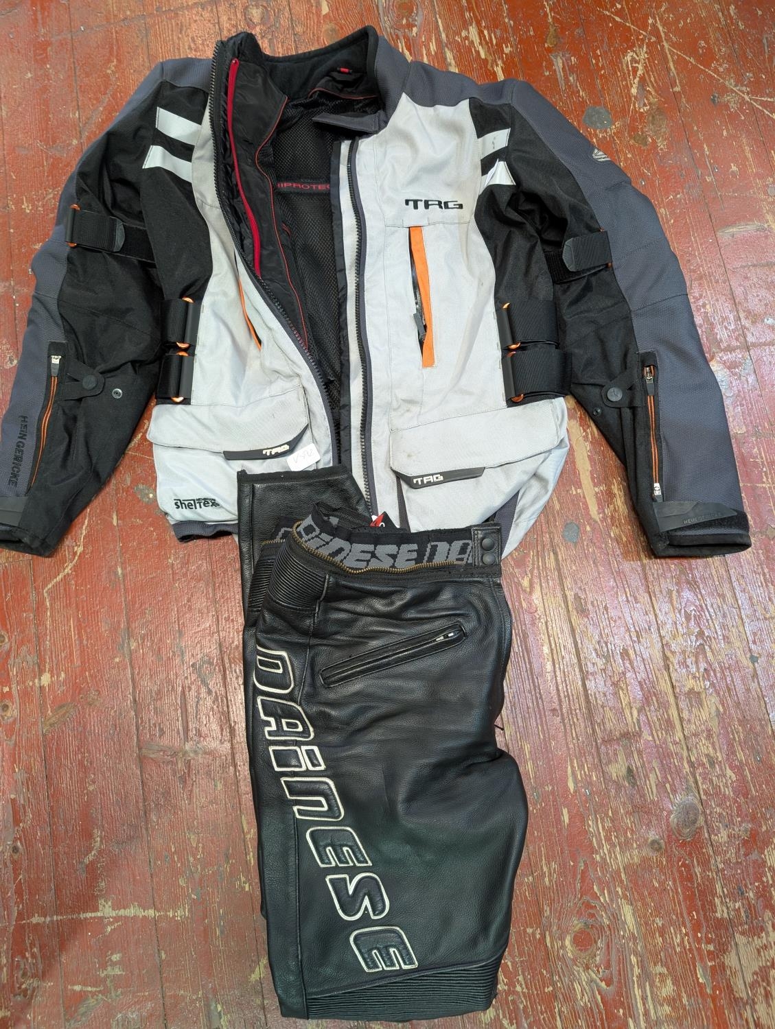 A Hein Gericke motorbike jacket size L with a pair of leather Dainese pants size 46