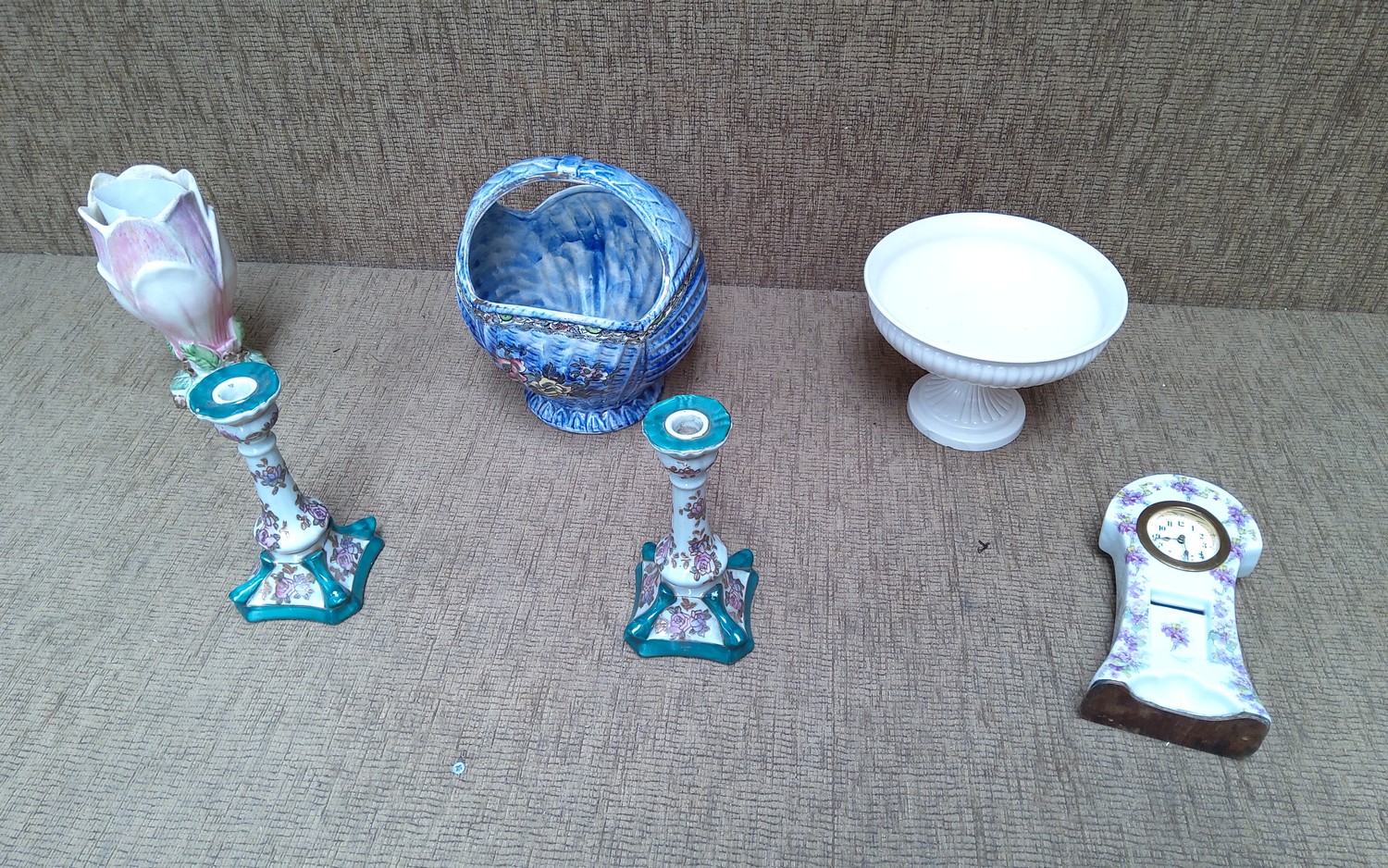 Sylvac Tulip vase, a pair of ceramic candlesticks, Wedgwood fruit bowl and Arthur Wood fruit basket.
