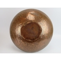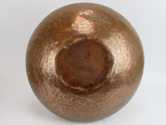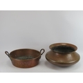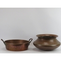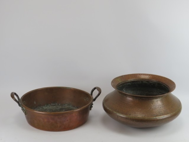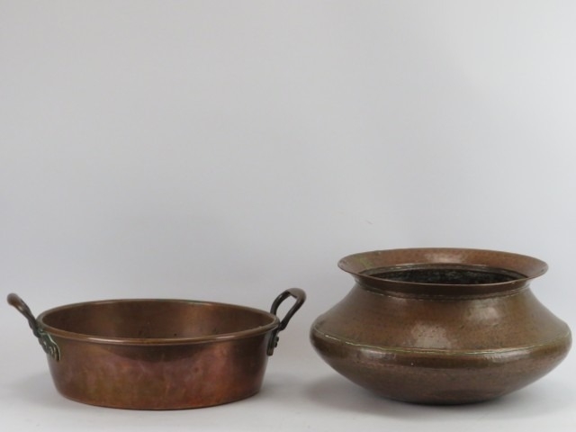 A large Middle Eastern hammered copper bowl and a European twin handled pan, probably 19th century. (2 items) Bowl: 41 cm diameter.