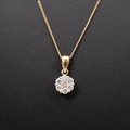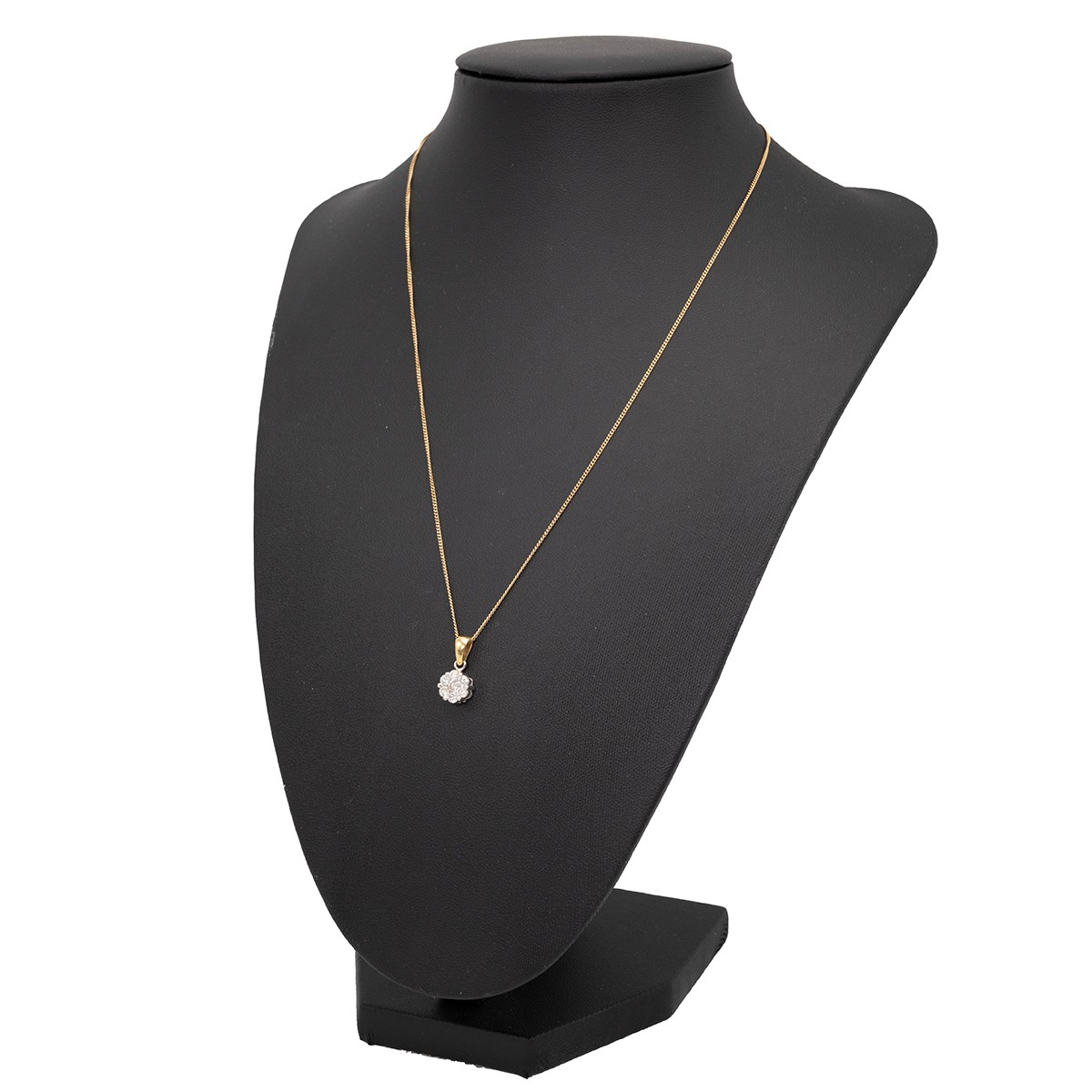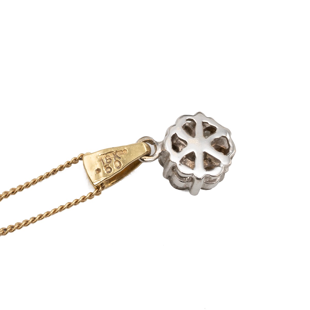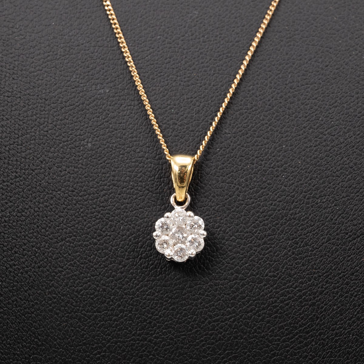 An 18ct white gold seven stone diamond pendant and 9ct gold necklace. The central diamond approx 0.06 carat, surrounded by six diamonds, each approx 0.03 carat in a six-claw setting, weight 1.5 grams. Together with a 9ct gold necklace with spring ring clasp, weight 1.6 grams.