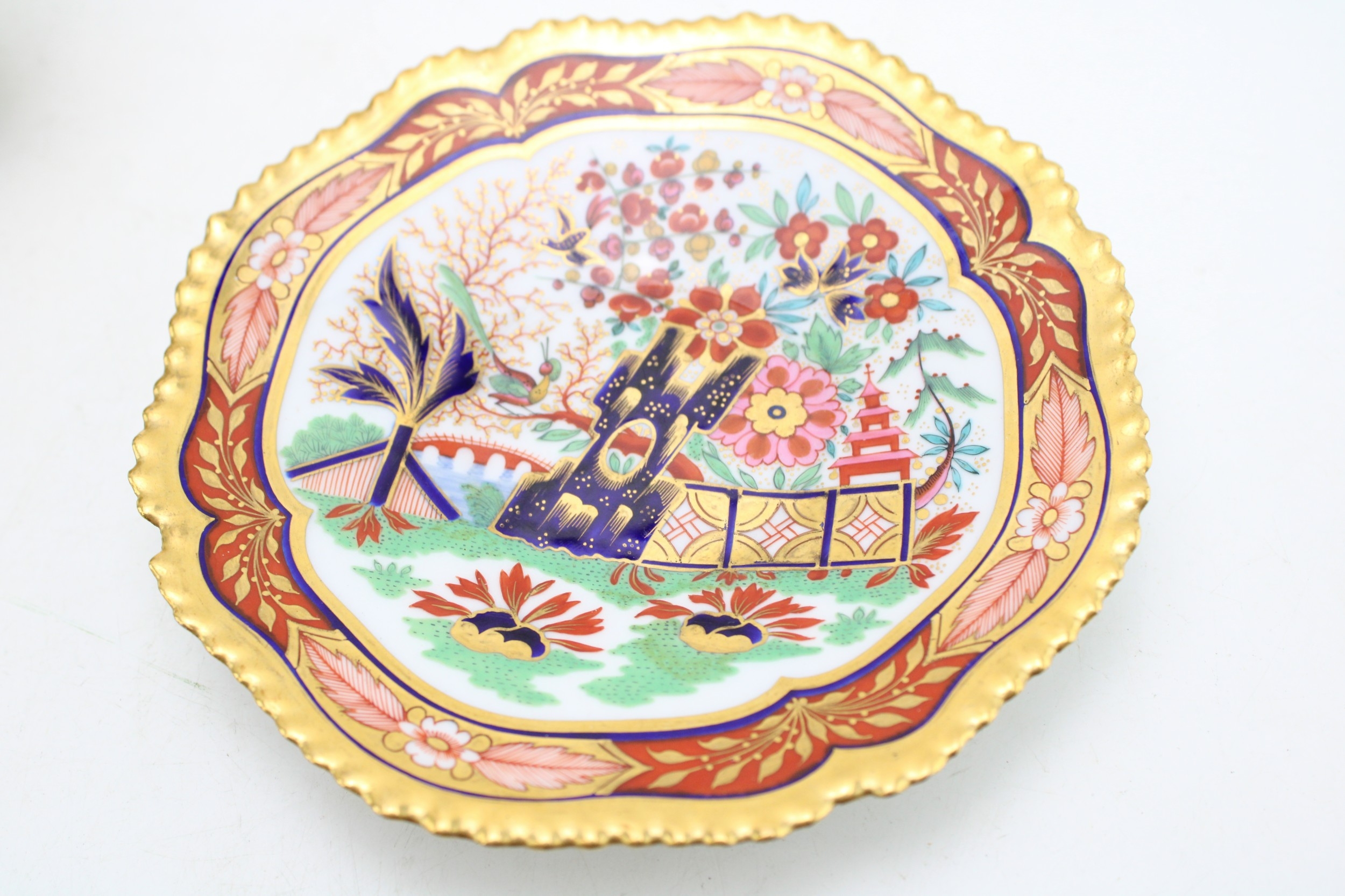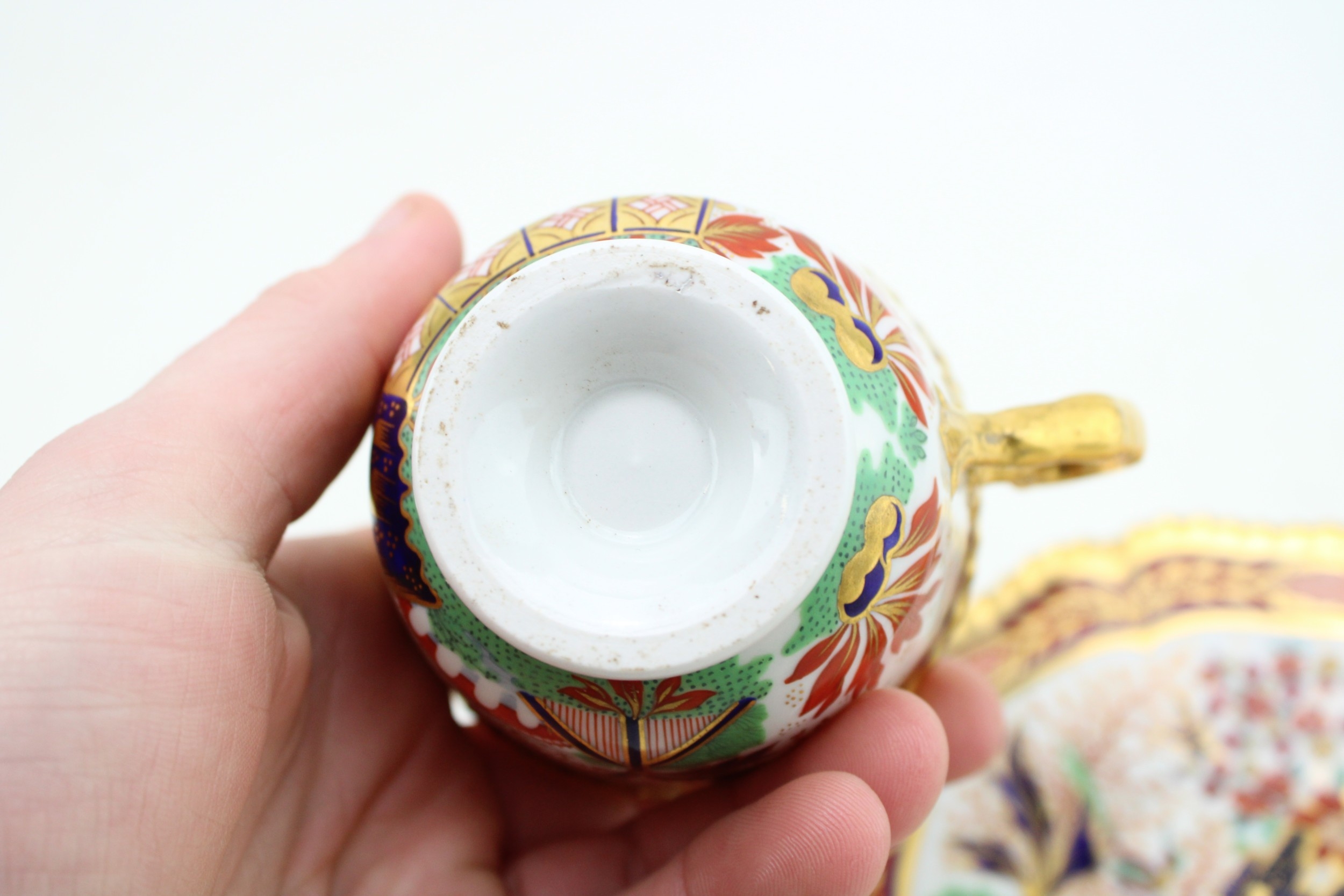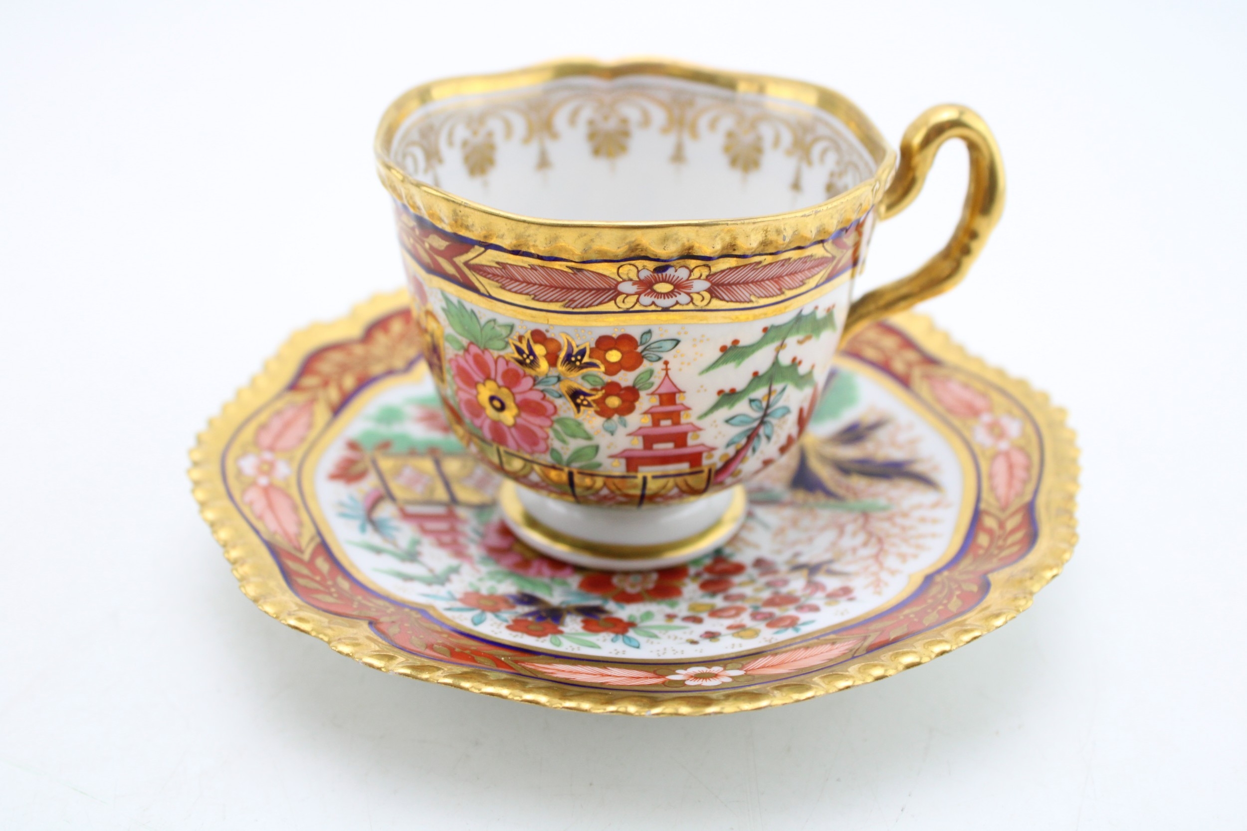 Worcester Flight and Barr, cup and saucer circa 1820, Japanese Fence pattern, impressed crown FBB mark, 8.5cm tall.