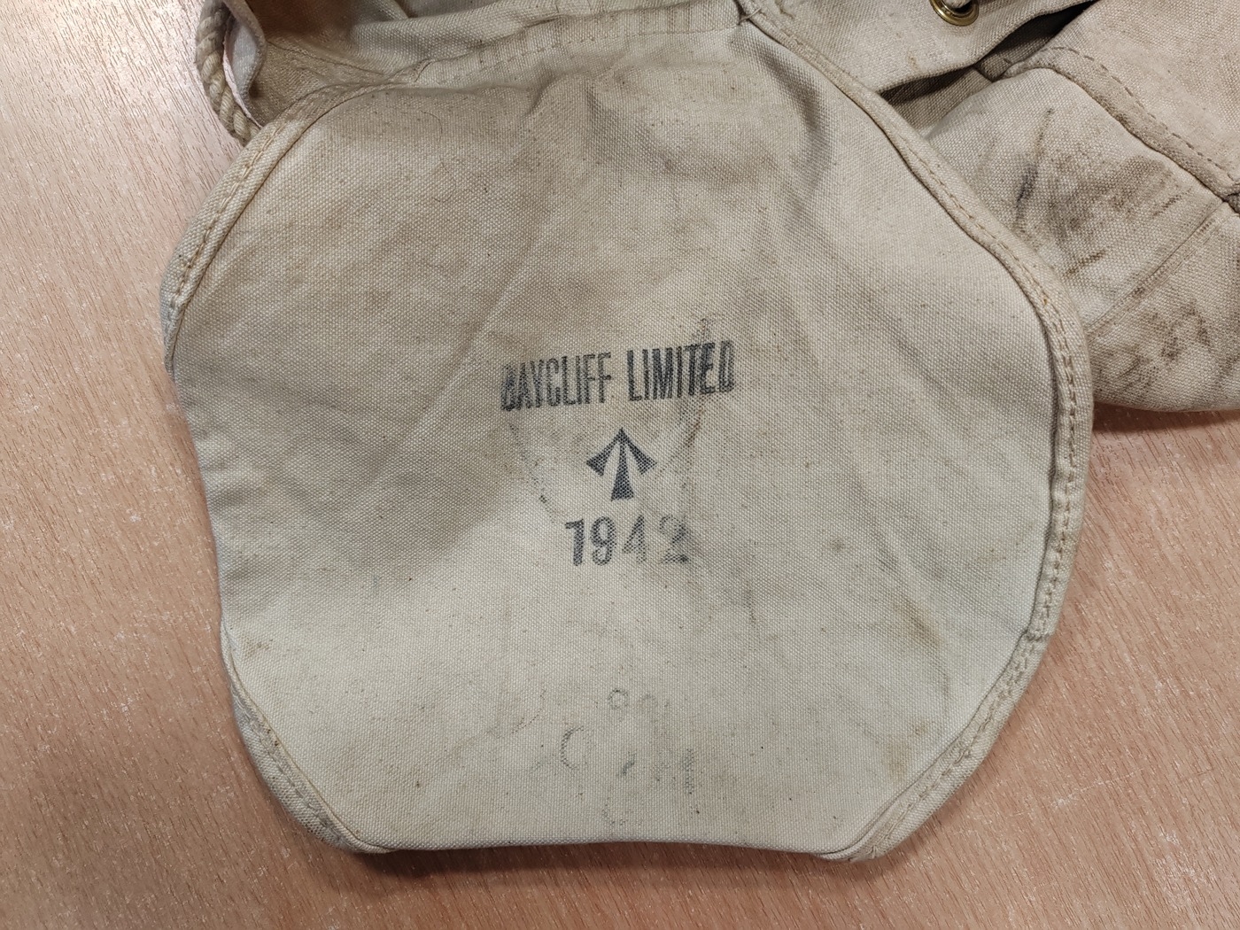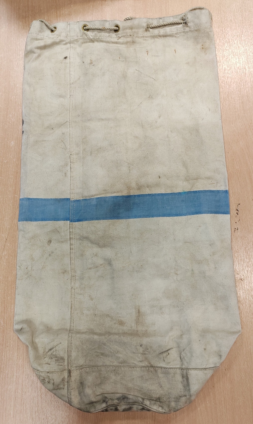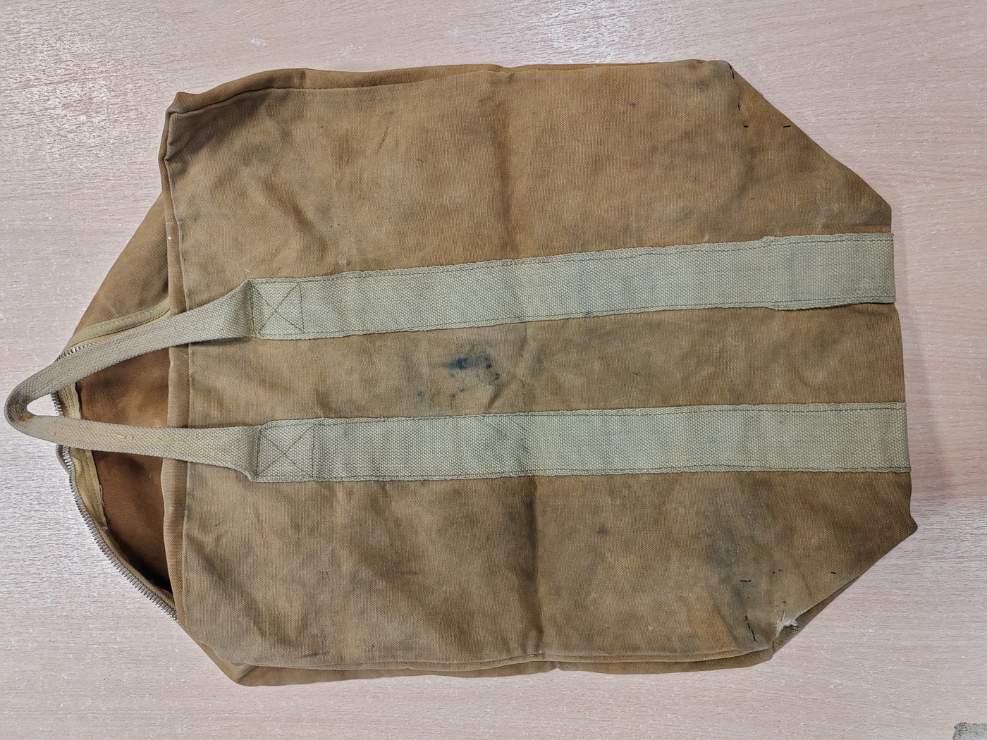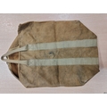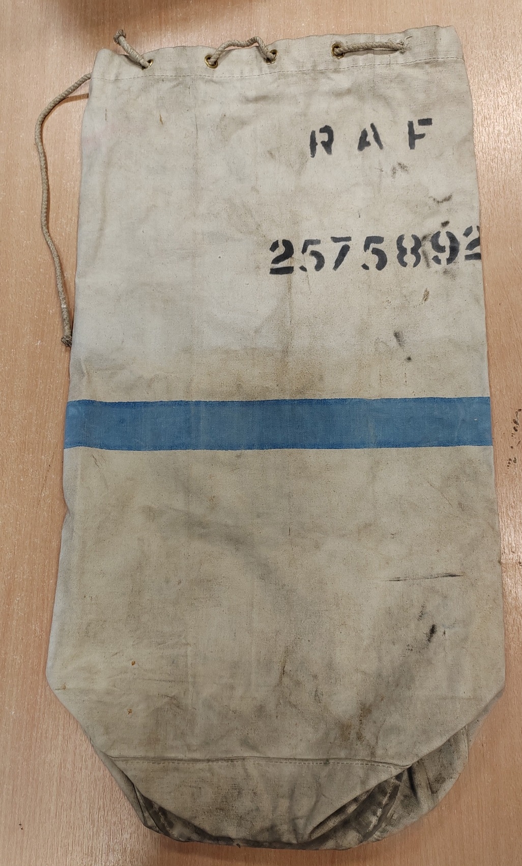 WWII RAF parachute bag with faded Air Ministry AM and crown markings, fastens with DOT brand zipper, general wear with small tear to bottom corner, does not have inner flaps overall good fine, plus RAF duffle kit bag, white with blue band, stamped RAF / 2575892, plus Baycliff Limited / crows foot / 1942 stamped on inner flap, apart from general dirt stains from use it is otherwise very fine. Qty 2 (½B)