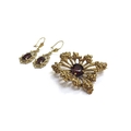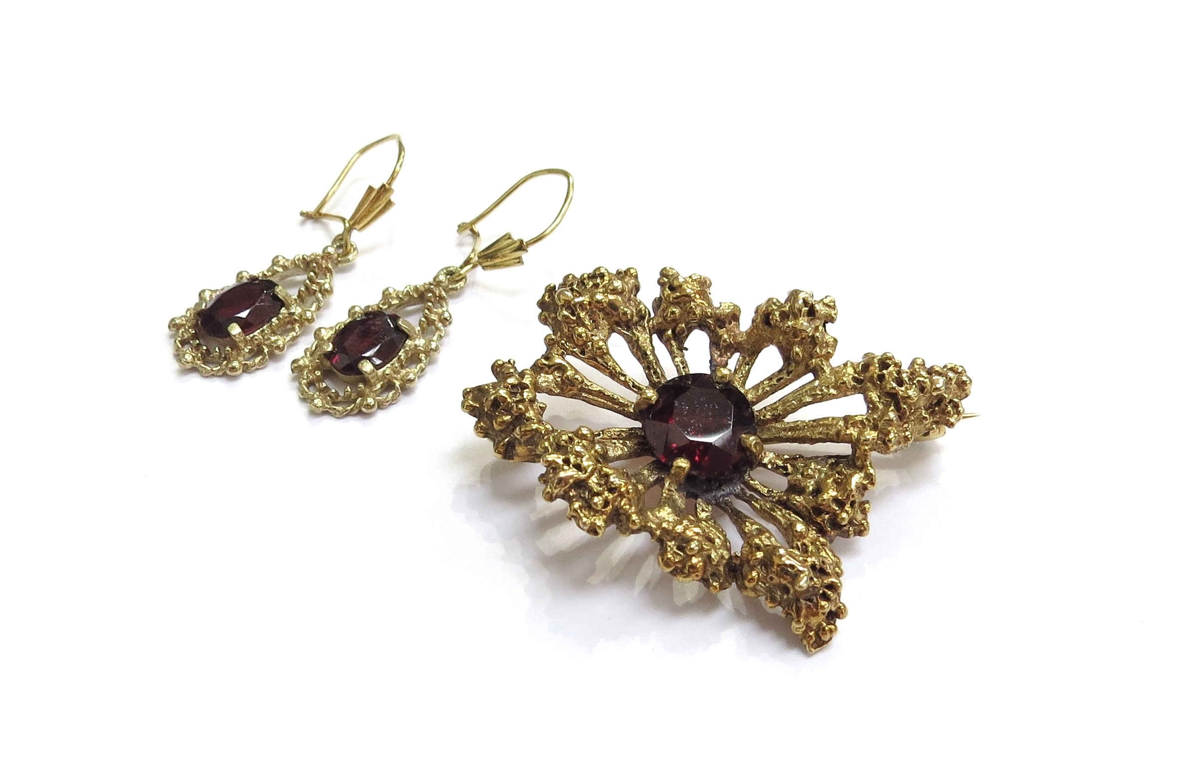 A 9ct gold textured free form brooch with red stone to centre and a pair of similar earrings, 9.7g total
