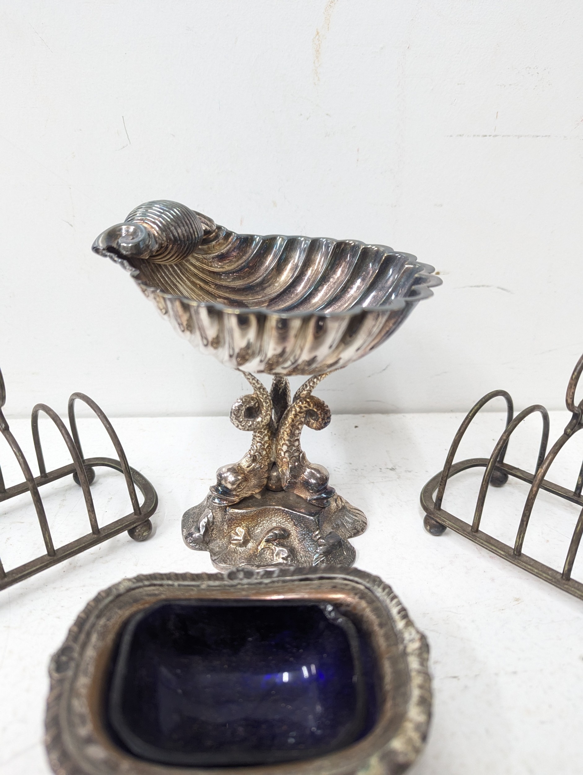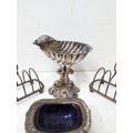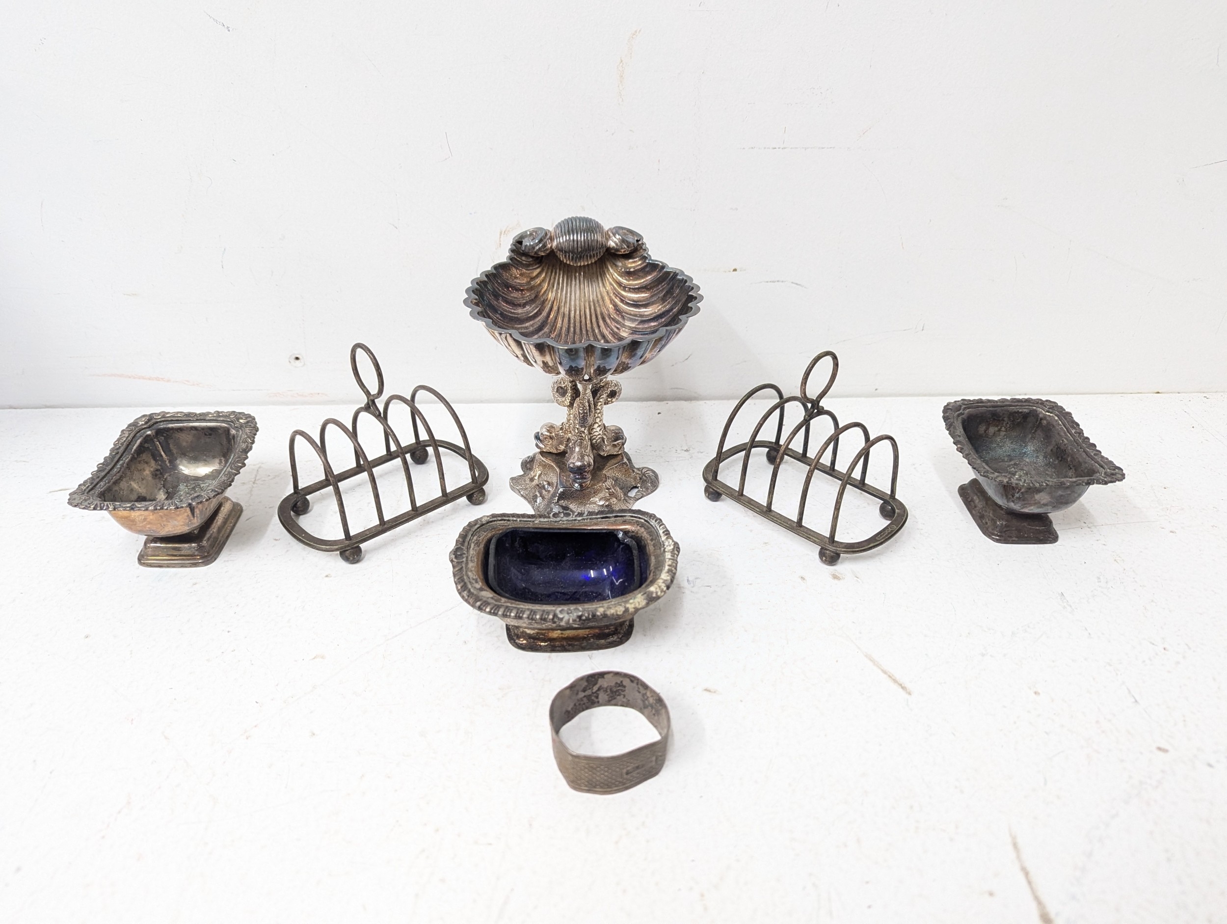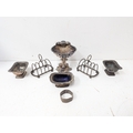 A silver napkin ring together with silver plated tableware comprising of two napkin rings, a small centre piece and salts
