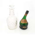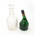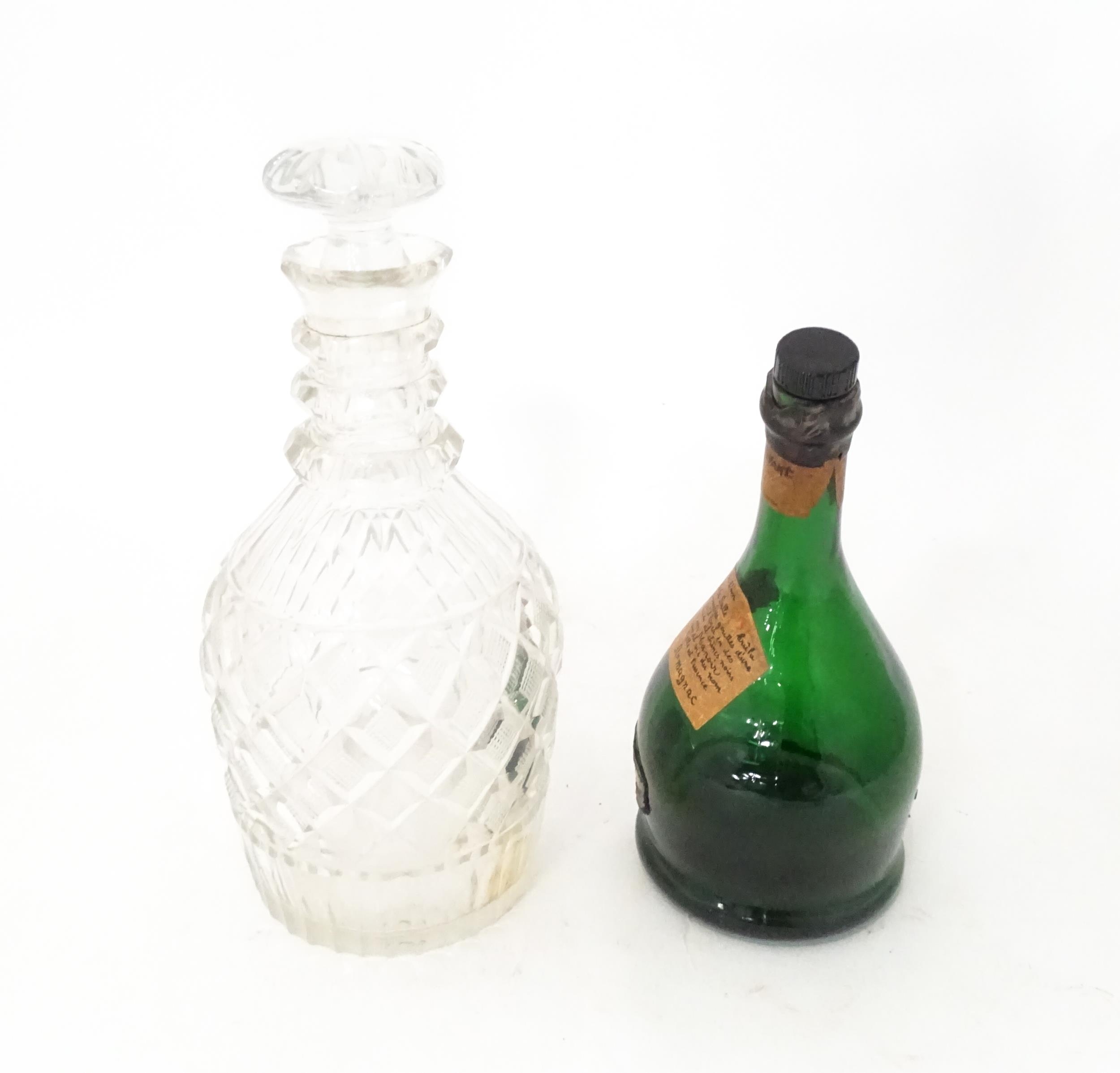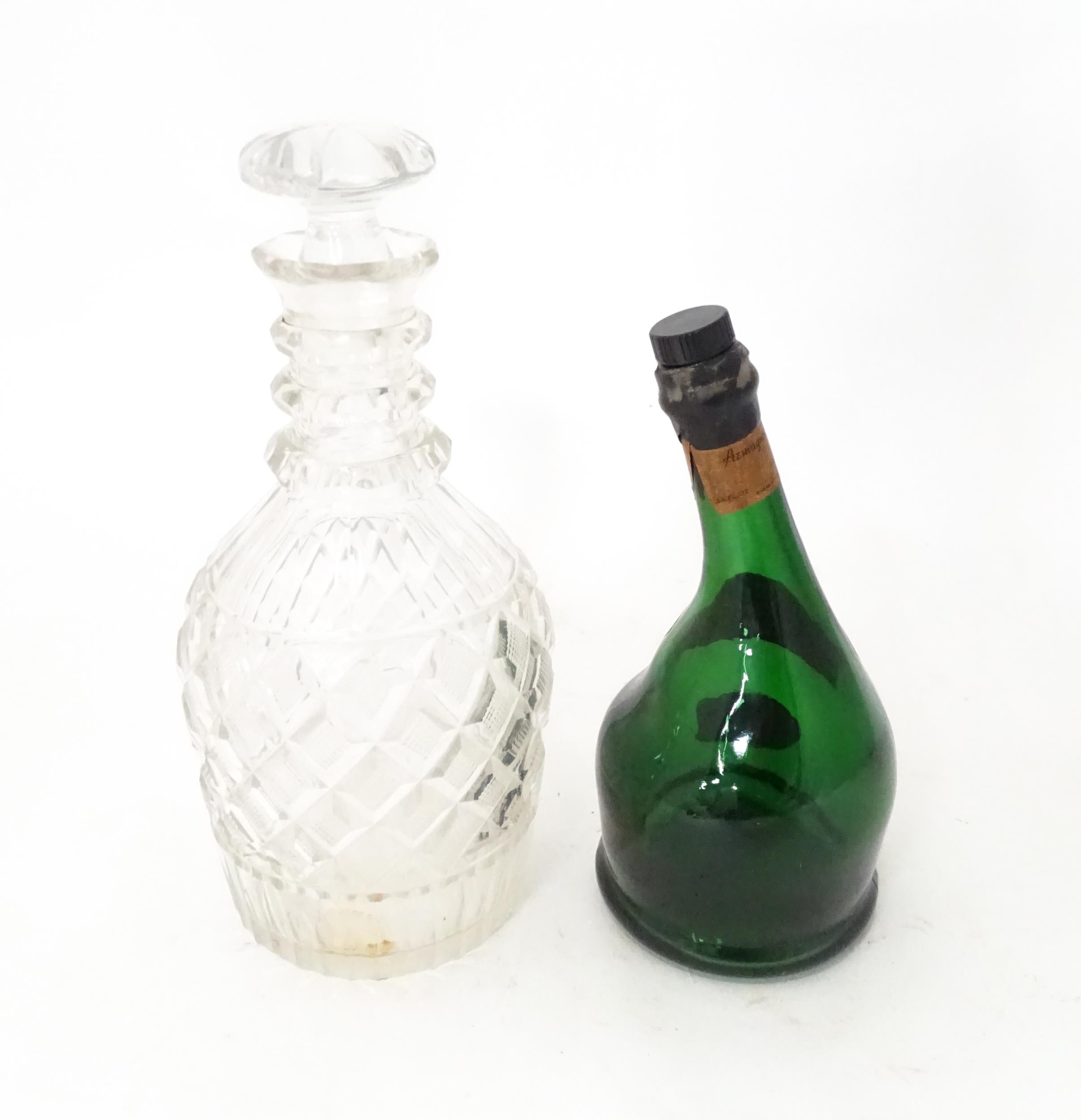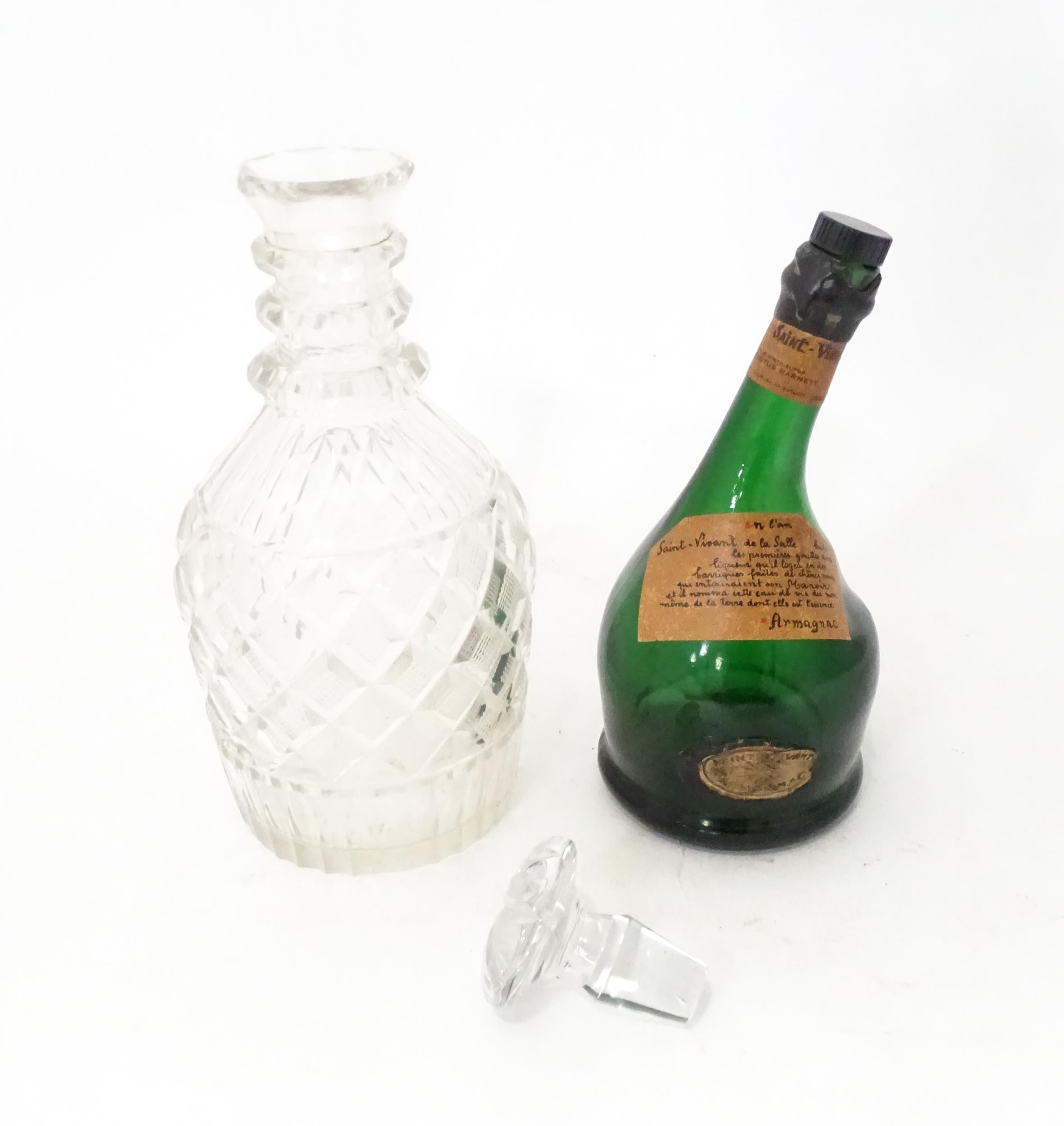 A 20thC cut glass decanter and stopper. Together with a shaped green bottle labelled Saint Vivant Armagnac. Decanter approx. 11 3/4" high (2)