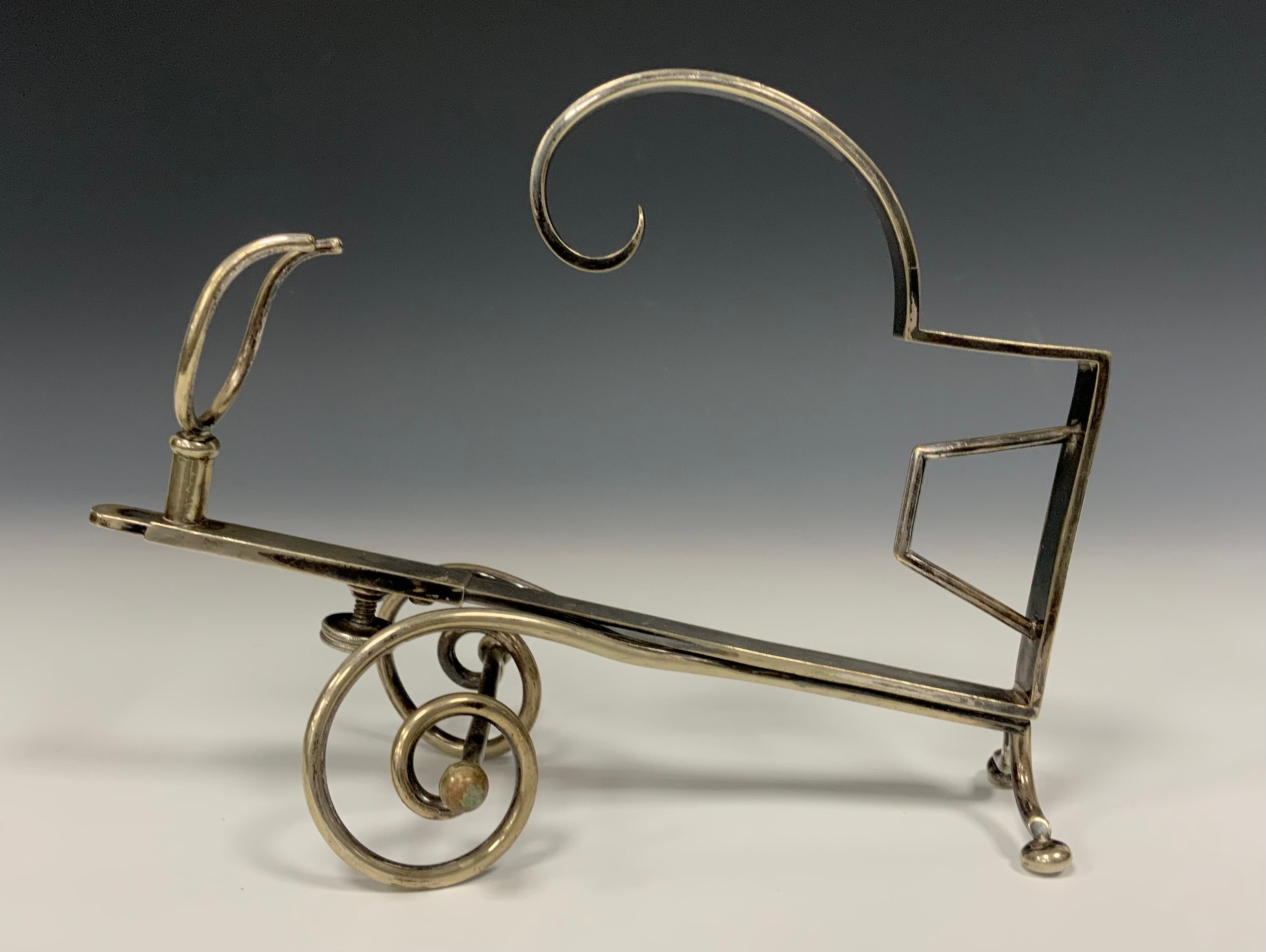 An early 20th century E.P.N.S patent adjustable wine bottle cradle or holder, 28cm long, numbered PT1773, c.1910