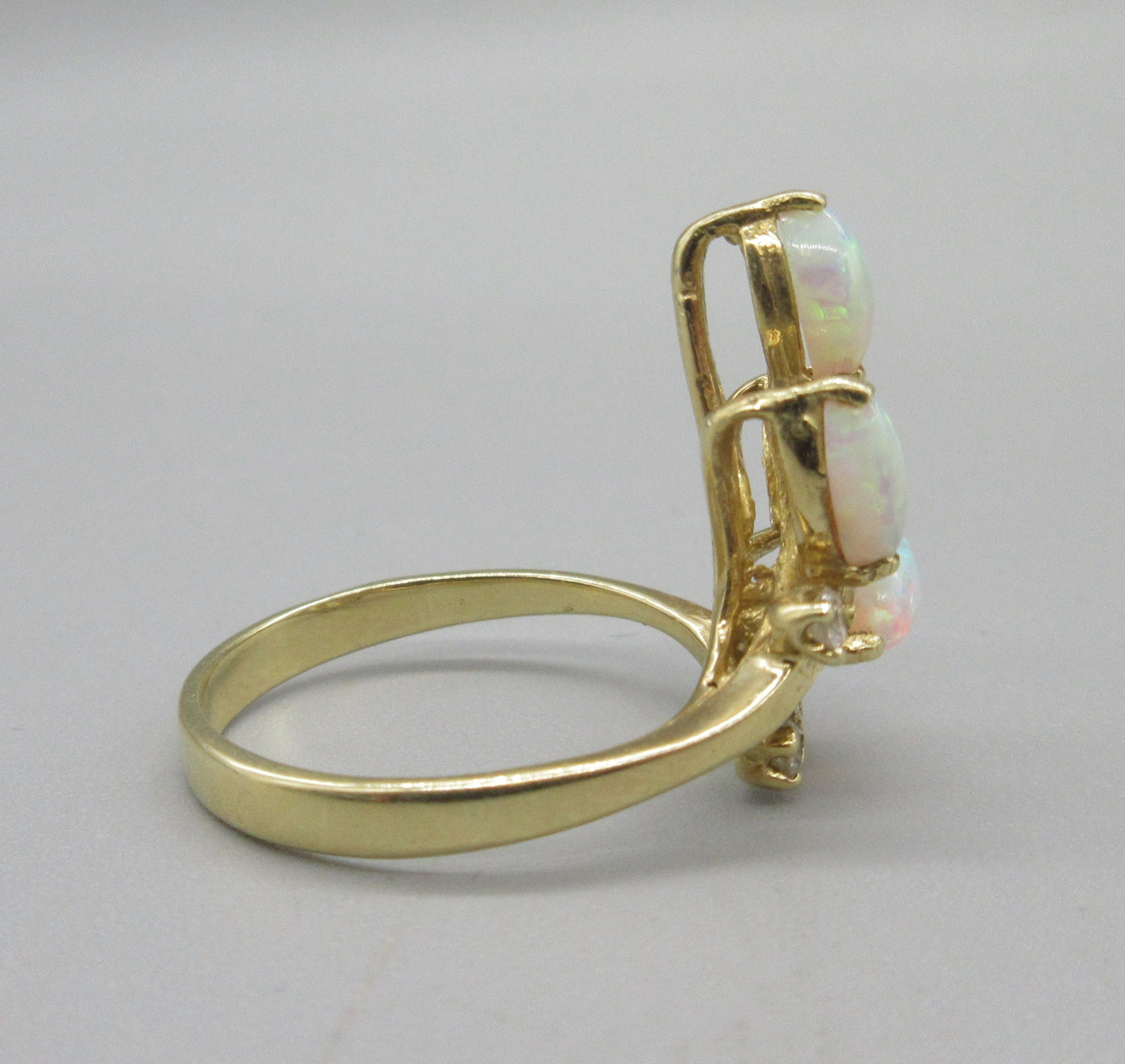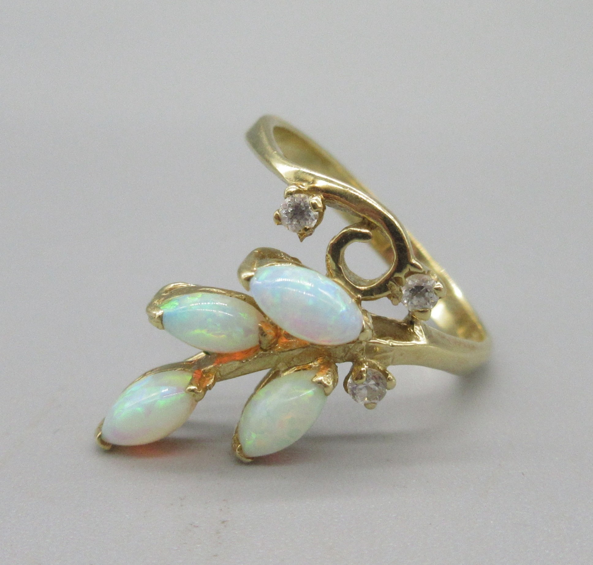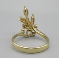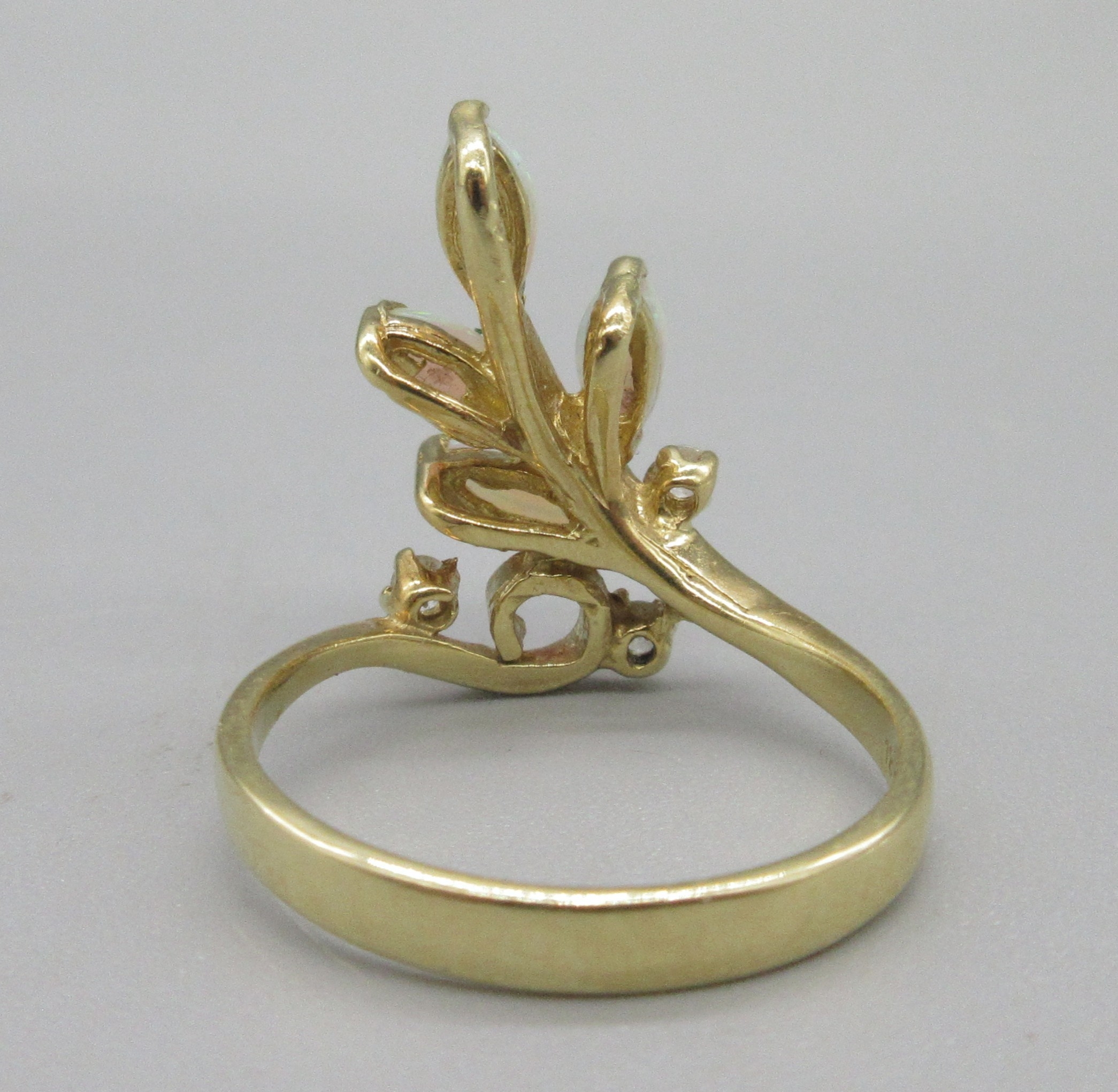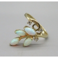18ct yellow gold opal and diamond ring, opals sprayed in leaf motif, stamped 18ct, size O, 4.3g