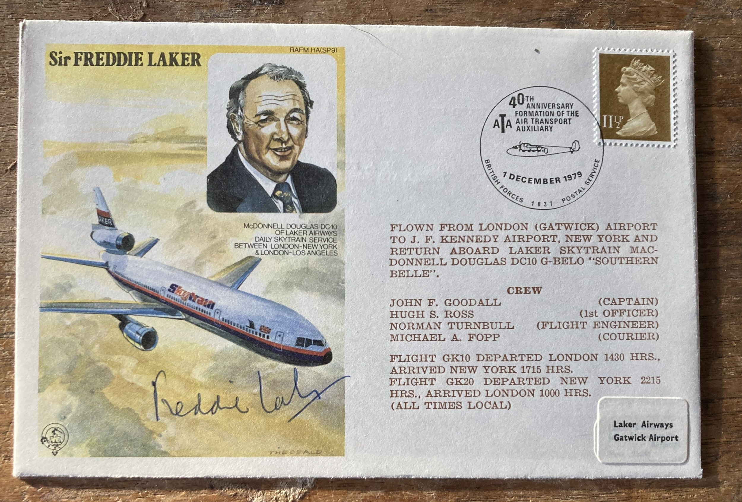 Aviation pioneer Sir Freddie Laker signed on his own historic aviators cover. ATA WW2, Sir Frederick Alfred Laker (6 August 1922 - 9 February 2006) was an English airline entrepreneur, best known for founding Laker Airways in 1966, which went bankrupt in 1982. Known as Freddie Laker, he was one of the first airline owners to adopt the "low cost / no-frills" airline business model that has since proven to be successful worldwide when employed by companies such as Ryanair, Southwest Airlines, easyJet, Norwegian Air, and AirAsia. Single Vendor collection. Good condition. We combine postage on multiple winning lots and can ship worldwide. UK postage from £5.99, EU from £7.99, Rest of World from £9.99.