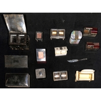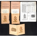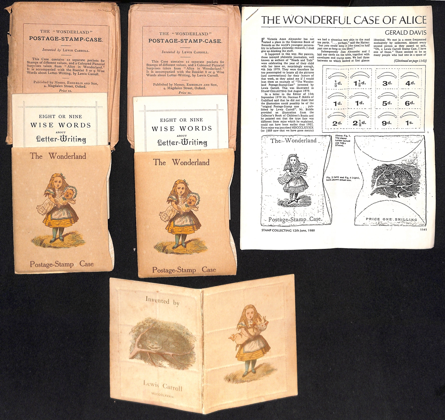 Stamp Boxes. Two examples of The "Wonderland" Postage Stamp Case, both within card folders, together with the booklets "Eight or Nine Wise Words about Letter Writing" by Lewis Carroll, all within a printed envelope. Also a third example of the card case (missing the folder, booklet and envelope), all three stamp cases with a picture of Alice in slightly differing colours.