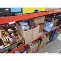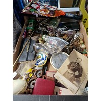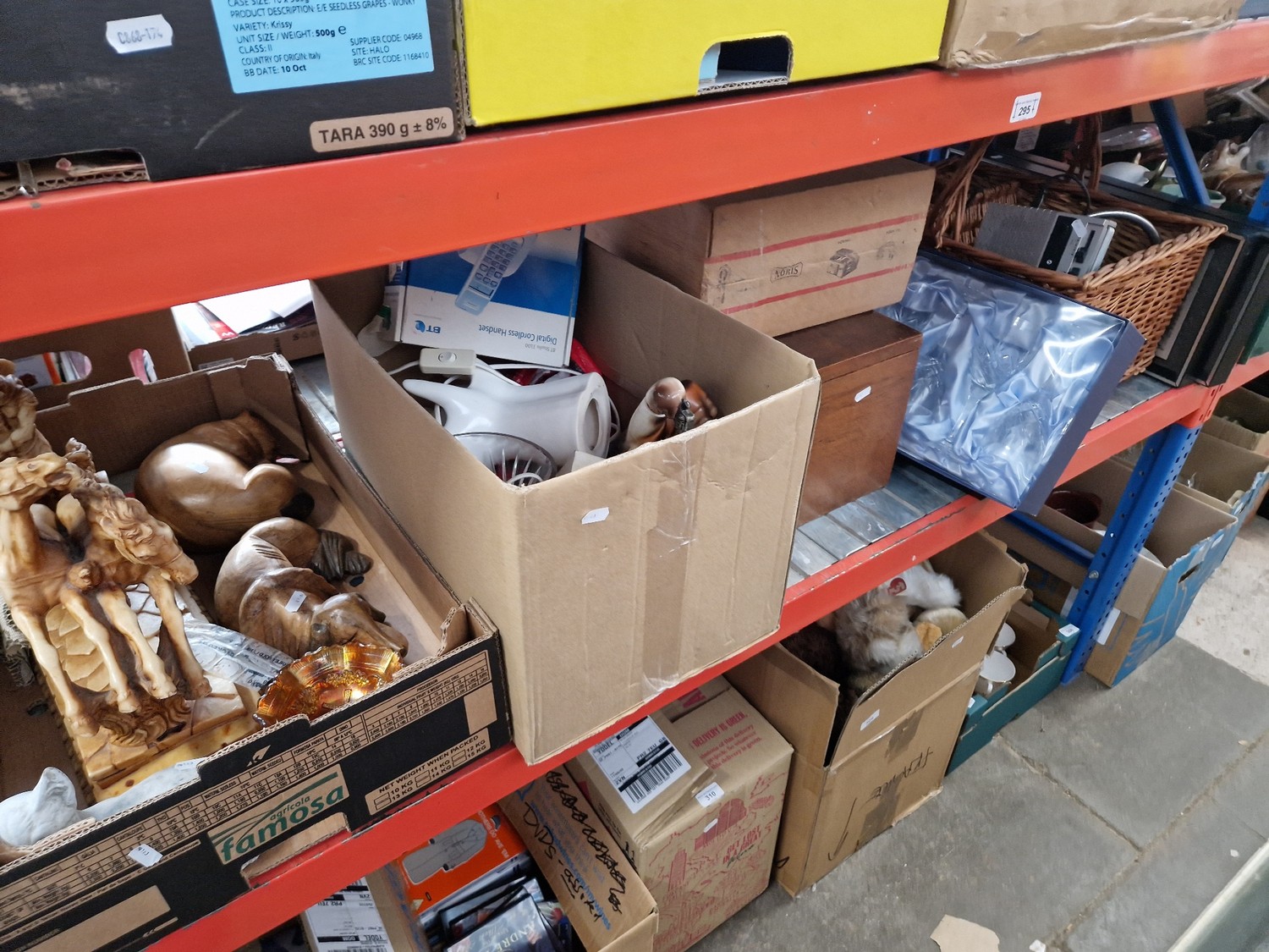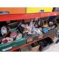 A wicker basket and contents, a wooden sewing box, a box of glassware, a slide projector, two boxes of ornaments, table lamps etc