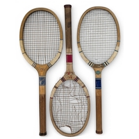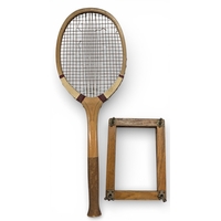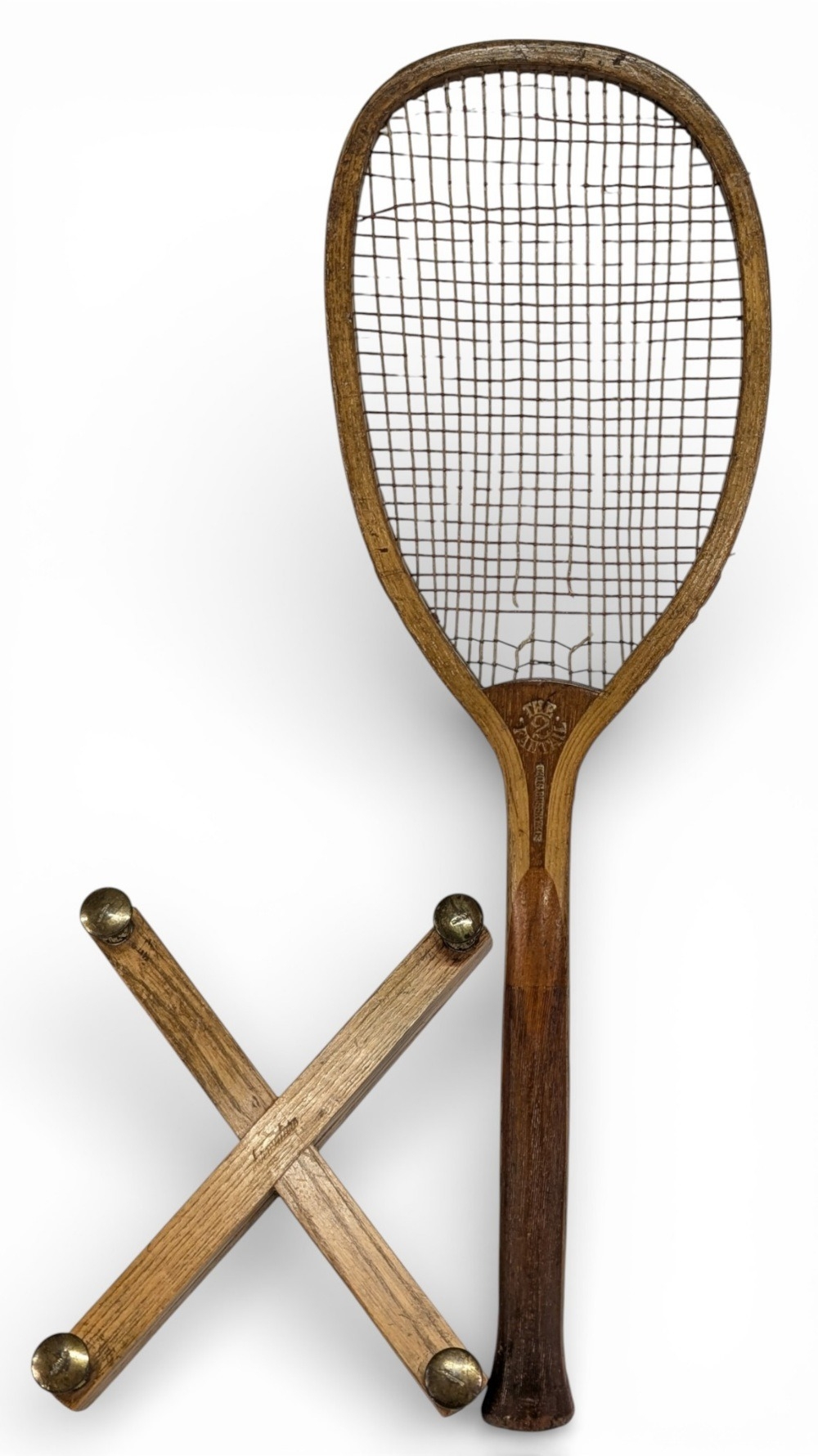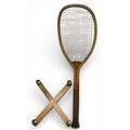 c1896 G G Bussey Fantail 2 Tennis Racket, slightly lopsided as sold by Bussey, red gut strings, with slight wear, pronounced fantail comes with a fine G G Bussey Armature X racket press with brass fittings