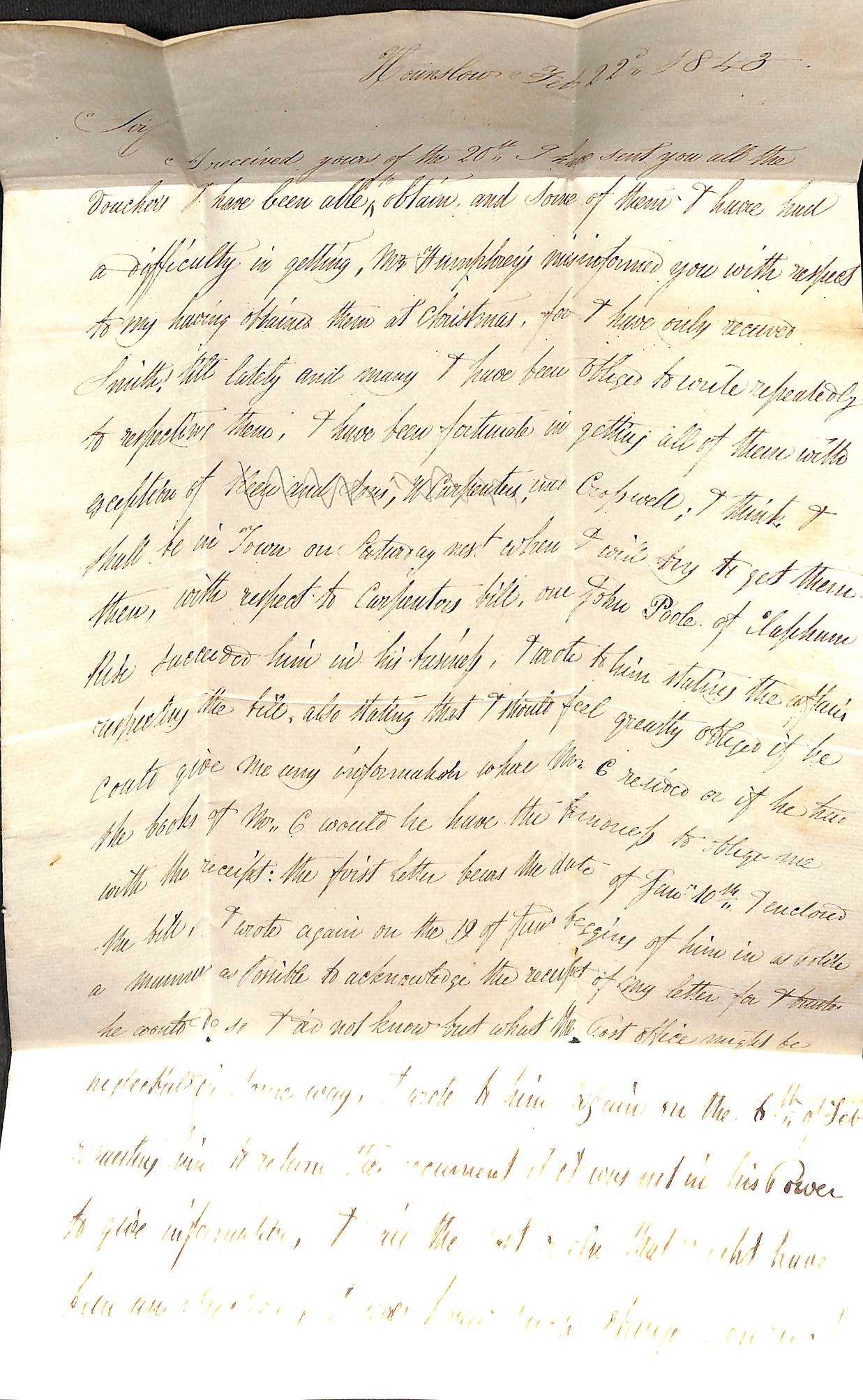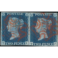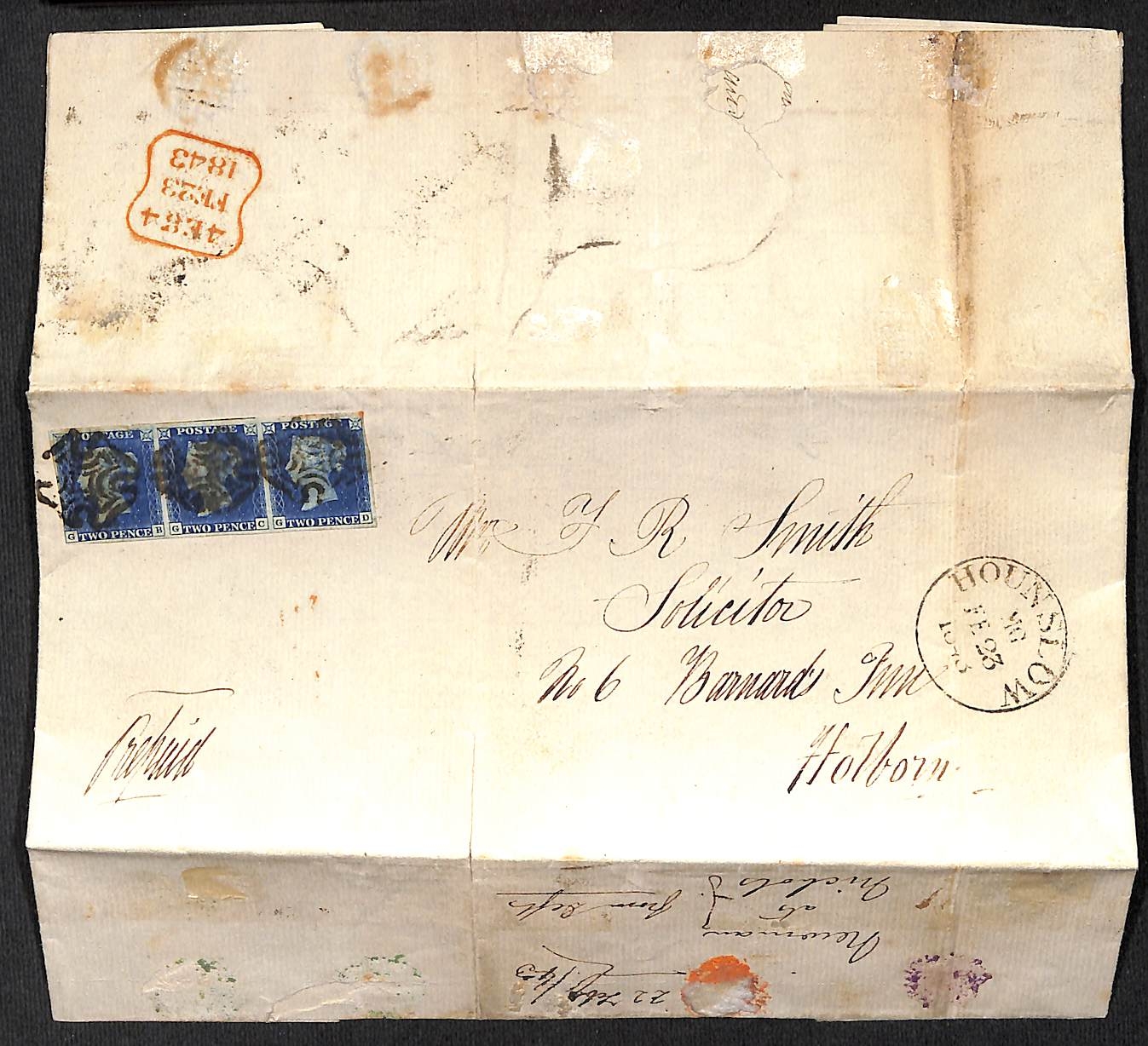 1843 (Feb 23) Long entire from Hounslow to Holborn bearing 1840 2d blue plate 1 GB-GD strip of three, small to large margins, each with a black Maltese Cross cancel, large Hounslow country sorting office type datestamp on the front, vertical file folds well away from the stamps. A good late use of the 1840 2d on a letter of 2-3oz.