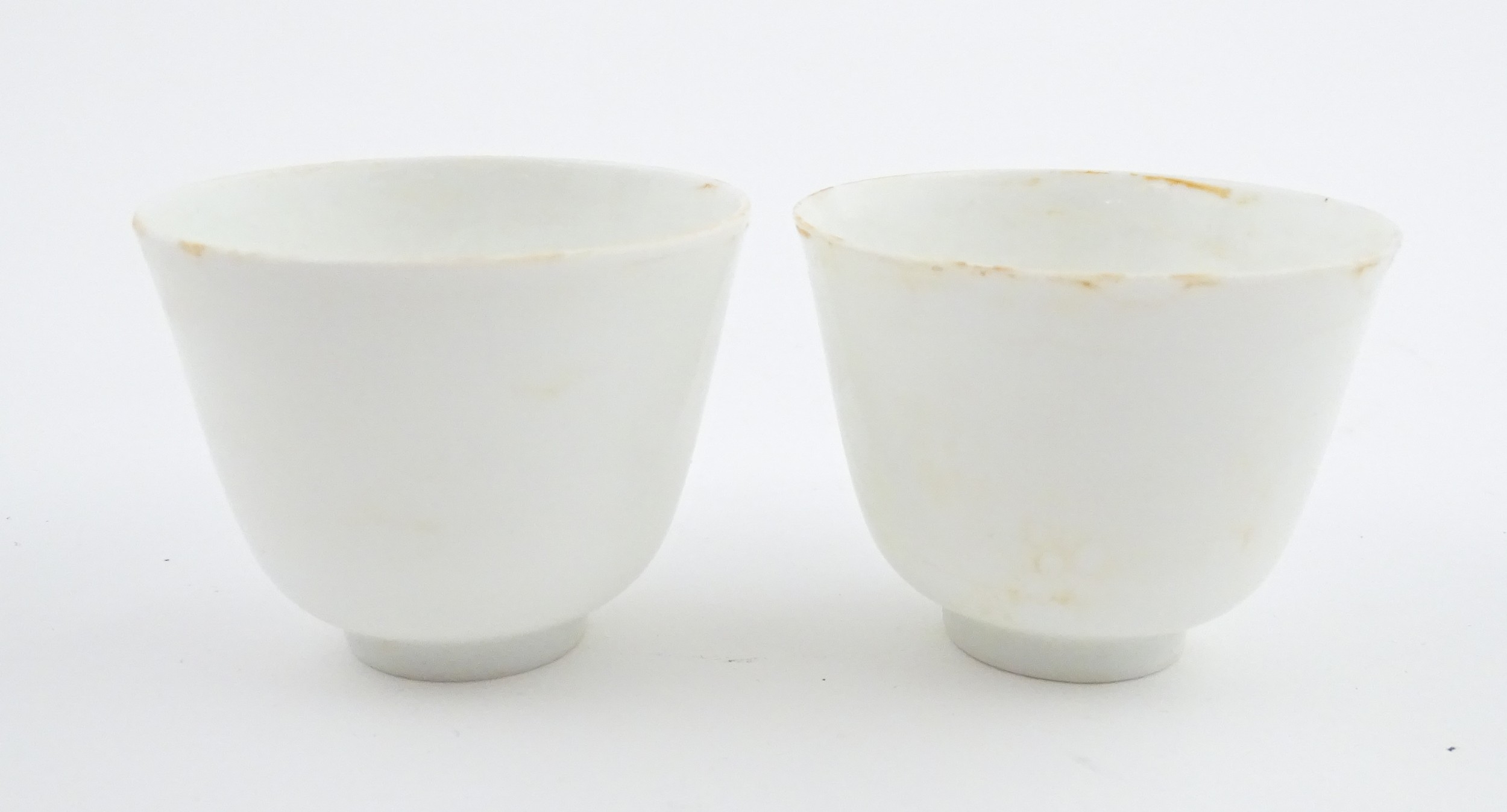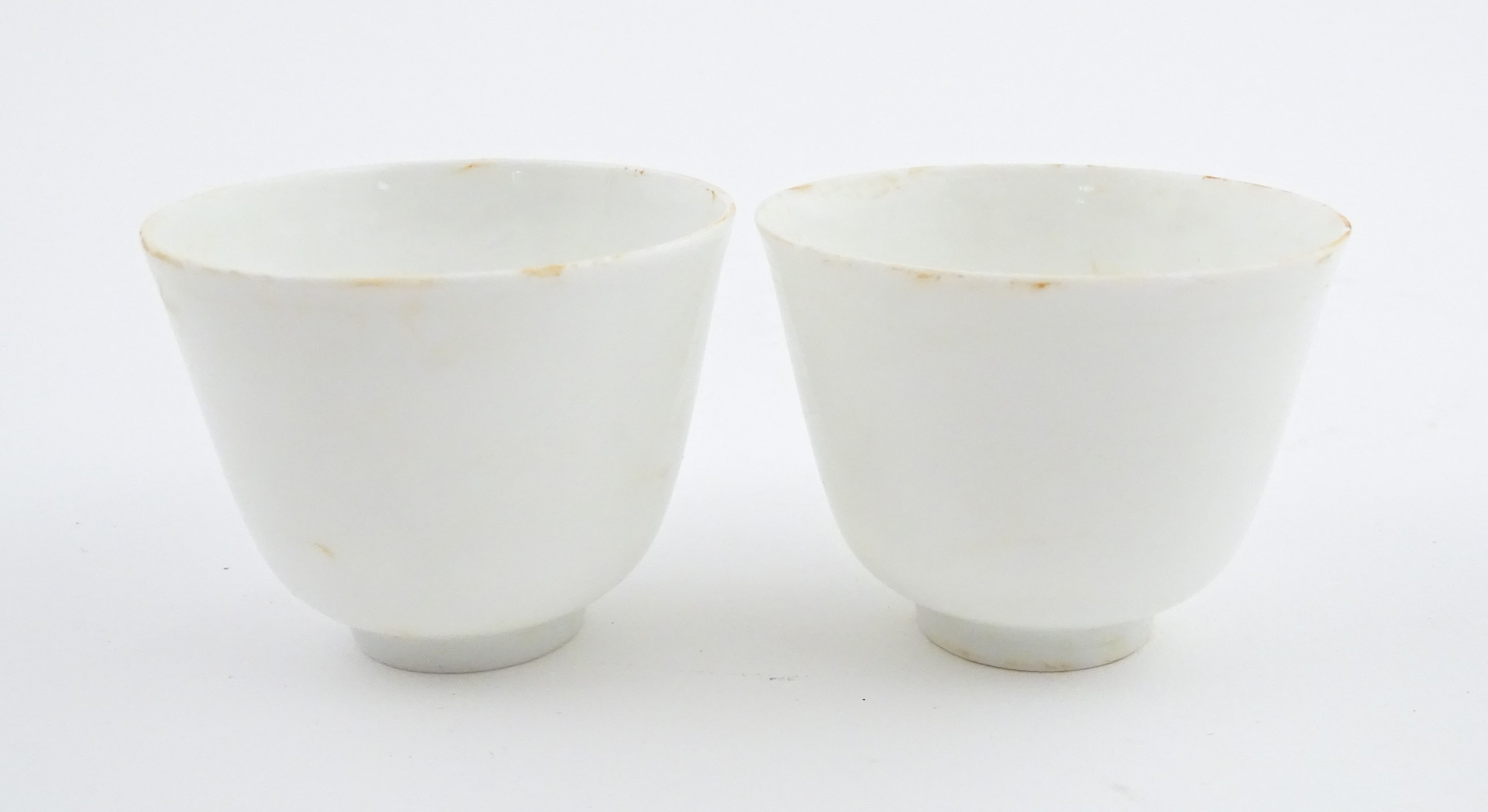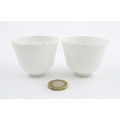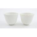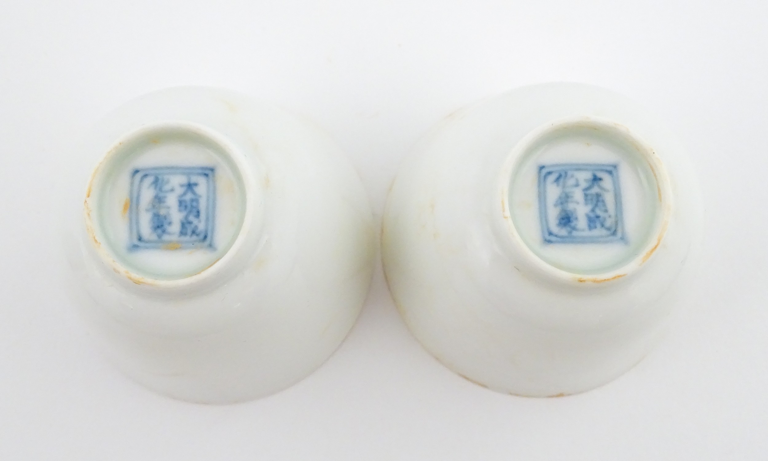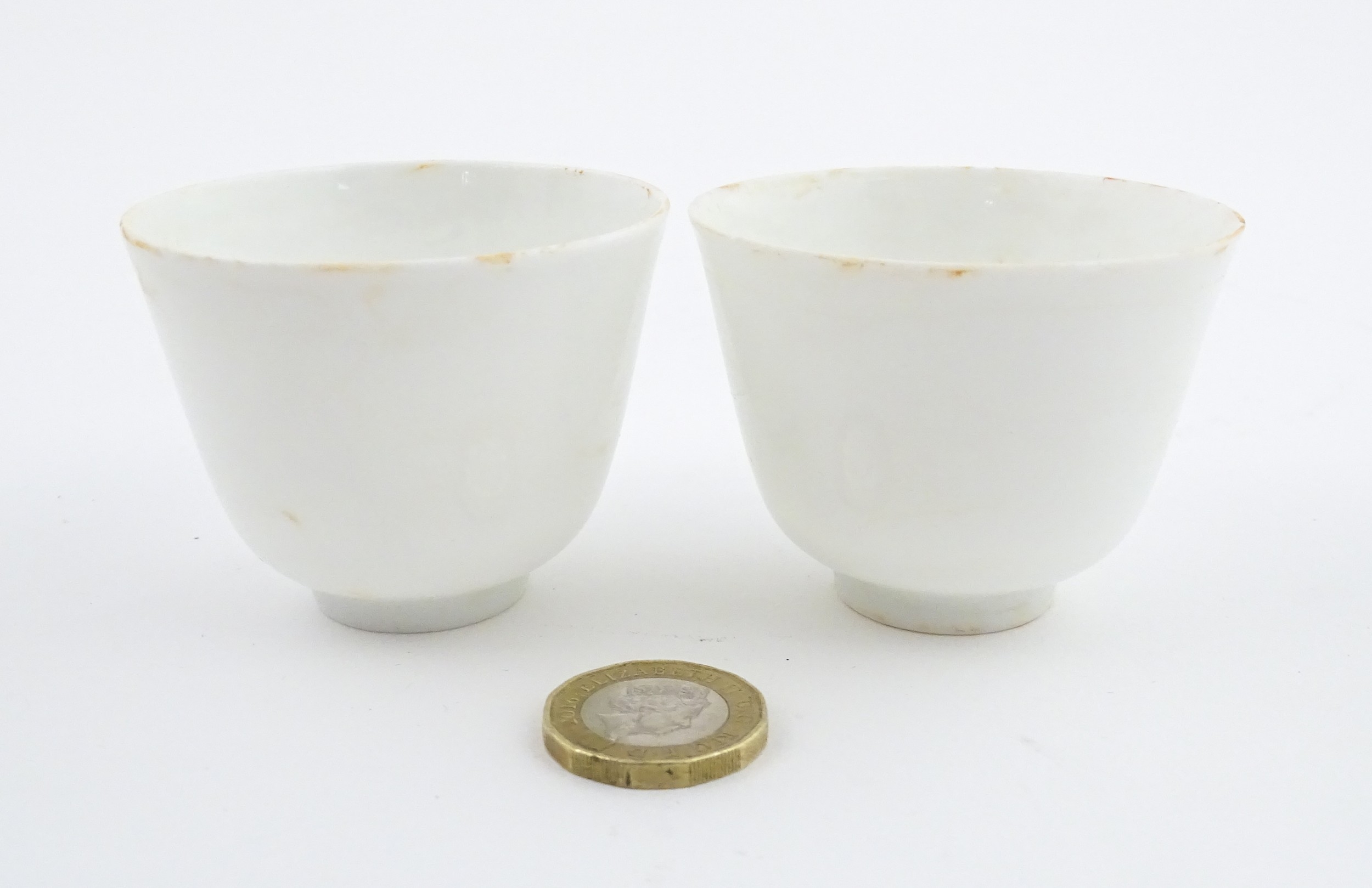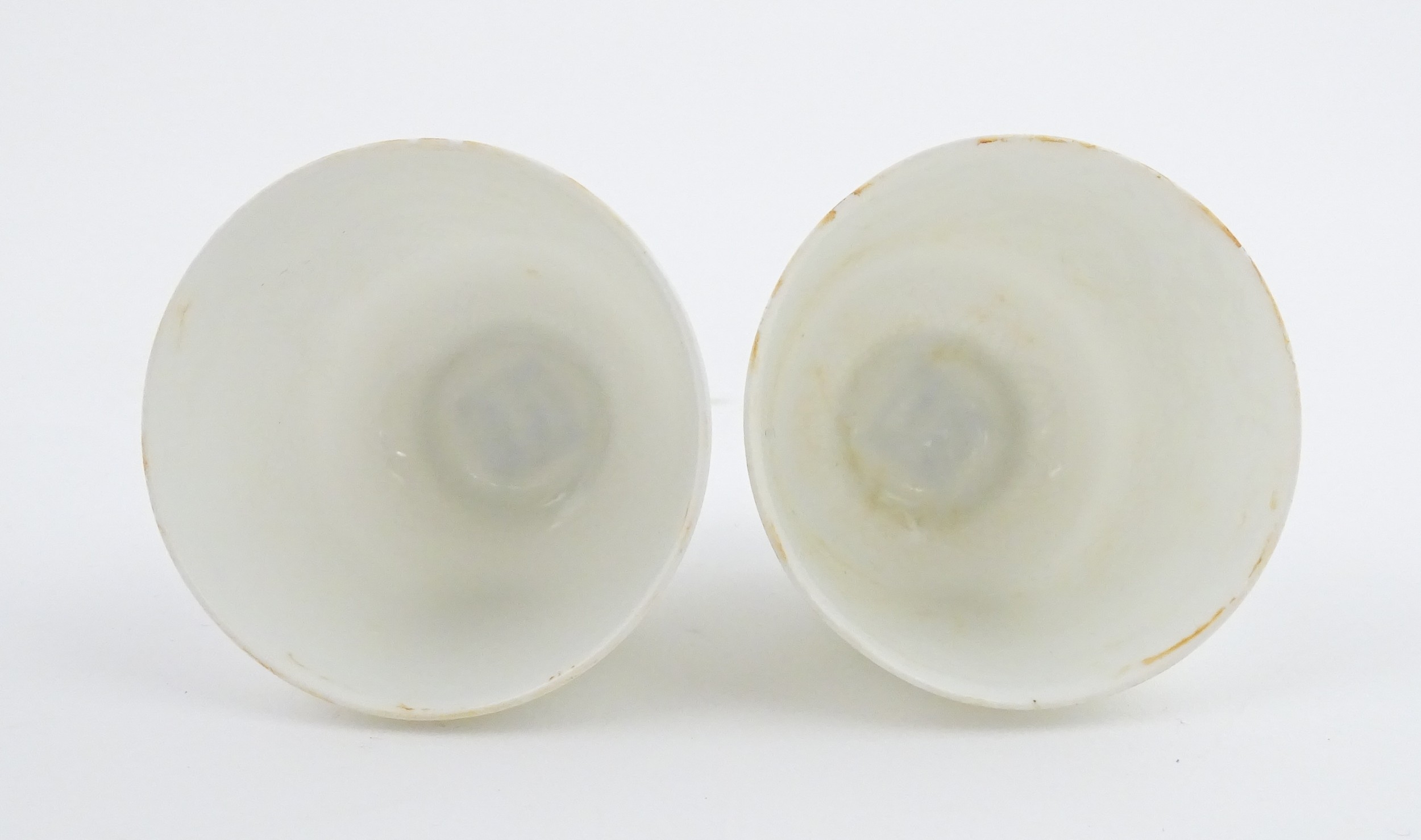 A pair of Chinese wine cups with floral detail. Character marks under. Approx. 2" high (2)