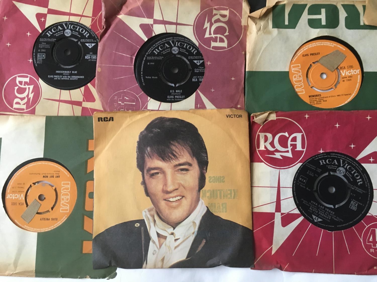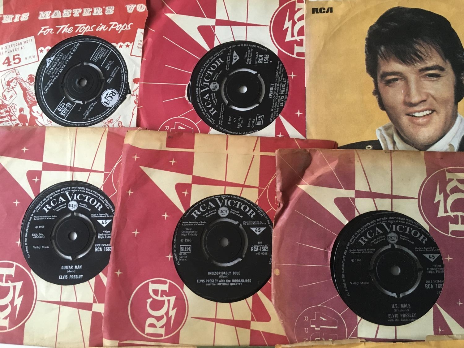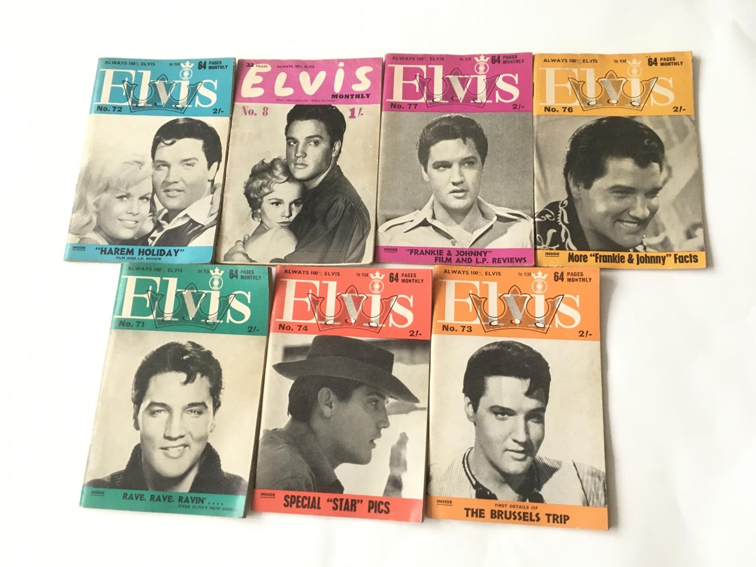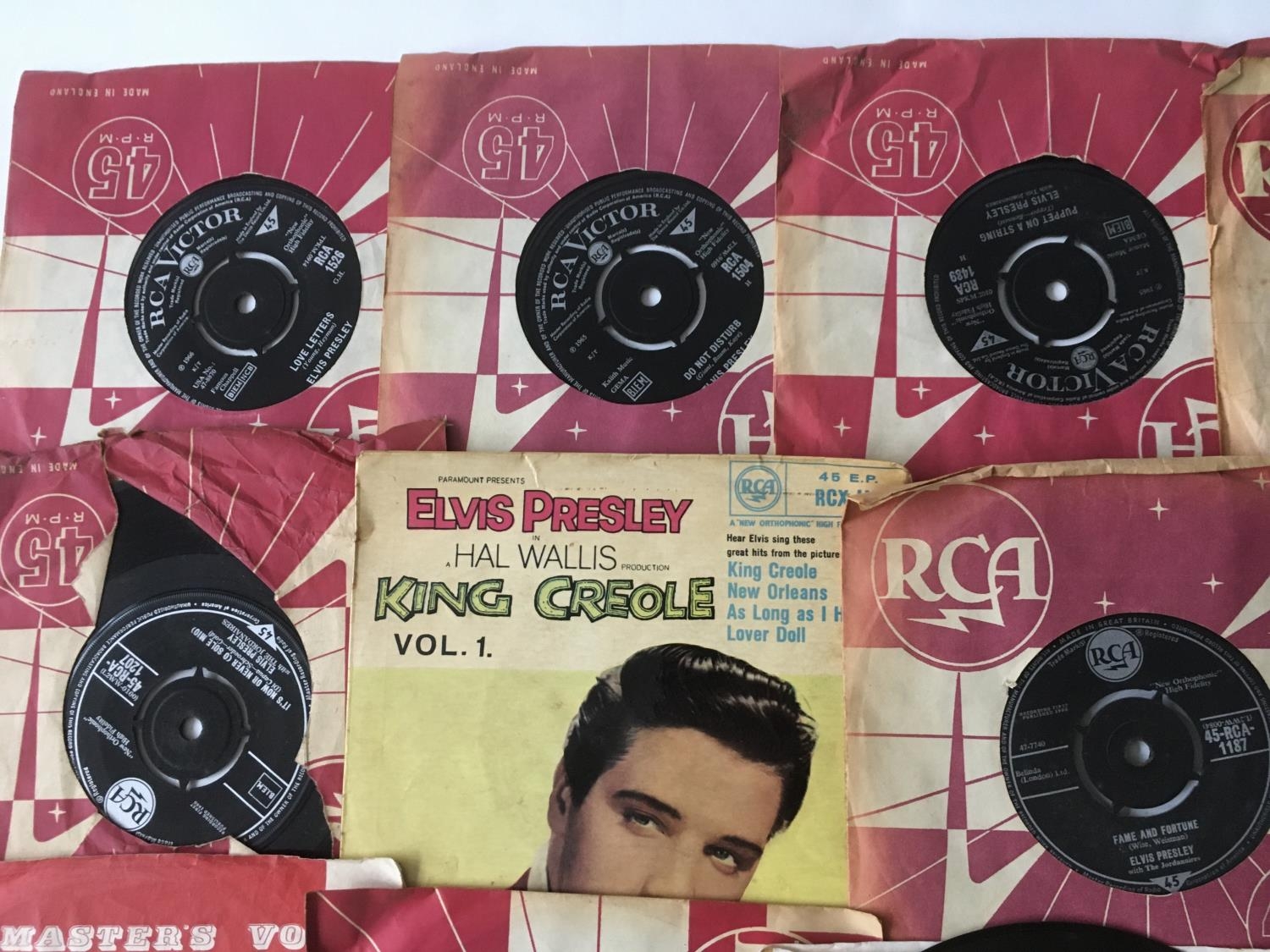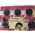 A record box containing Elvis Presley 7inch singles and EPs and seven Elvis monthly magazines.