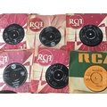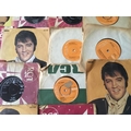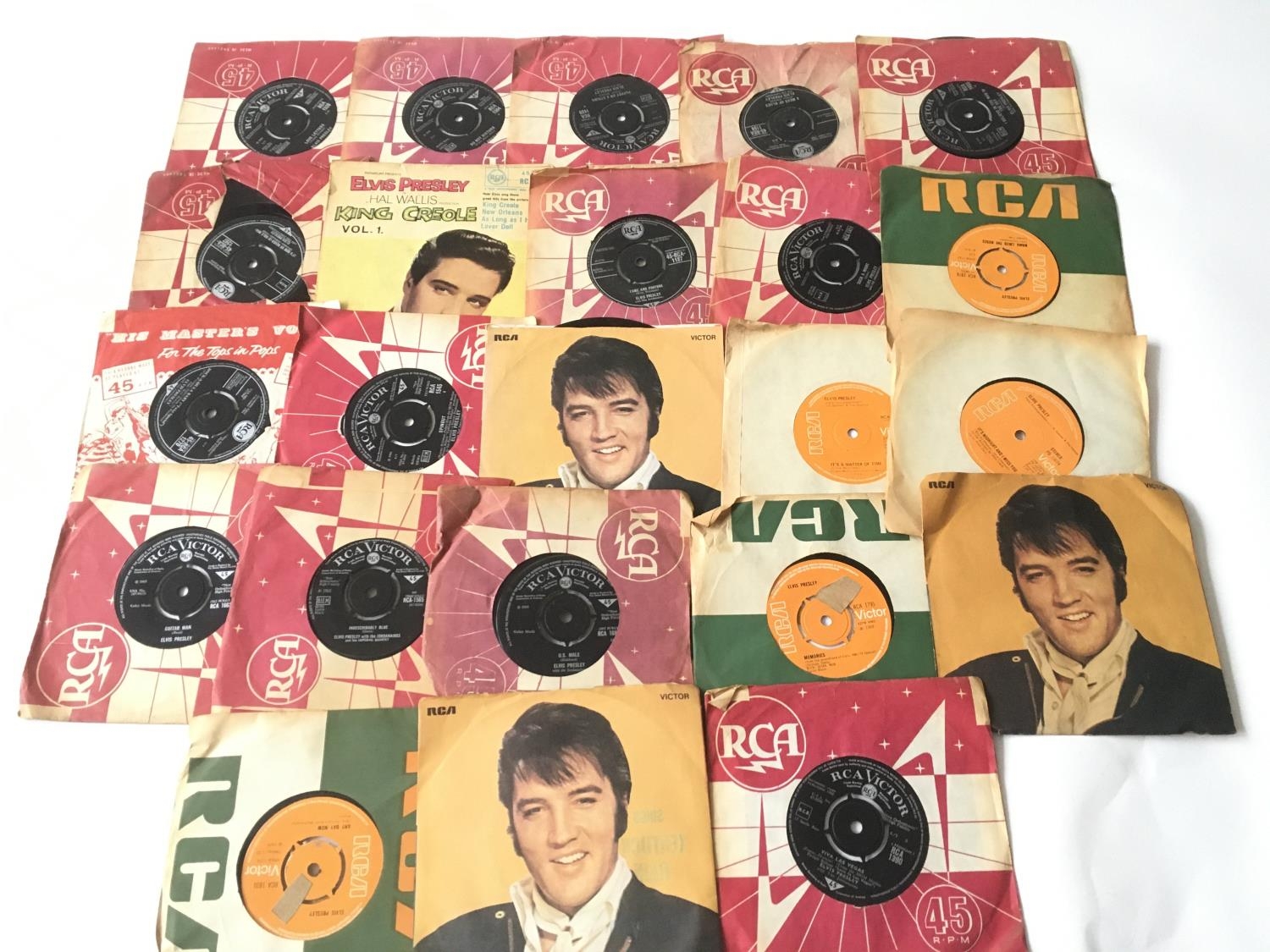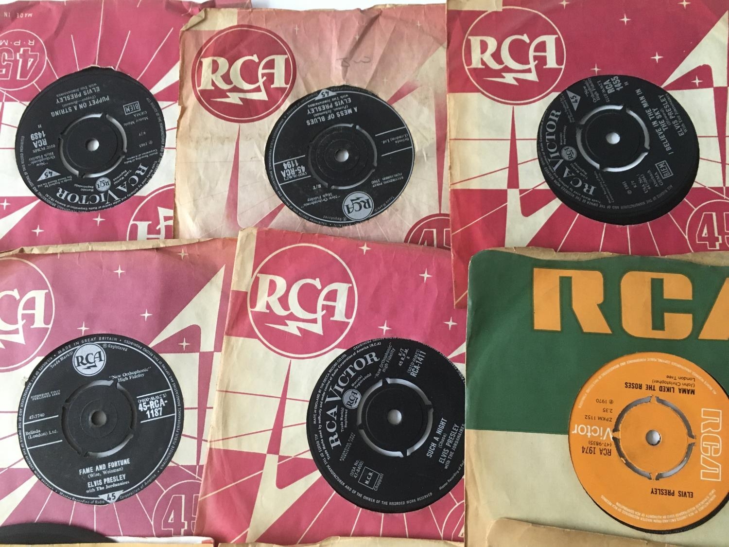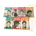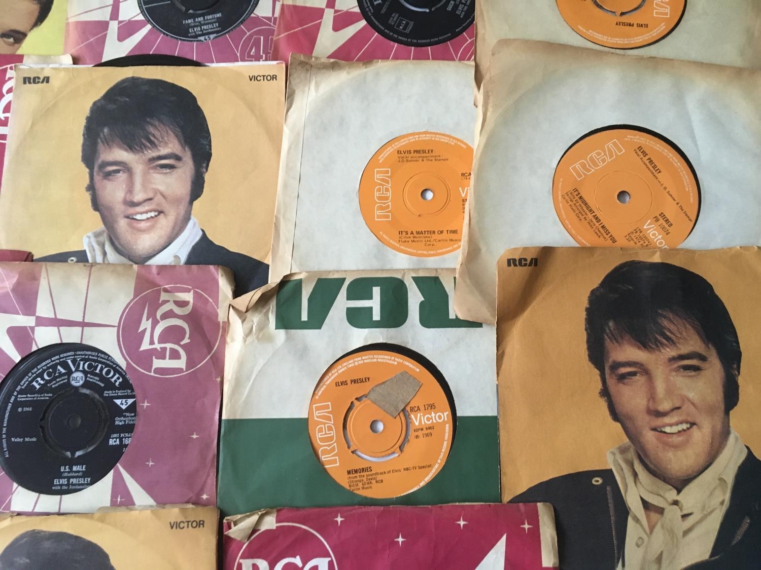 A record box containing Elvis Presley 7inch singles and EPs and seven Elvis monthly magazines.