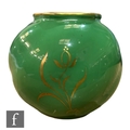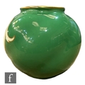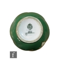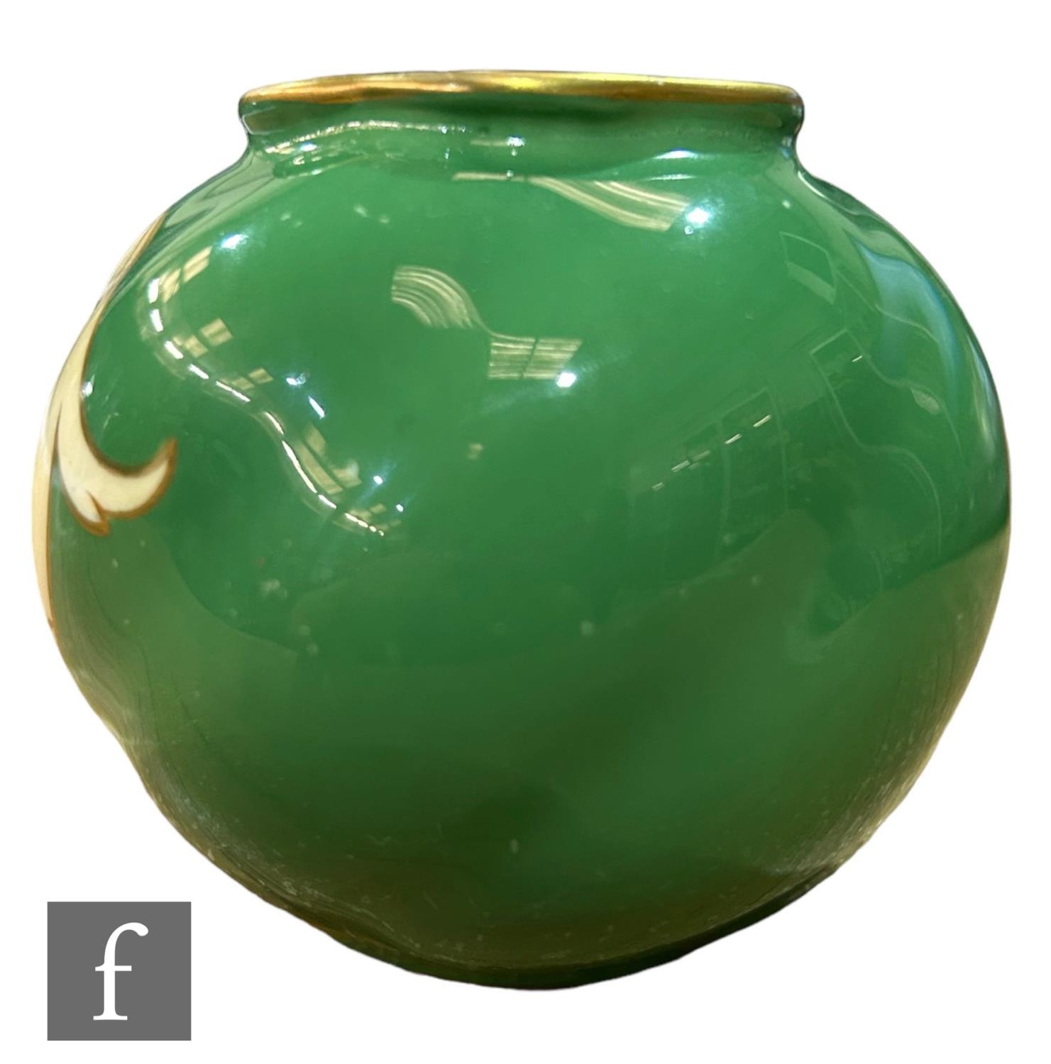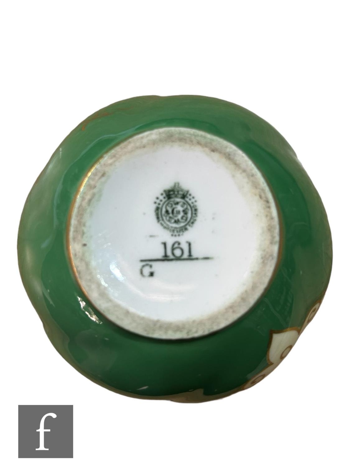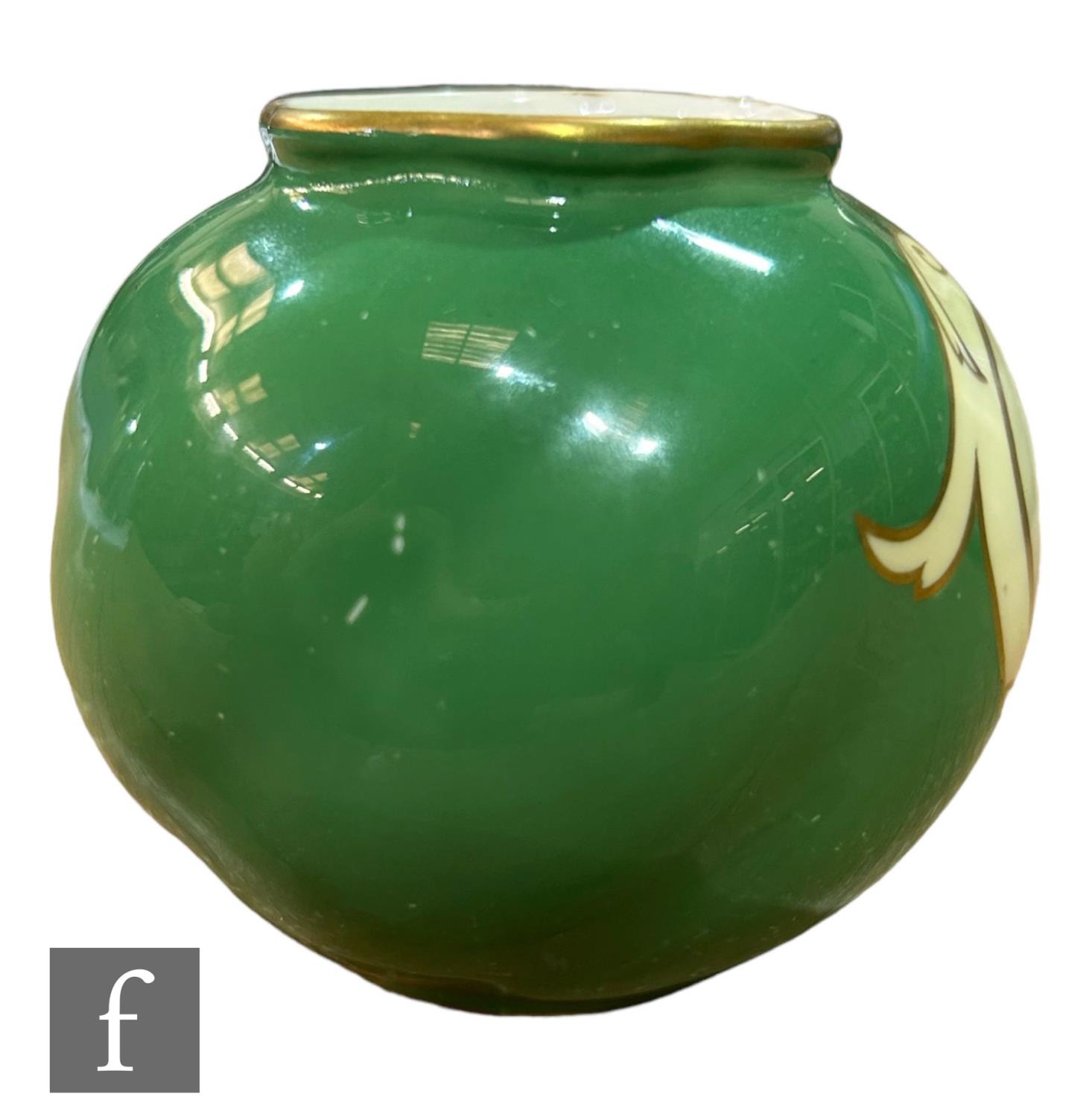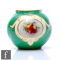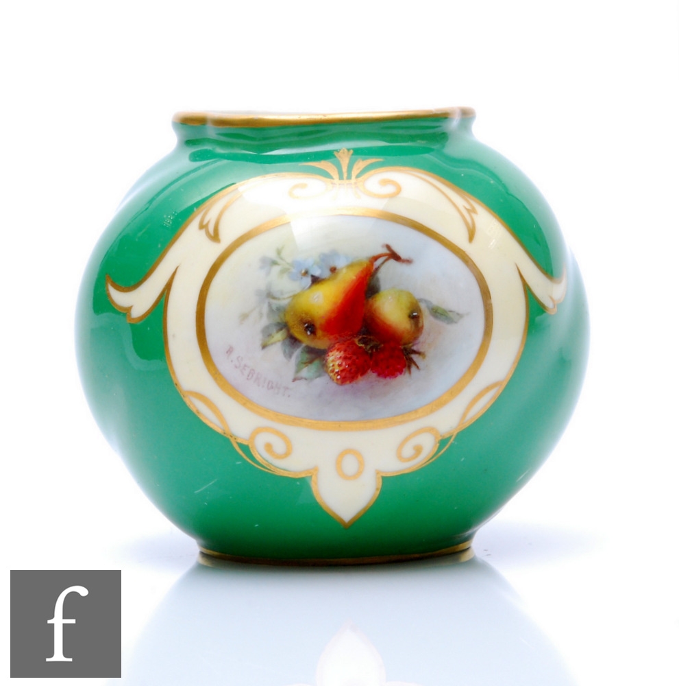 A small Royal Worcester shape G161 ovoid vase decorated with a hand painted cartouche by Sebright with pears and raspberries against an ivory ground to a pea green ground body, green printed mark with date code for 1907, height 6.5cm.