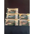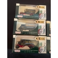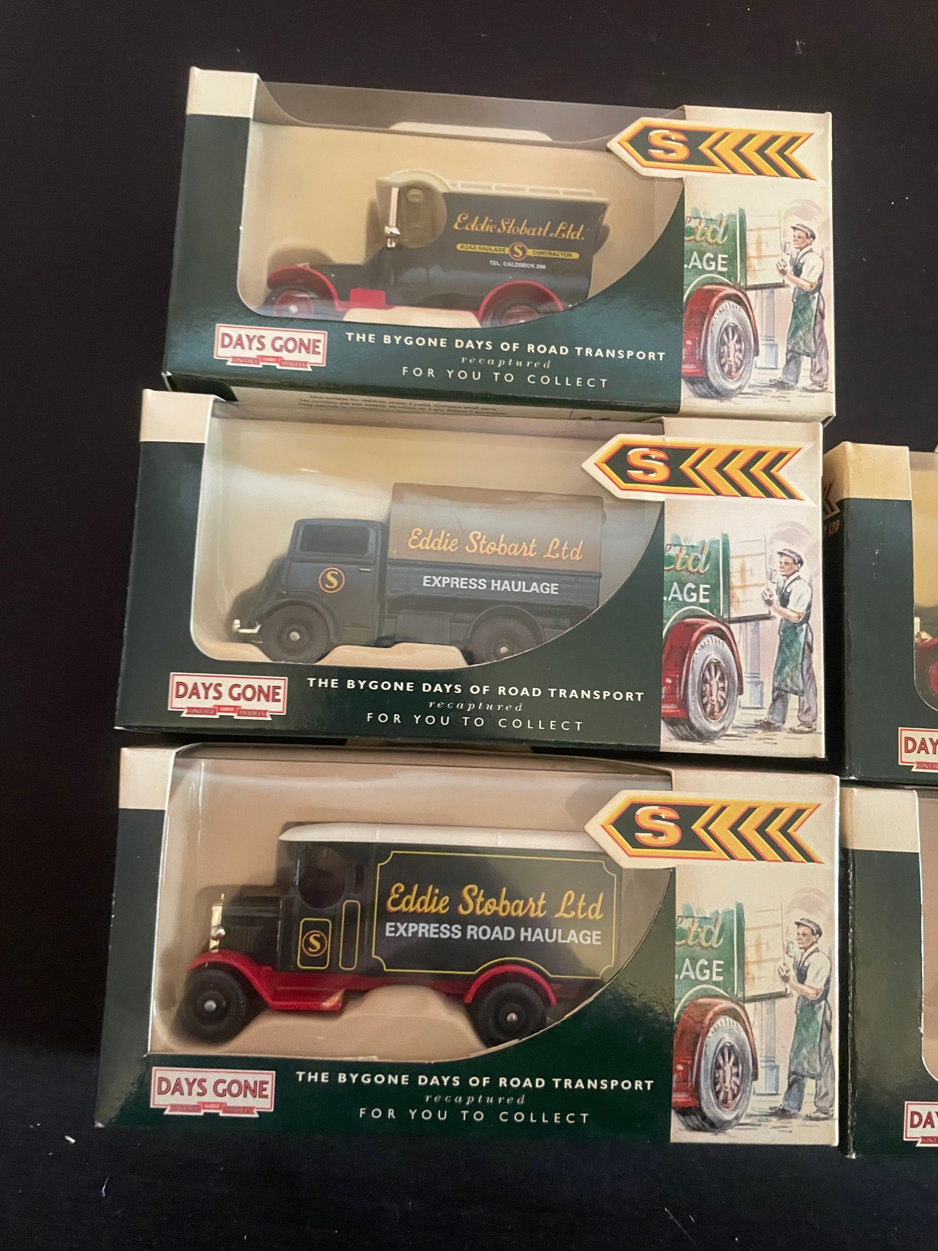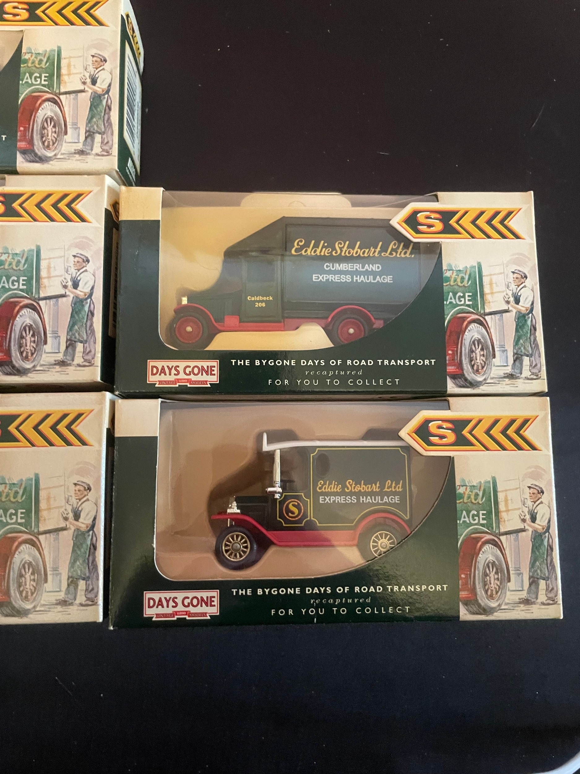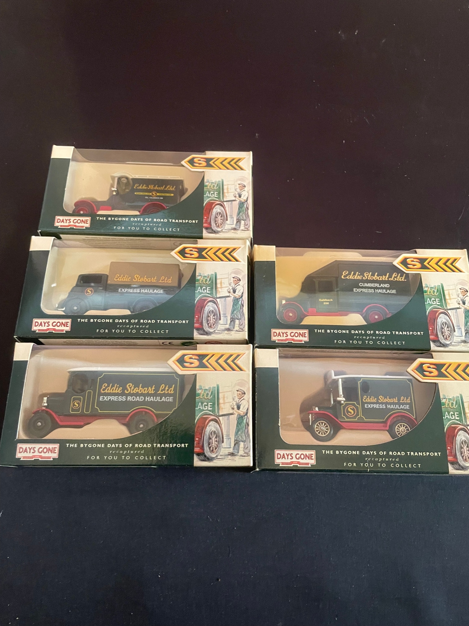 A group of five Lledo Days Gone Eddie Stobart die-cast model trucks, depicting vintage commercial vehicles associated with 'Eddie Stobart Ltd.' and 'Cumberland Express Haulage.' Each model, made of die-cast metal and plastic, is presented in its original, unopened cardboard window box, bearing text such as "THE BYGONE DAYS OF ROAD TRANSPORT recaptured FOR YOU TO COLLECT" and specific vehicle names like "Coldbeck 294."