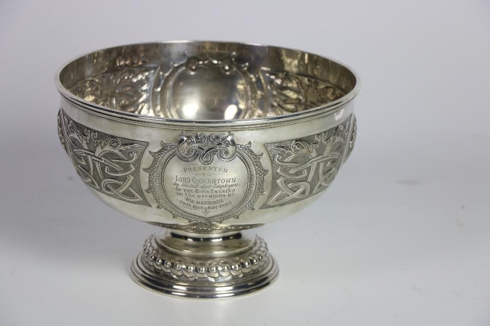 Local InterestA very attractive large early 20th Century Irish Presentation silver Punch Bowl, profusely decorated with heavy Celtic designs, Dublin c. 1905, maker J.S. distributor Morrisons, Birr, approx. 26.5cms diameter x 18cms high (10 1/2" x 7 1/4"), c. 43 ozs. (1)* Presentation reads, "Presented to Lord Oxmantown by the Out-door Employees of the Birr Estates on the occasion of His Marriage 19th October 1905."