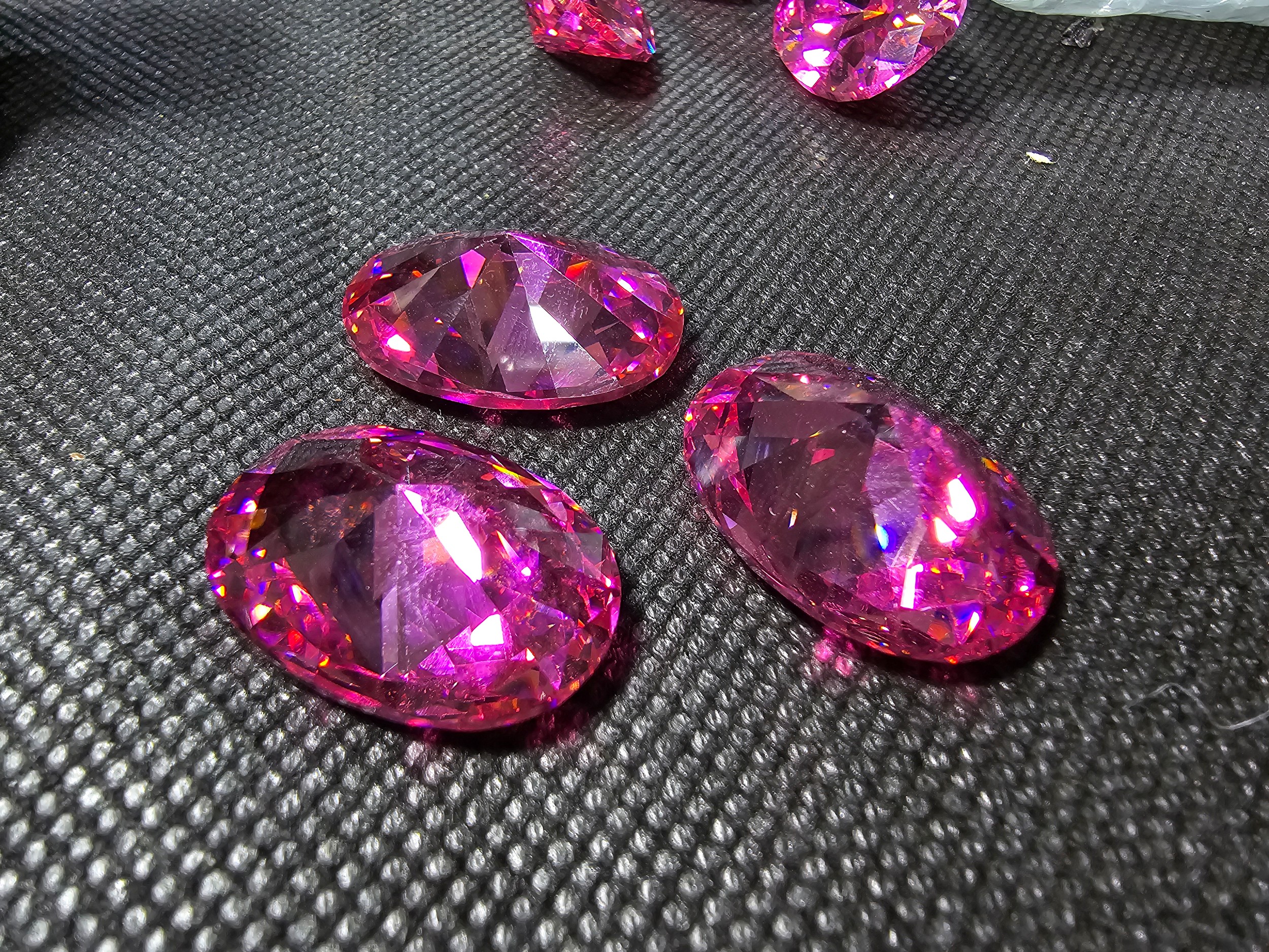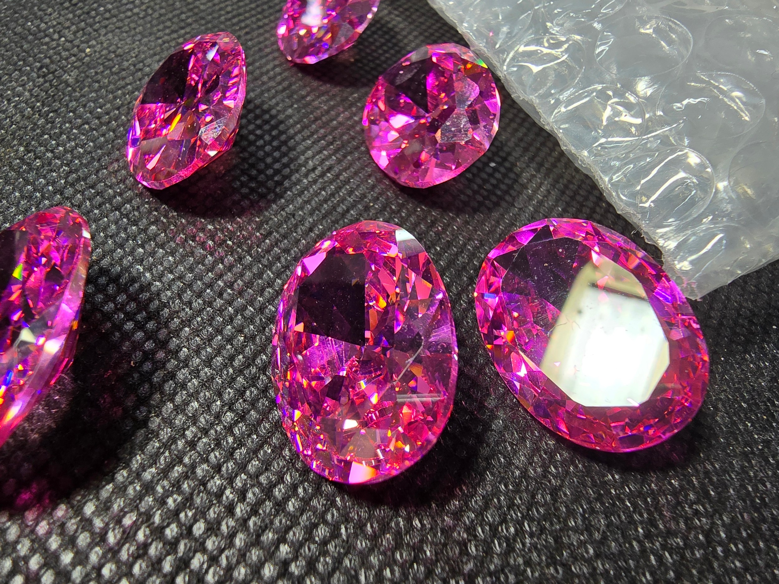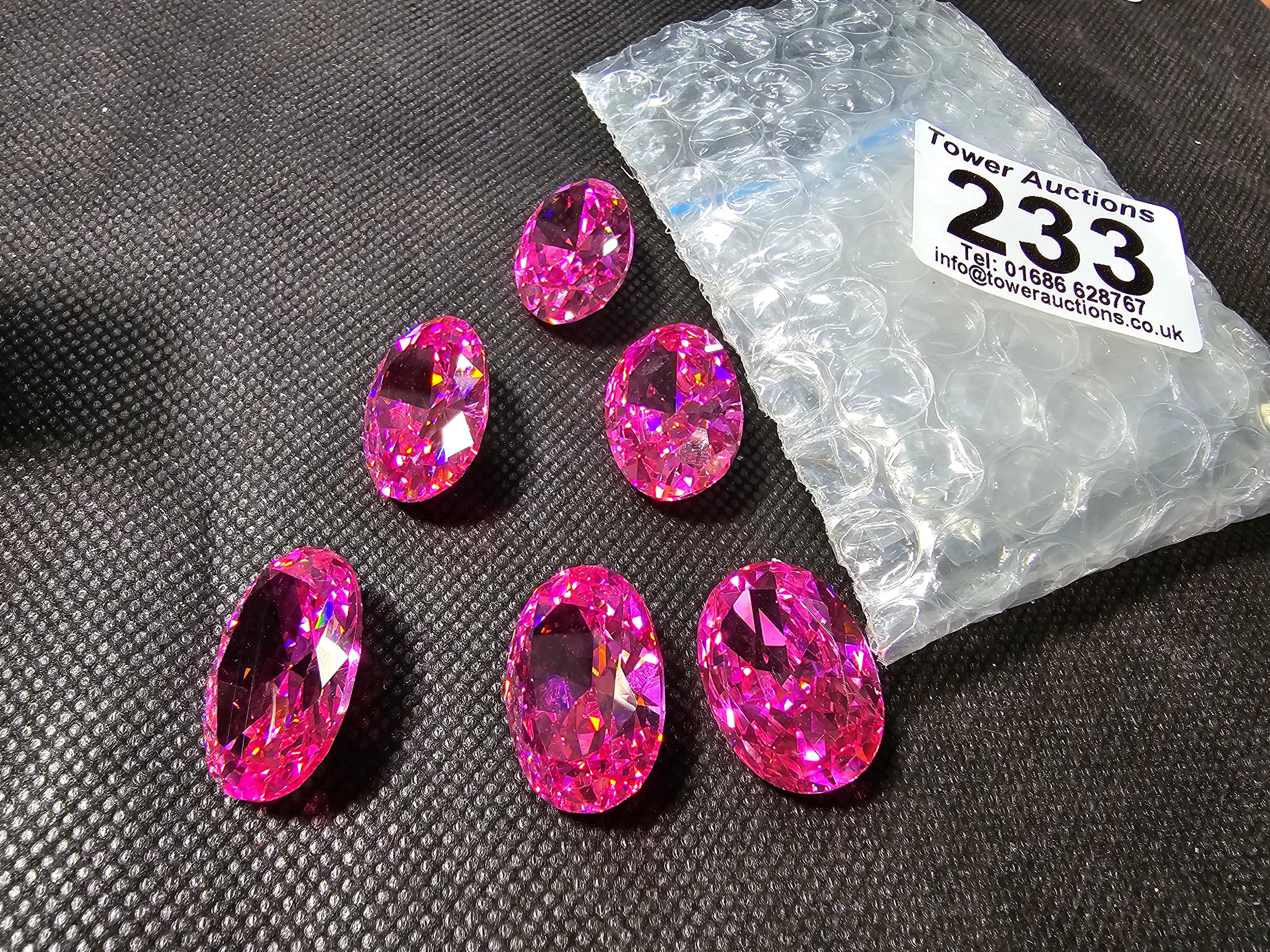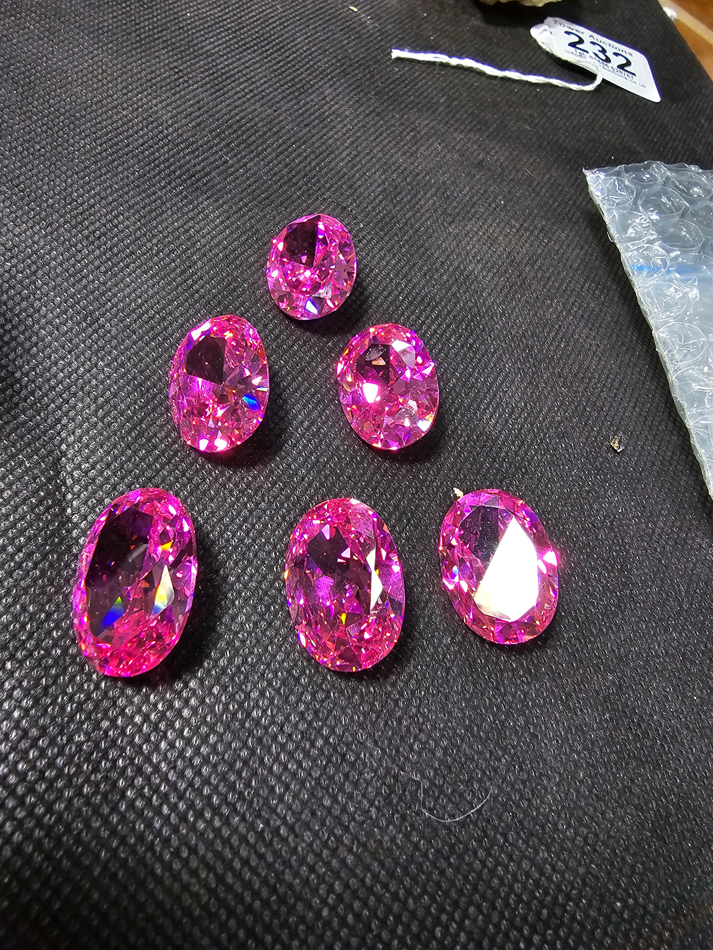 A large collection of 6x large pink faceted crystal glass stones which are imitation sapphires. The light shines through the stones beautifully and would be ideal to set into jewellery. Each stone is 25mm x 20mm
