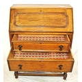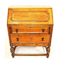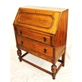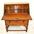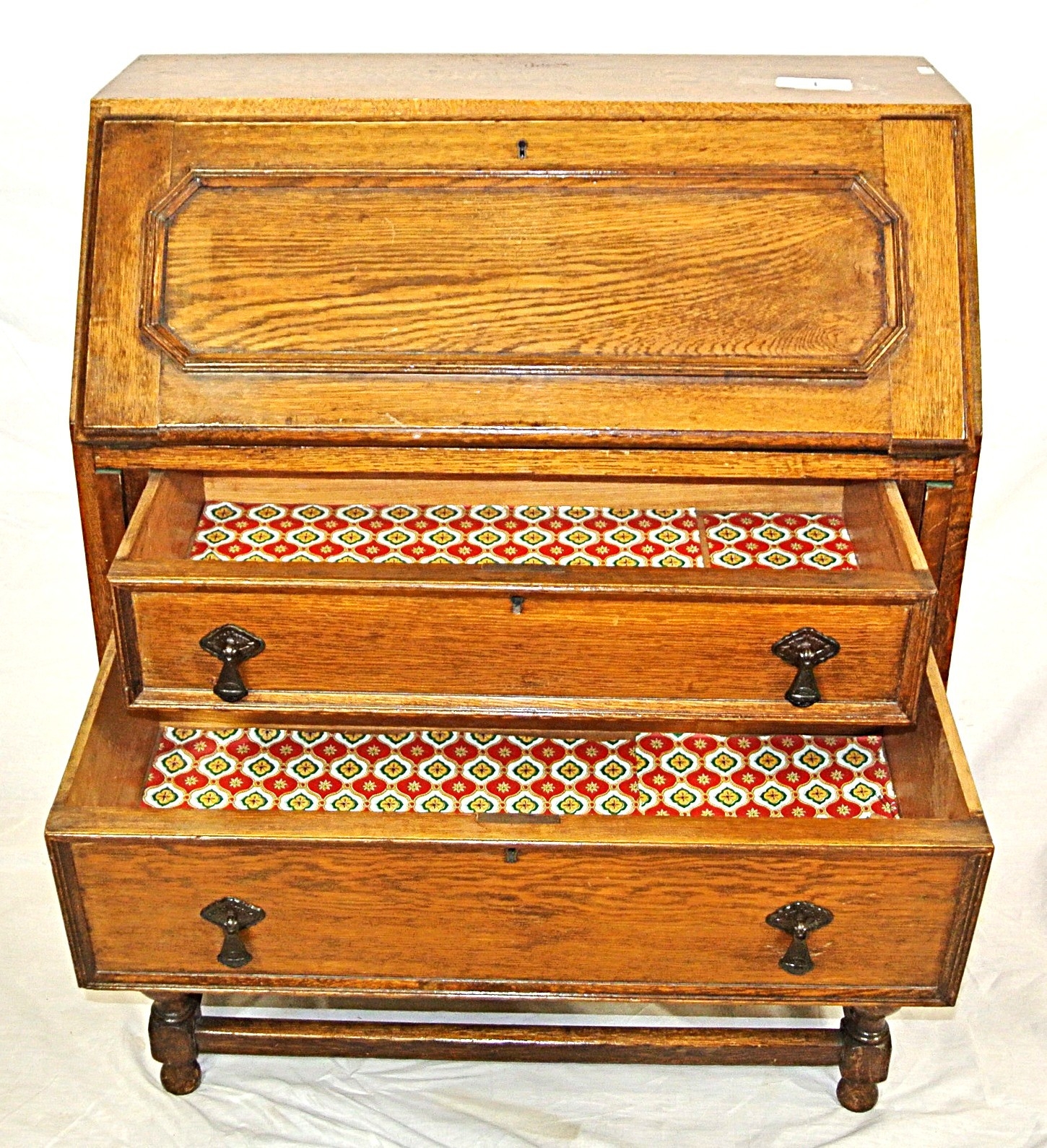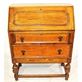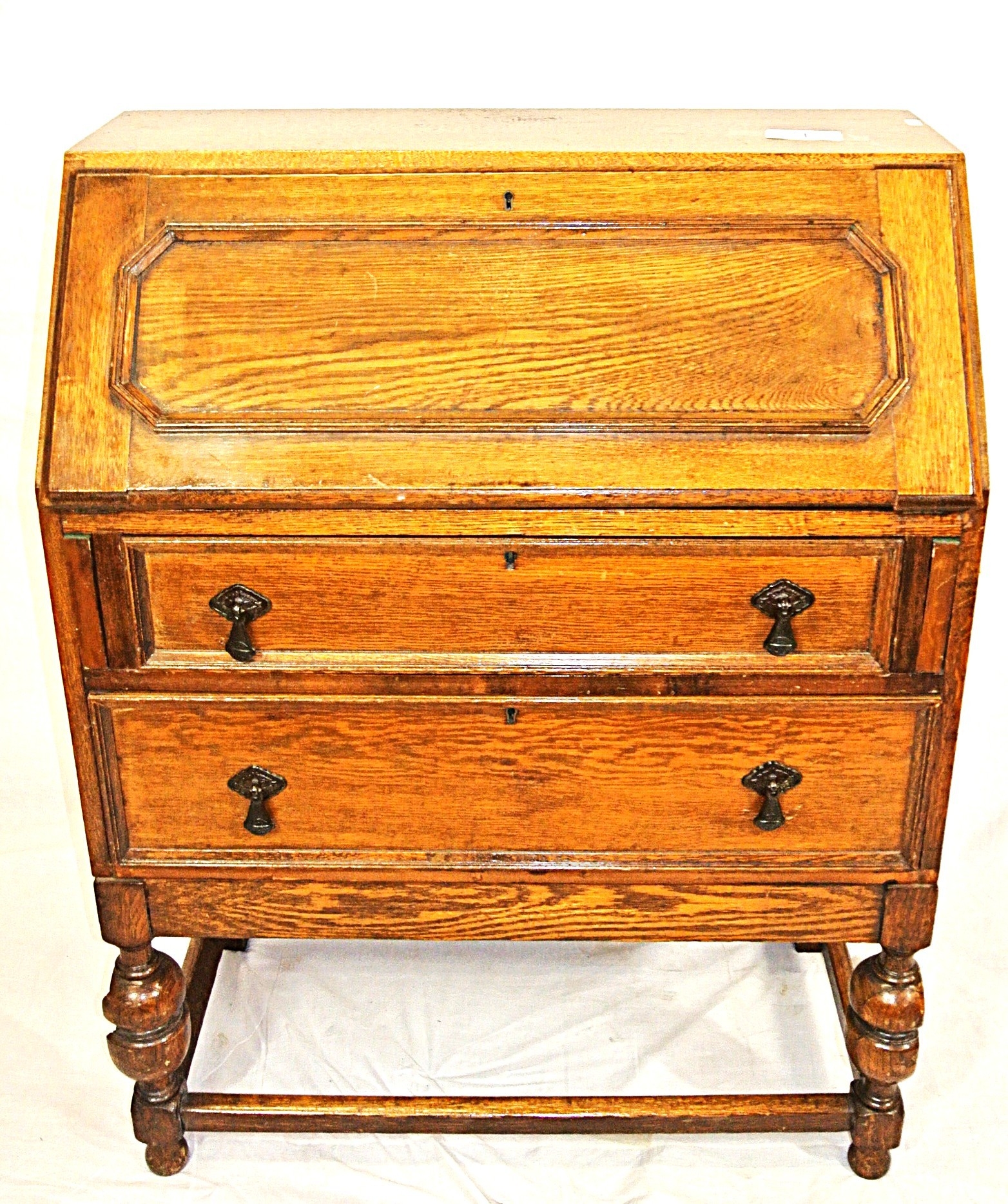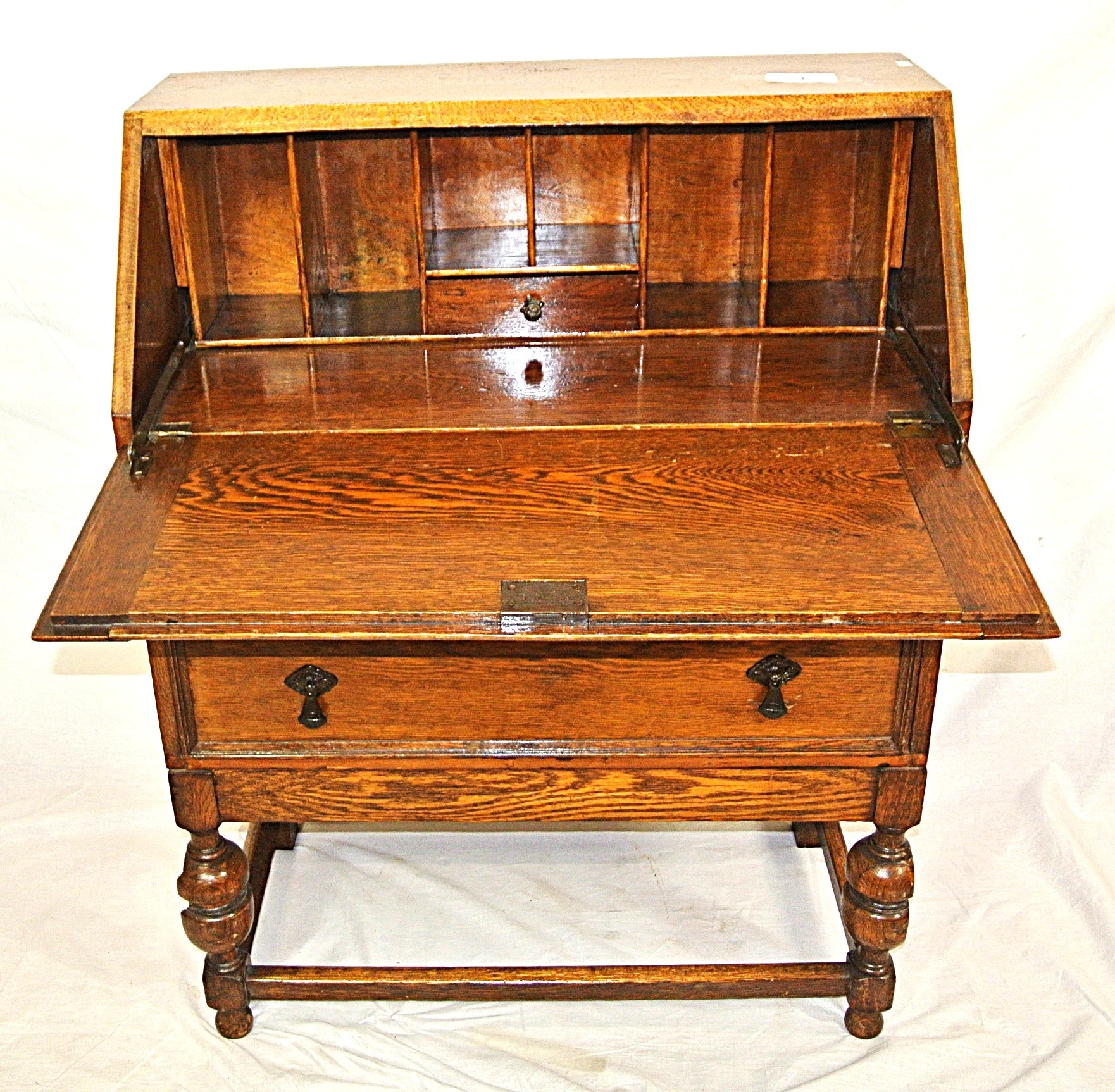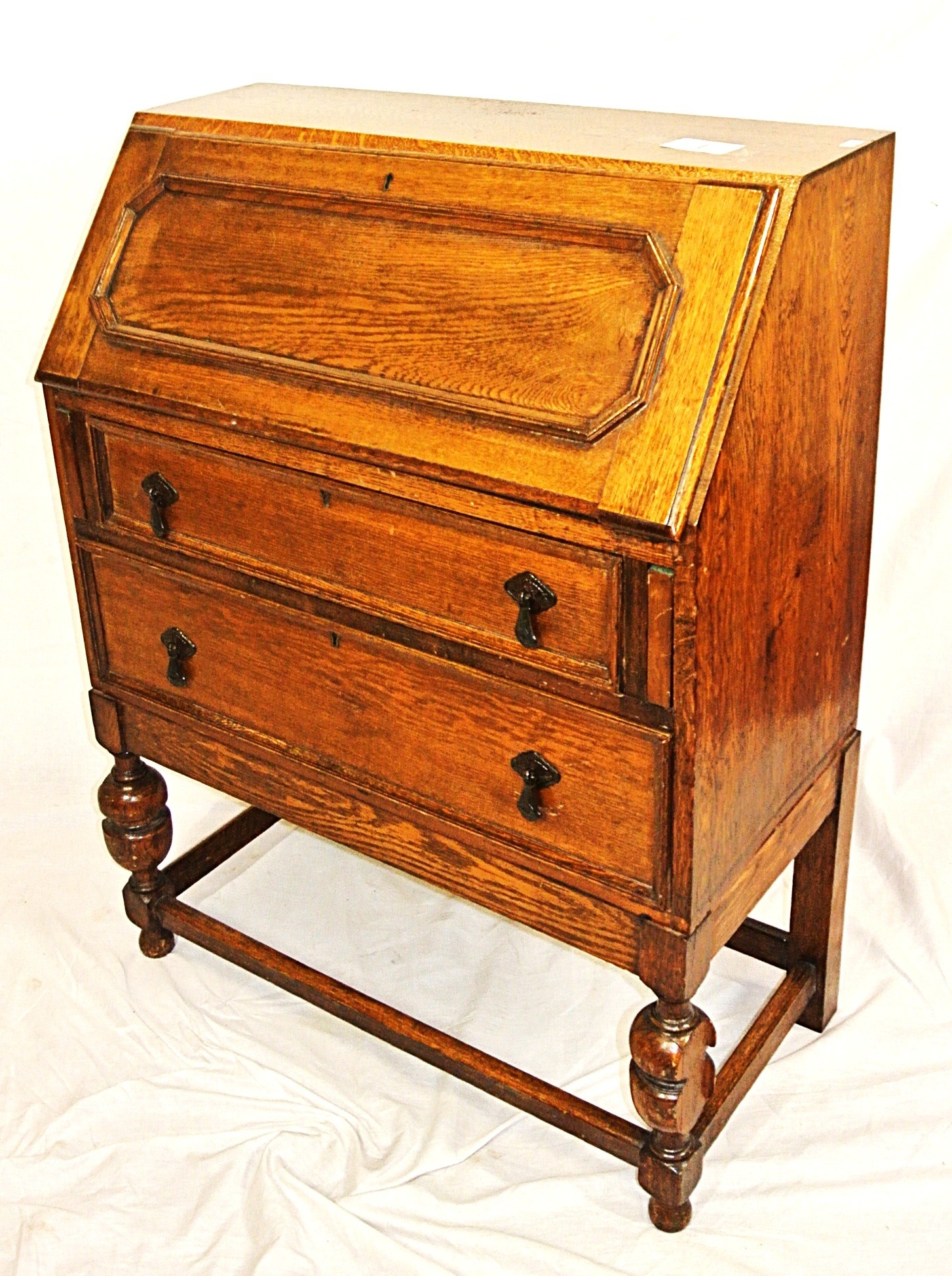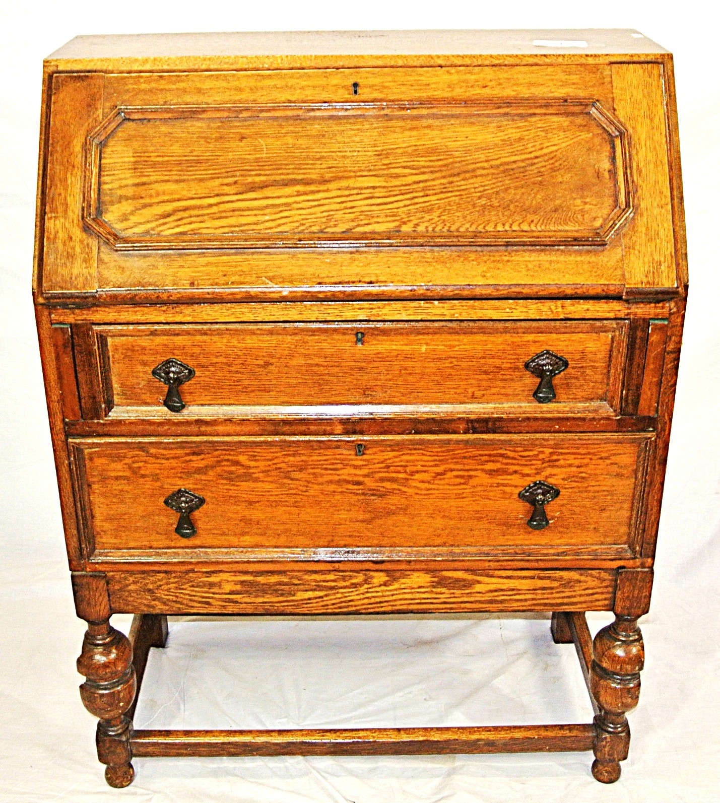 Edwardian style oak bureau with drop-down front, fitted interior, 2 drawers under with drop handles, on shaped legs with stretchers
