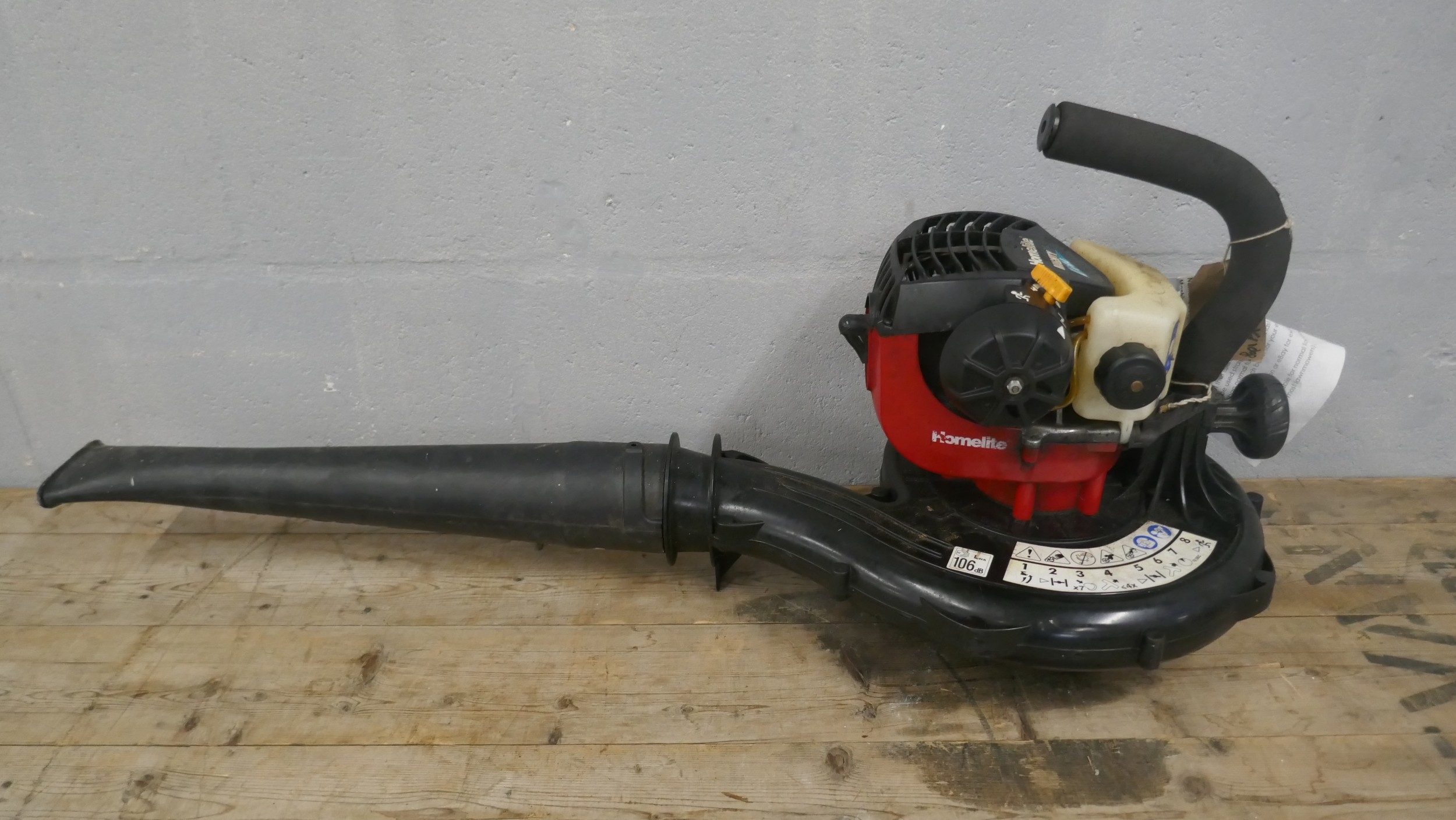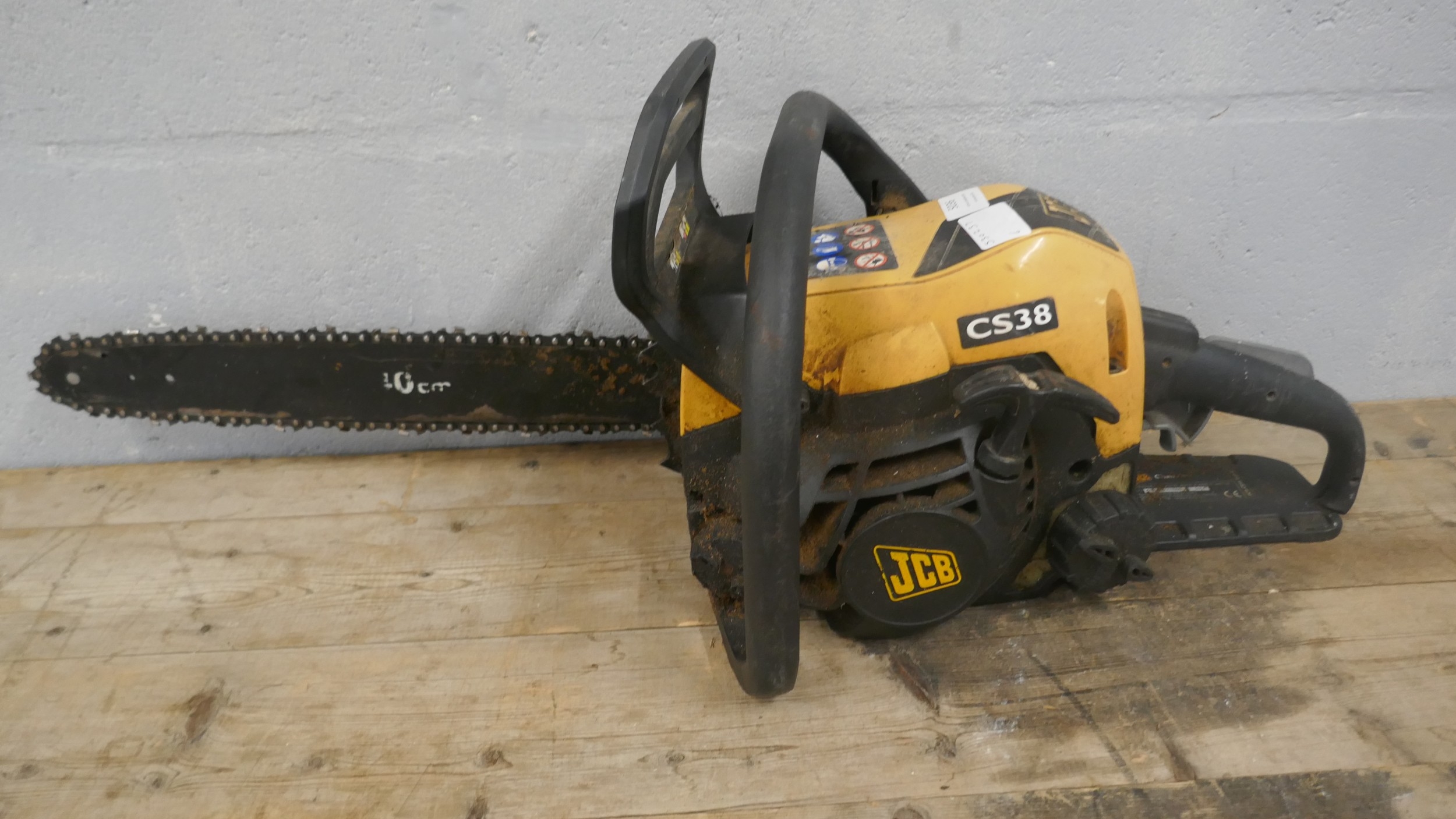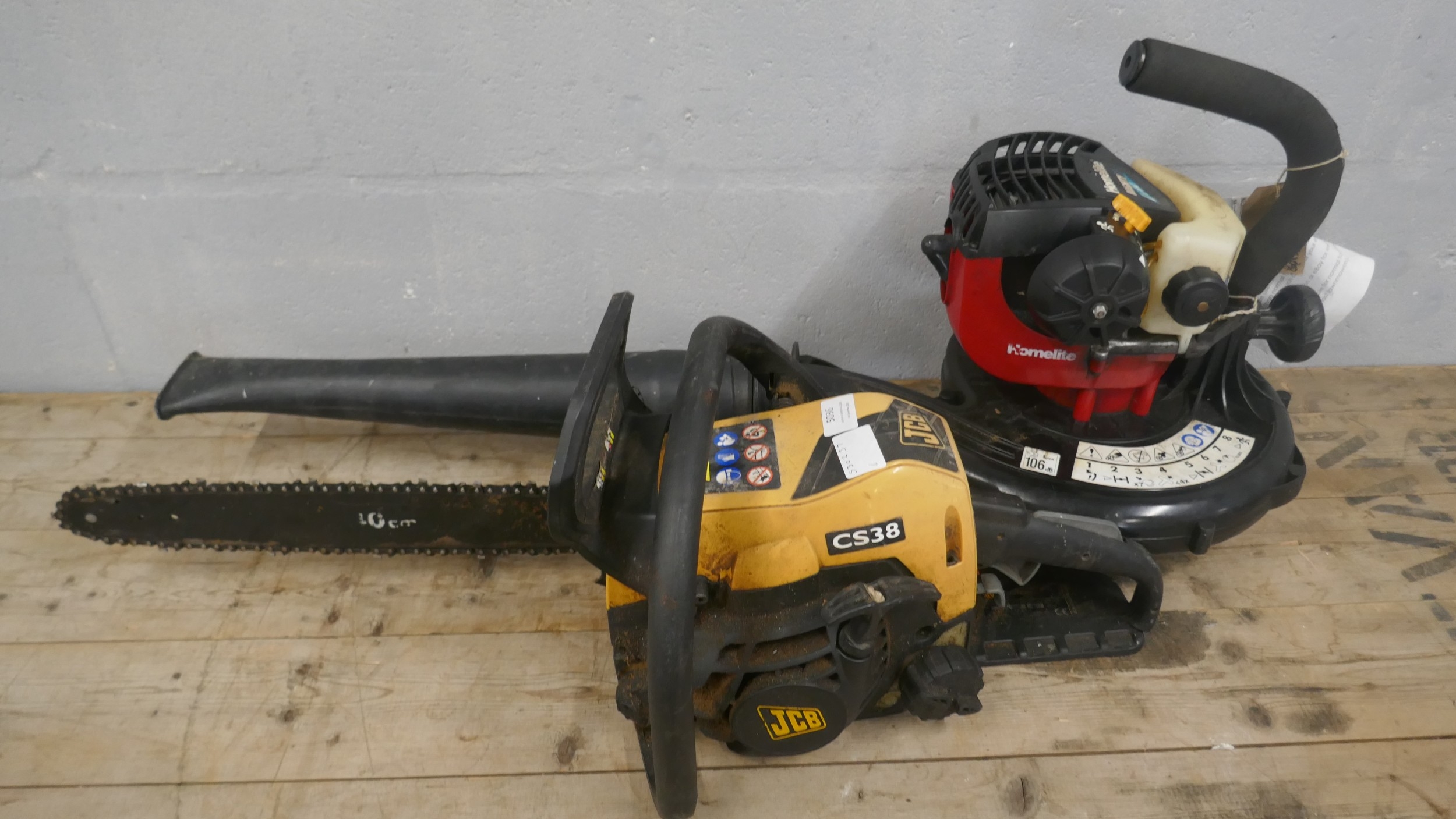A JCB CS38 petrol driven chainsaw and a Homelite Mighty-lite petrol driven leaf blower