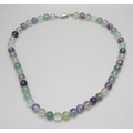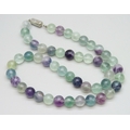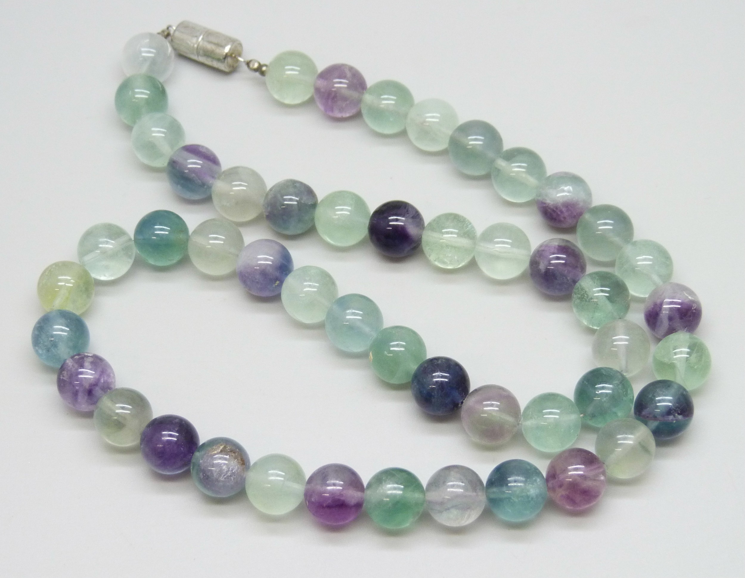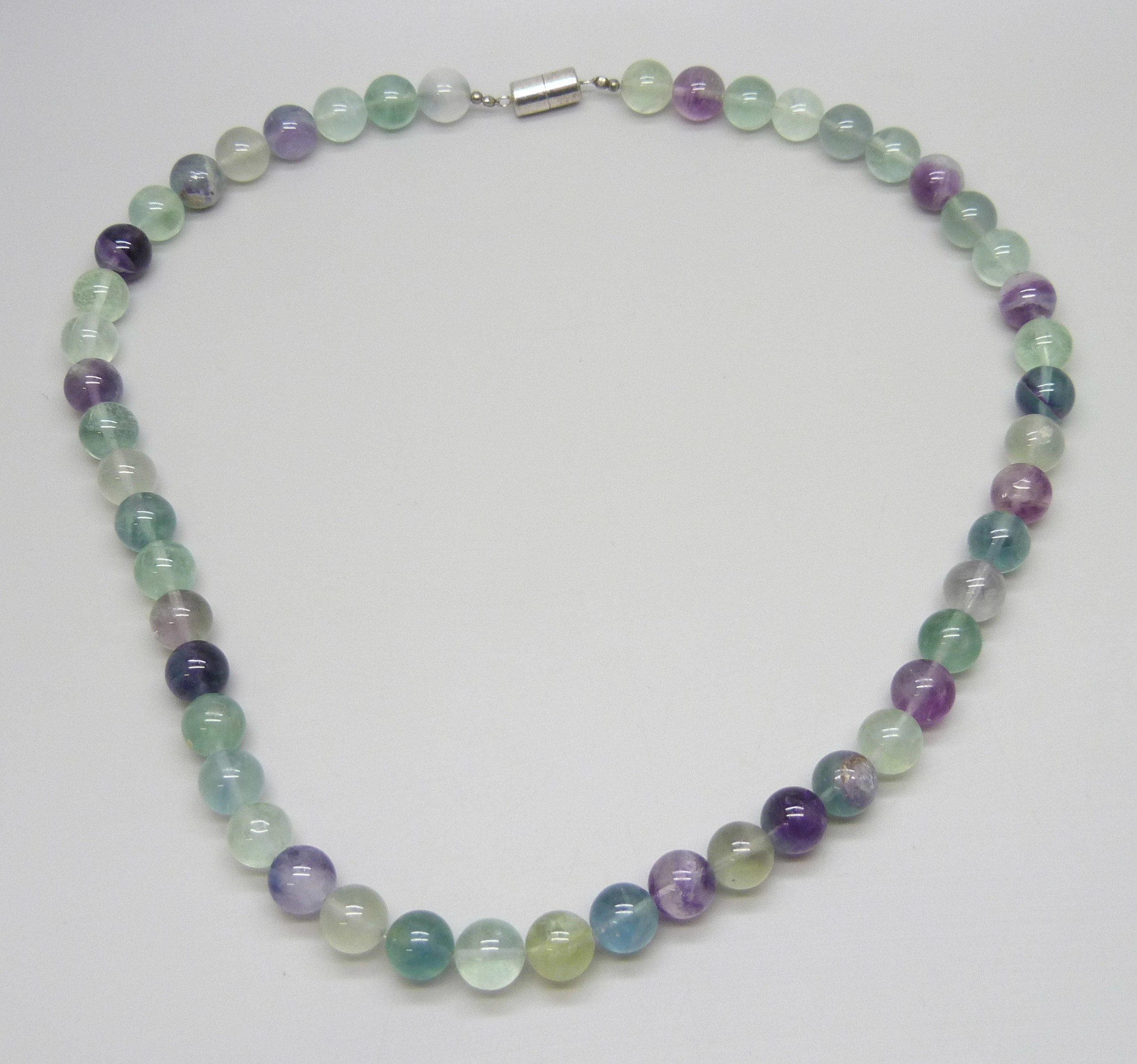 A fluorite gemstone necklace with a magnetic silver clasp, 90g, 52cm