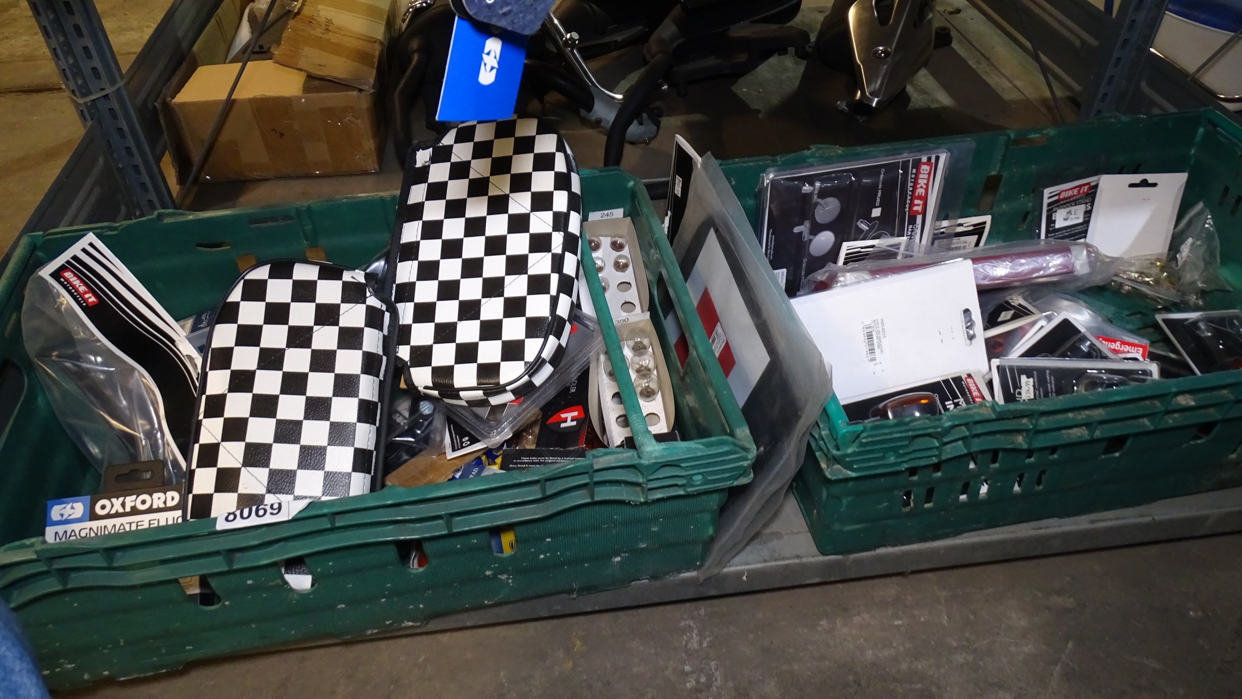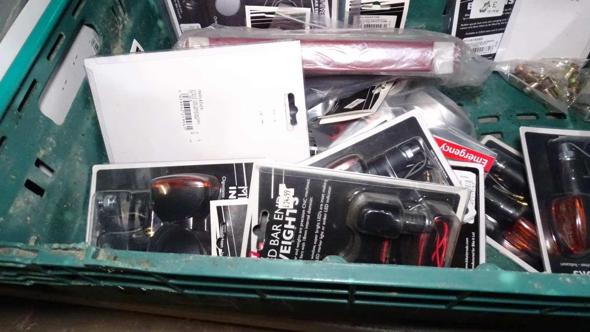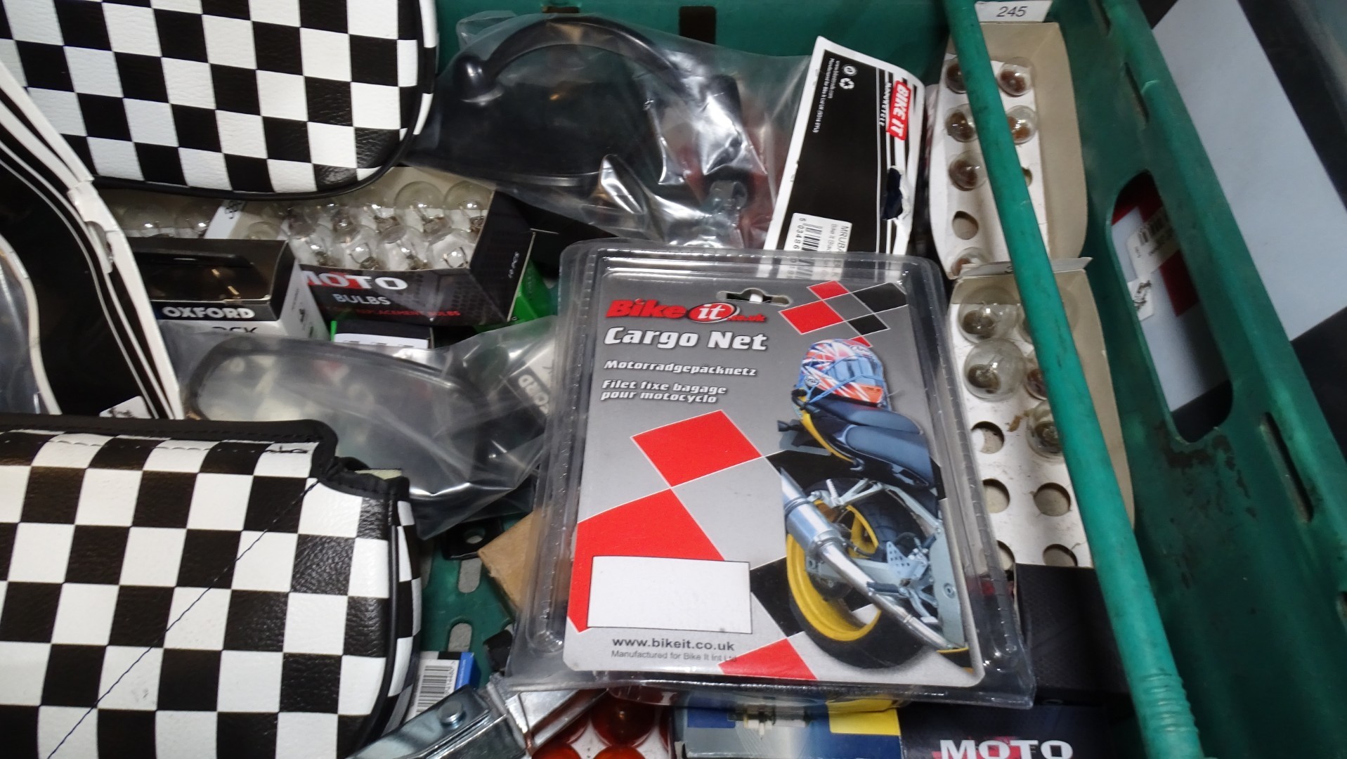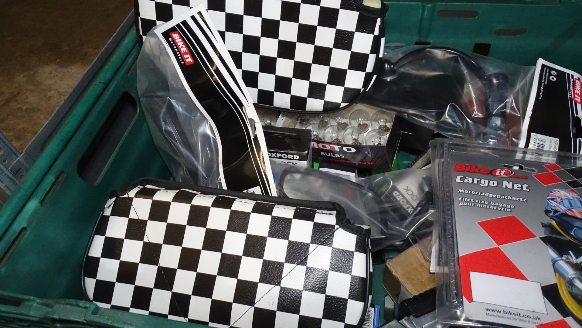 A quantity of various moped related items to include sissy bar pads, bulbs and indicators etc - Contents of 2 crates that are not included