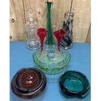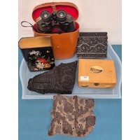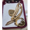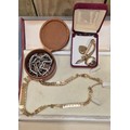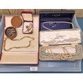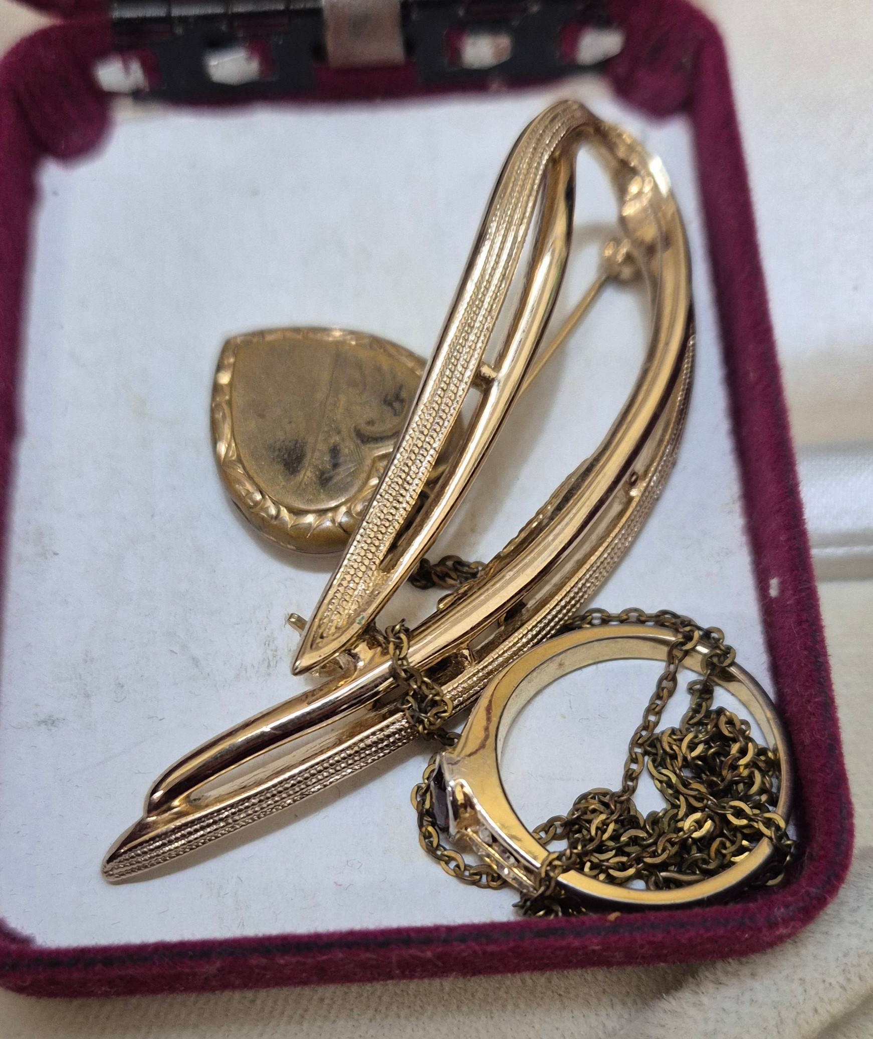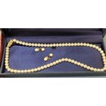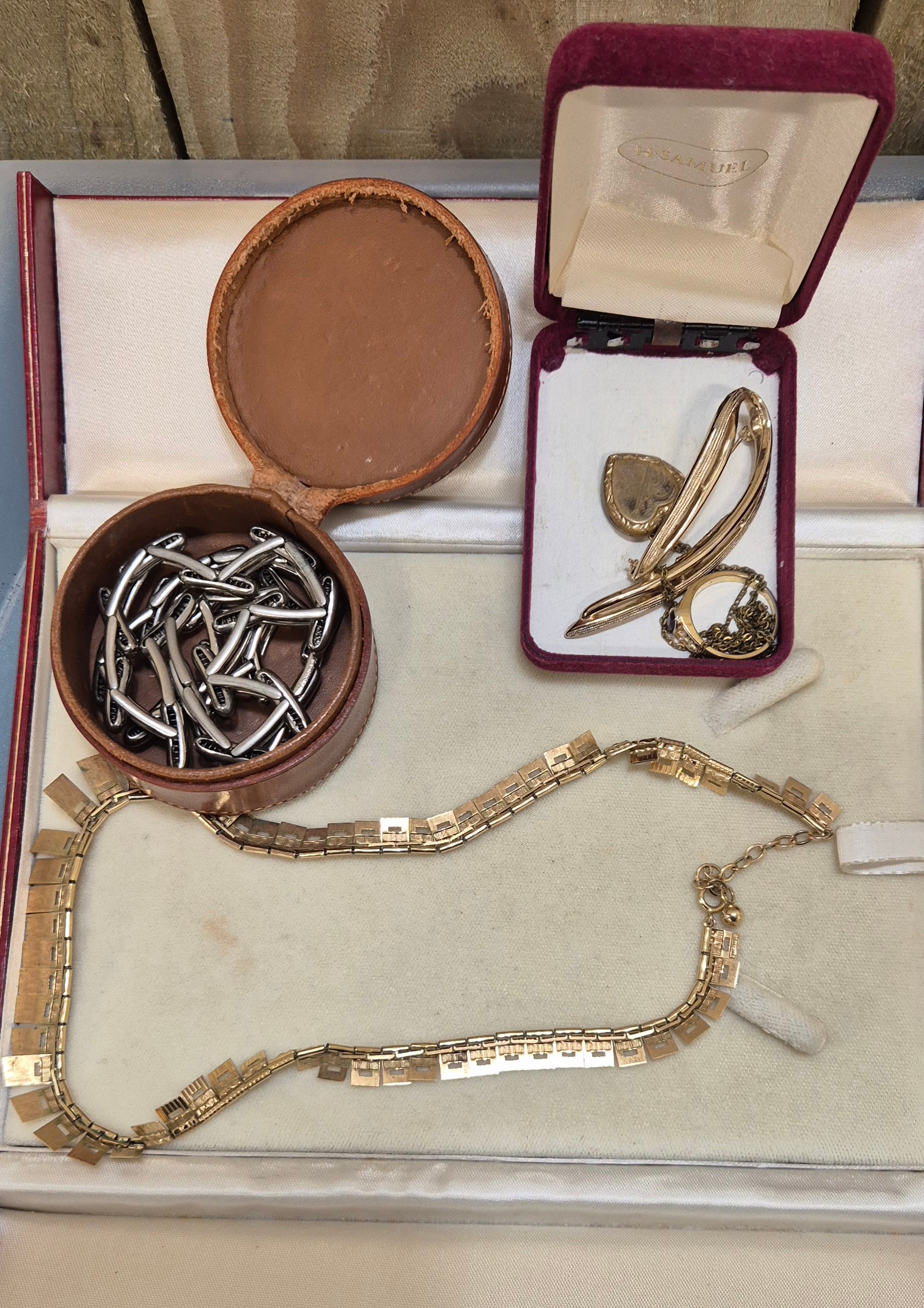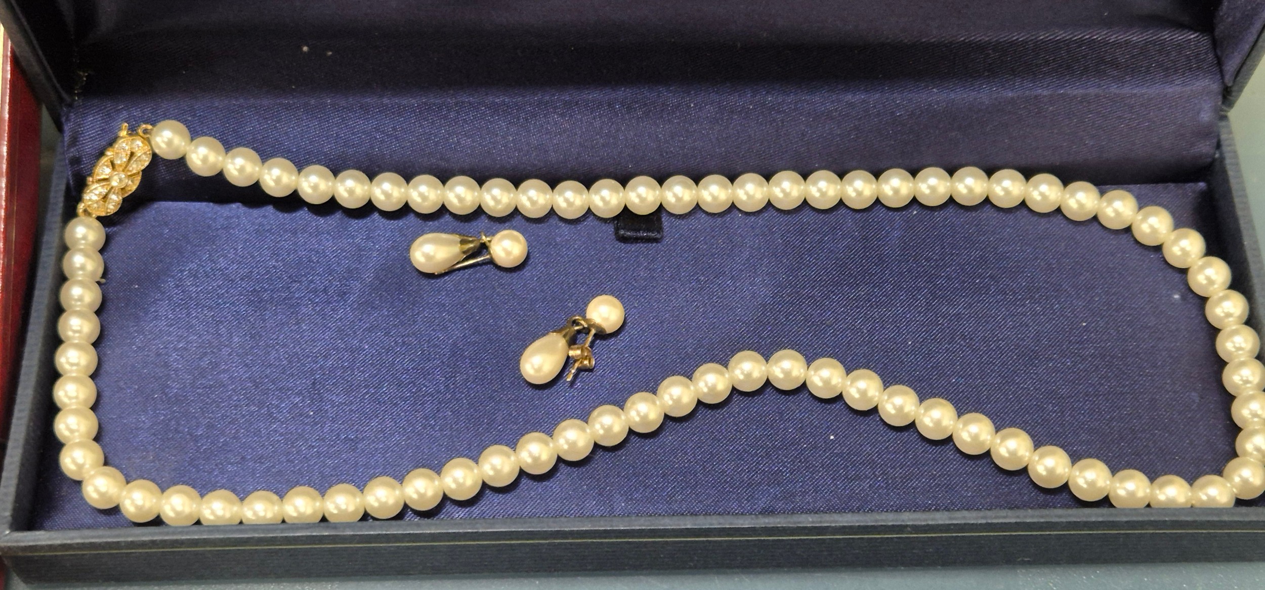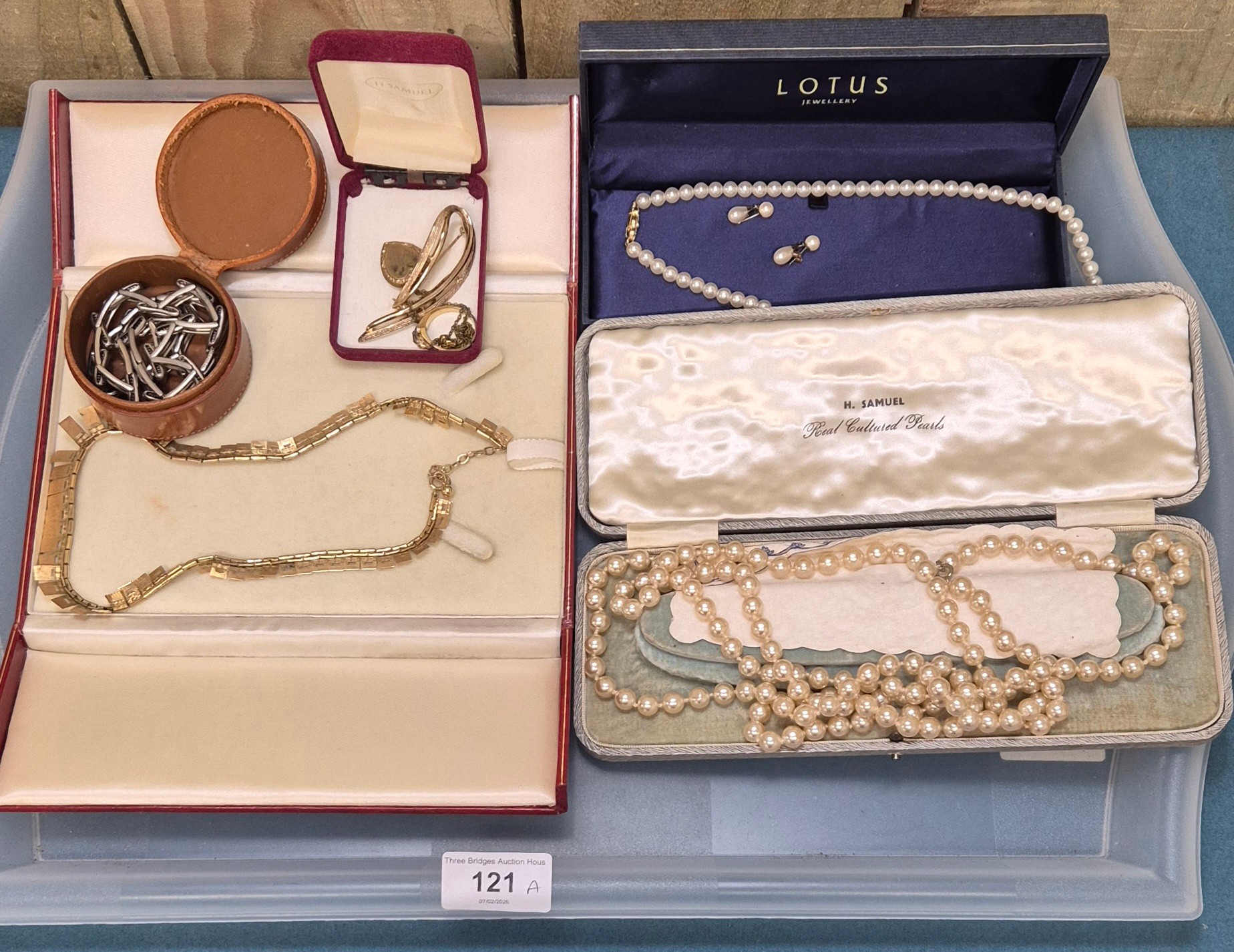 Tray of jewellery; 9ct yellow gold and pearl earrings. Two sets of faux pearls. West German gold tone gilt necklace. Brooch, ring and other items.