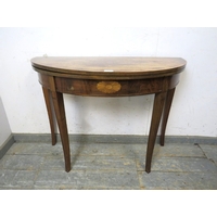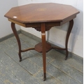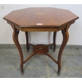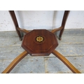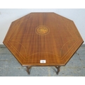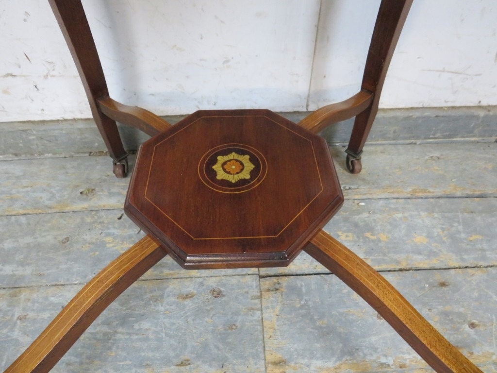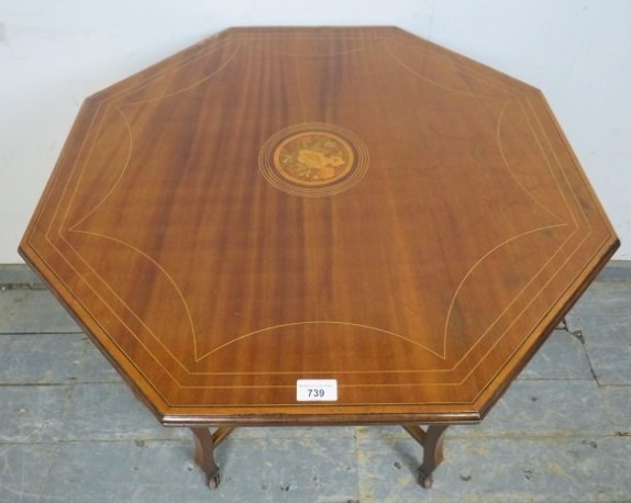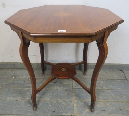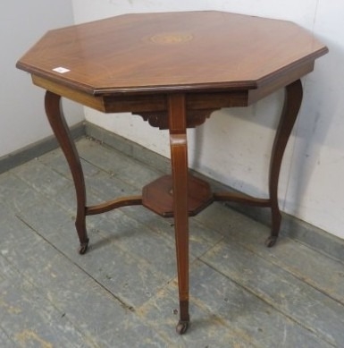 An antique mahogany side or occasional table having an octagonal marquetry inlaid top raised on flat cabriole supports on castors united by an undertier. H.72xDia.78cm approx.