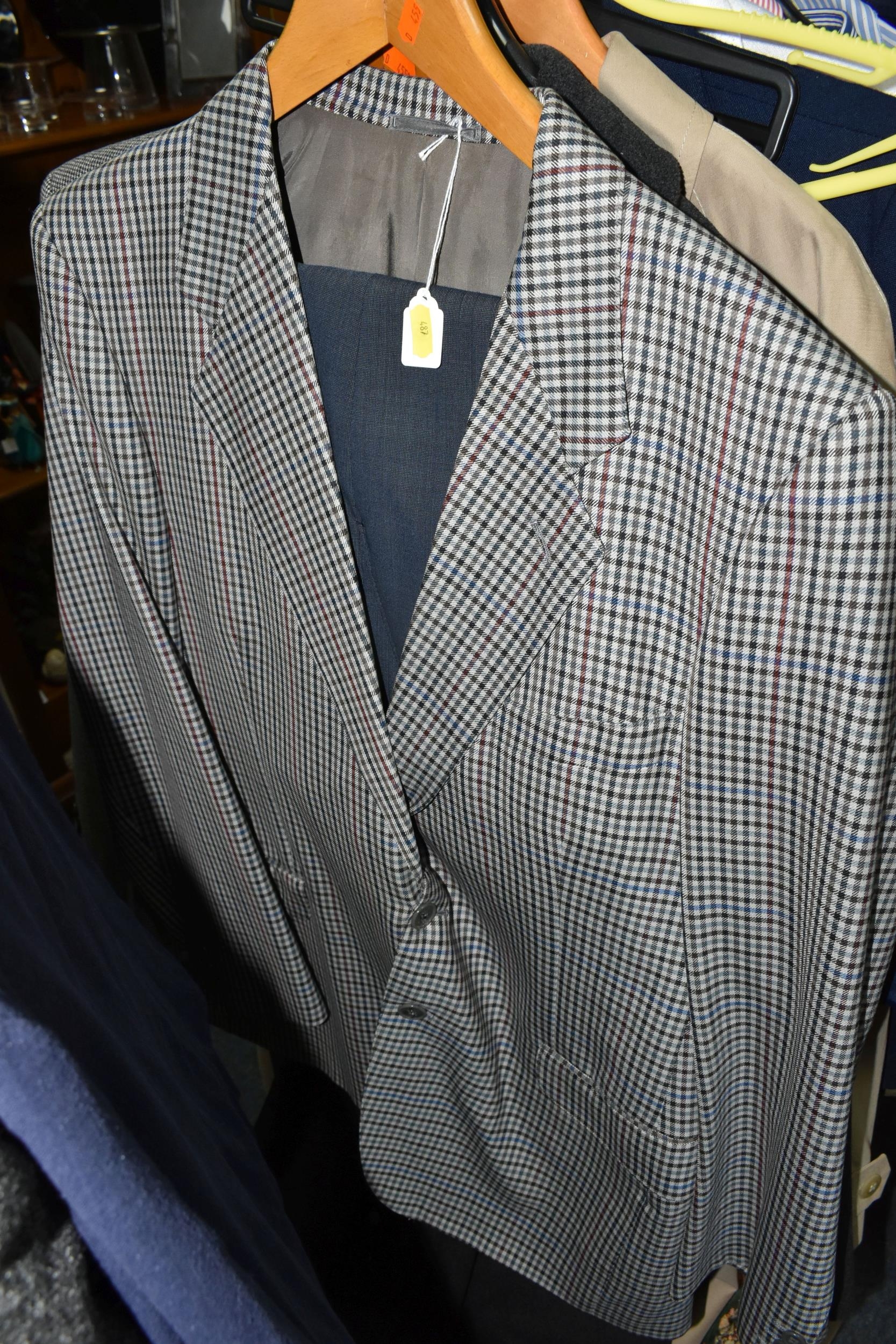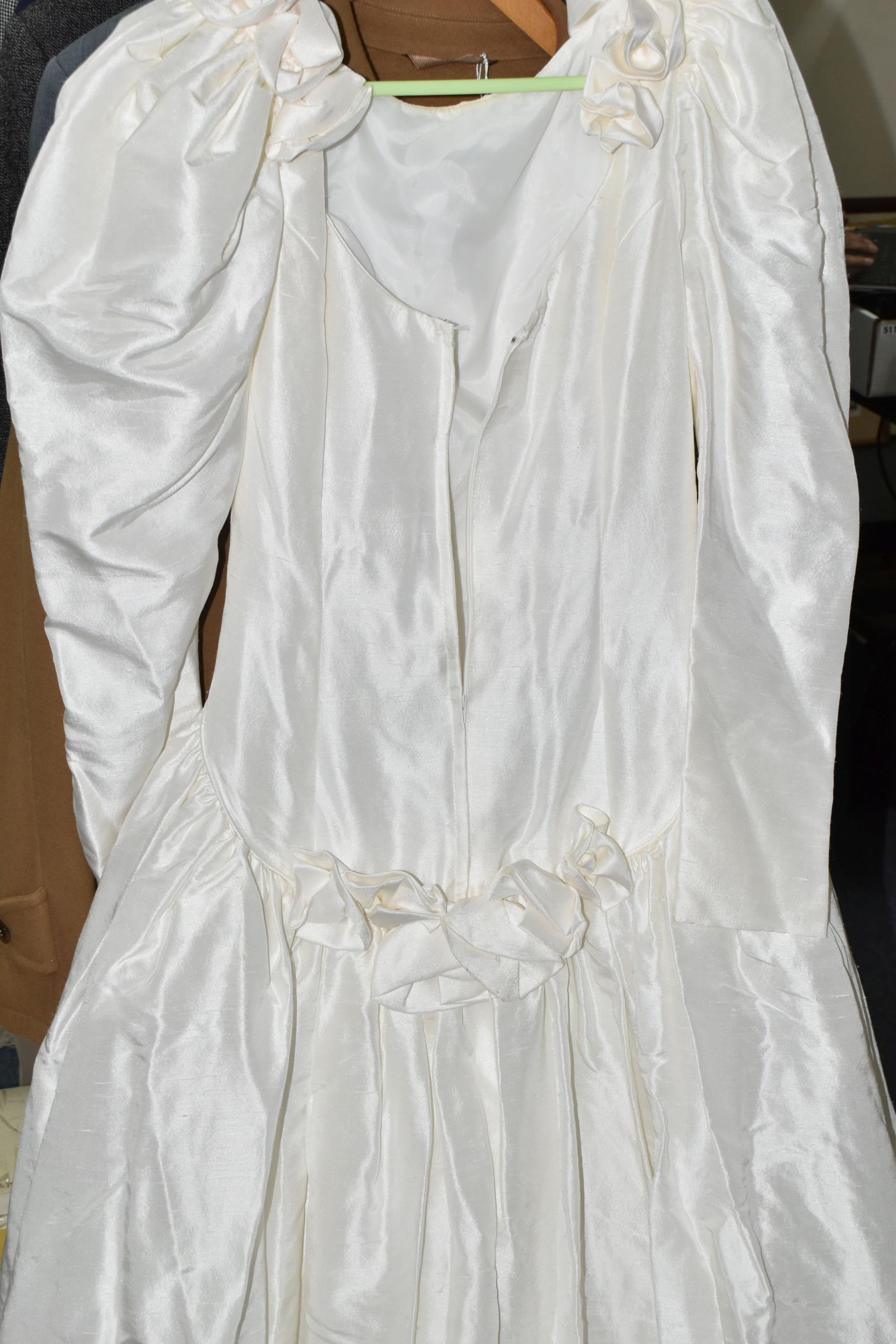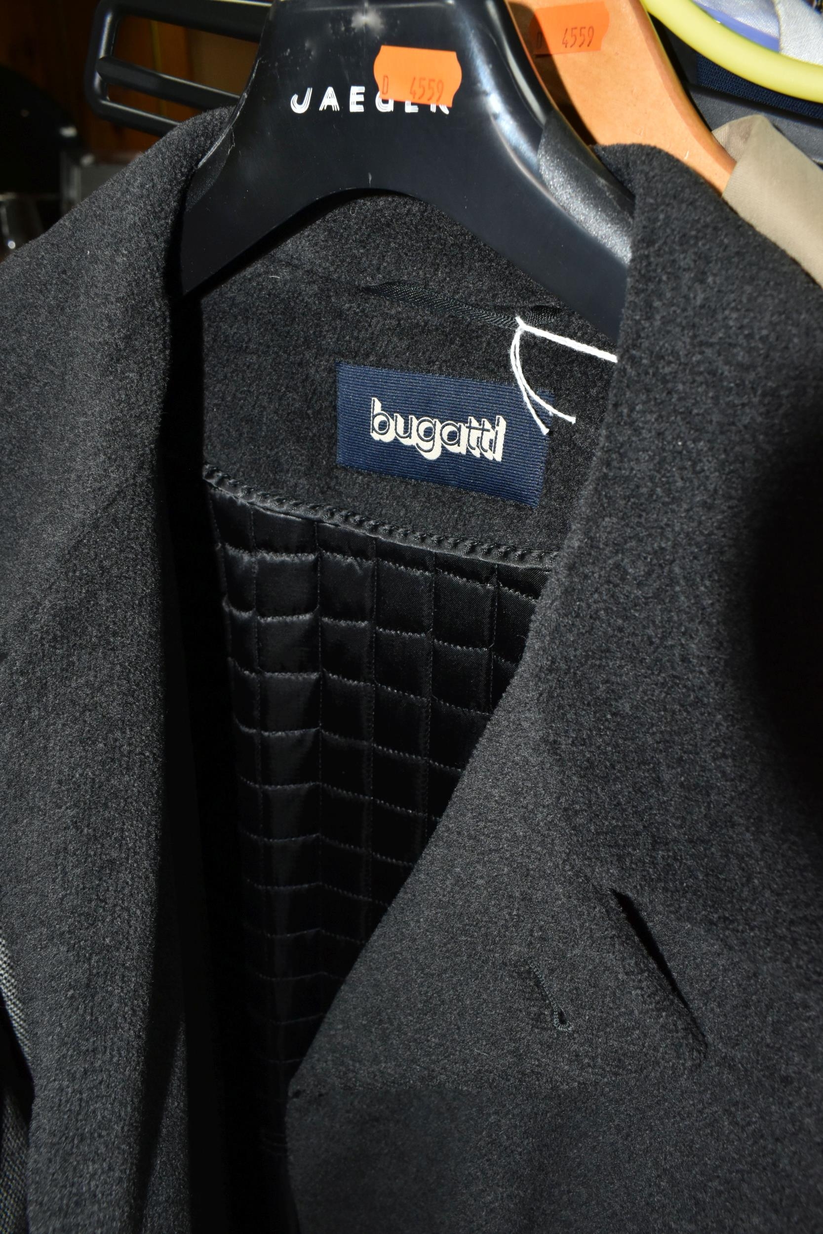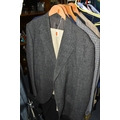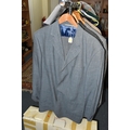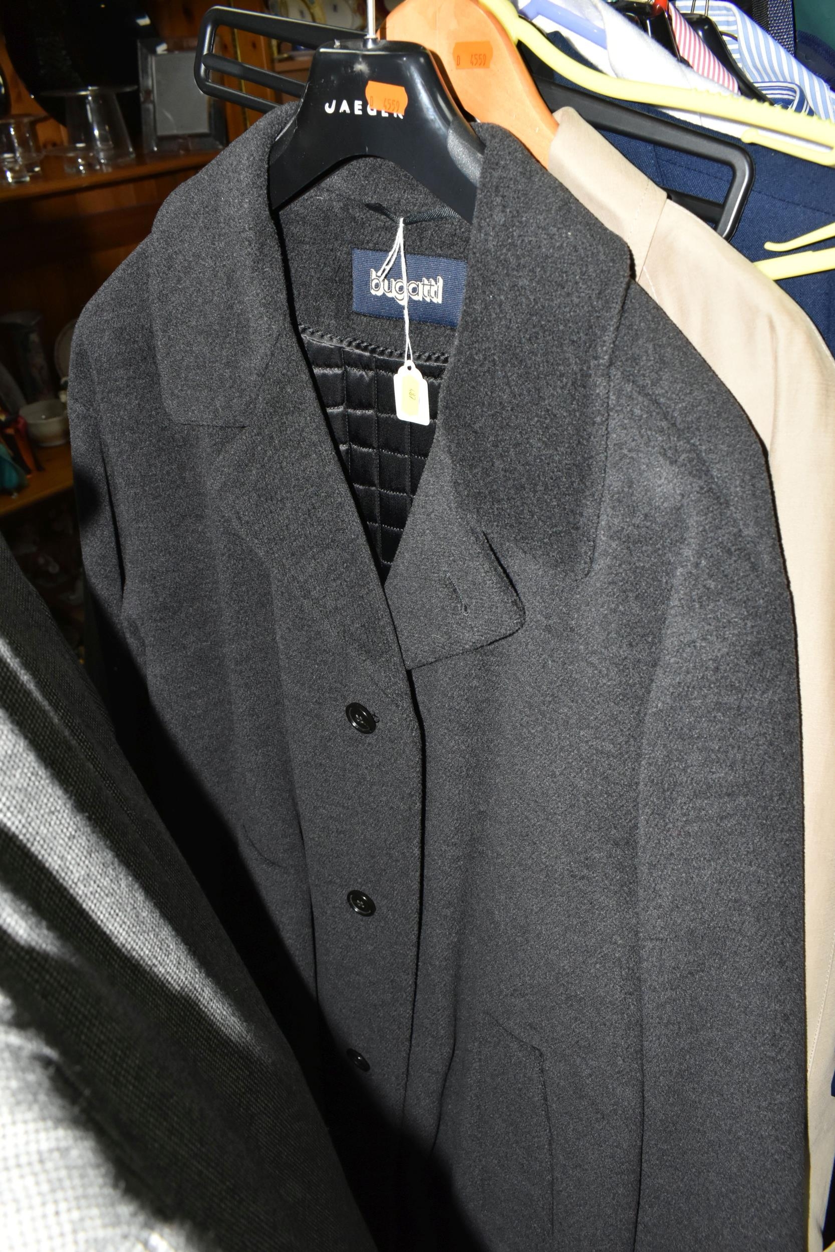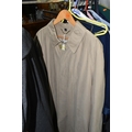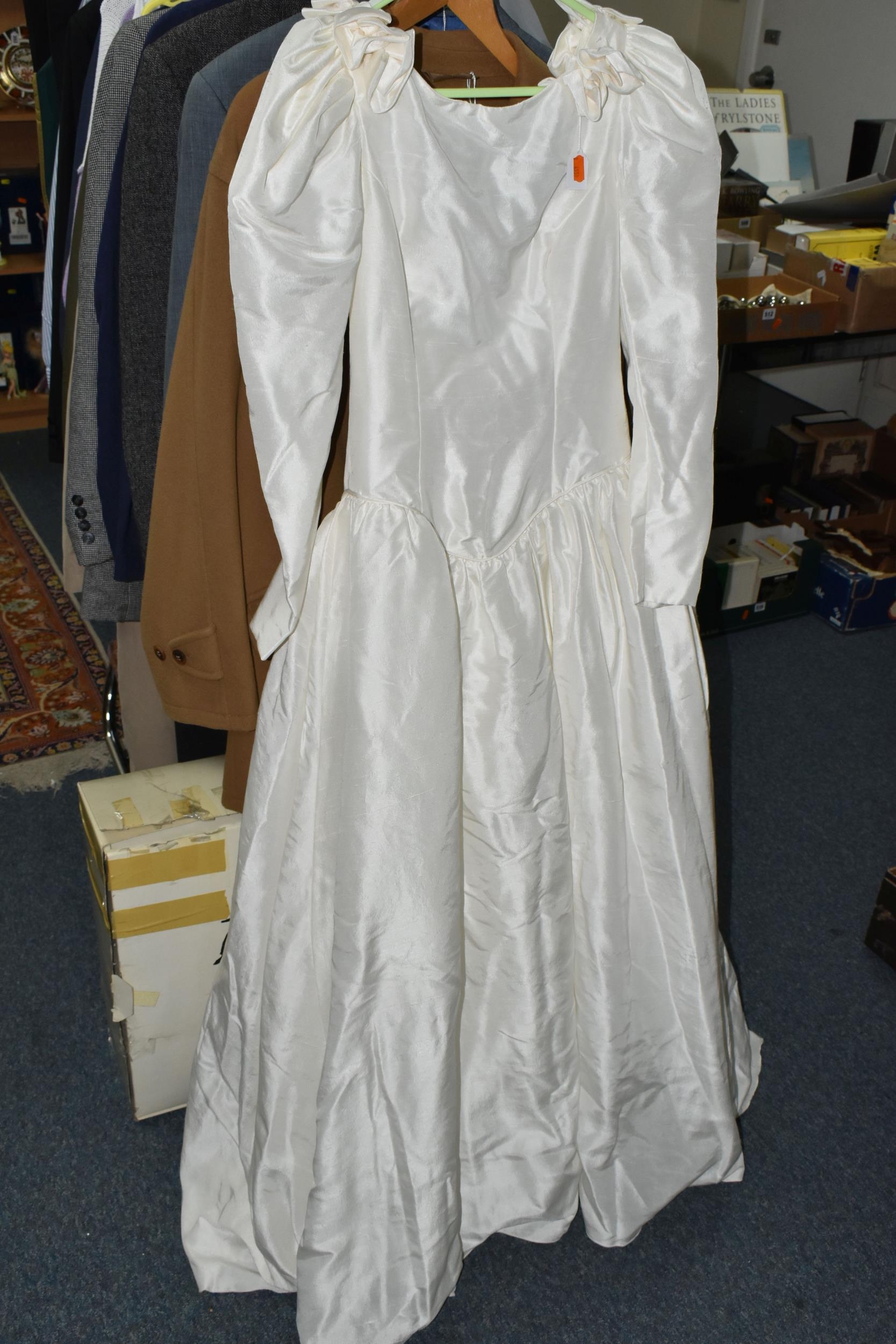 A SMALL QUANTITY OF LADIES AND GENTS CLOTHING ETC, comprising a Berketex size 10 wedding dress, Eres cashmere blend ladies coat approximate size 14/16, men's clothing includes a grey Crombie jacket -42, Rohan blue linen jacket - 44, Jaeger checked jacket - 54r, Jaeger houndstooth two piece suit - jacket 54r trousers 54r, Bugatti 95% wool coat - 40r, Rainman overcoat - 42r and four pairs of trouser, waist size 38, clothes appear to be in good condition